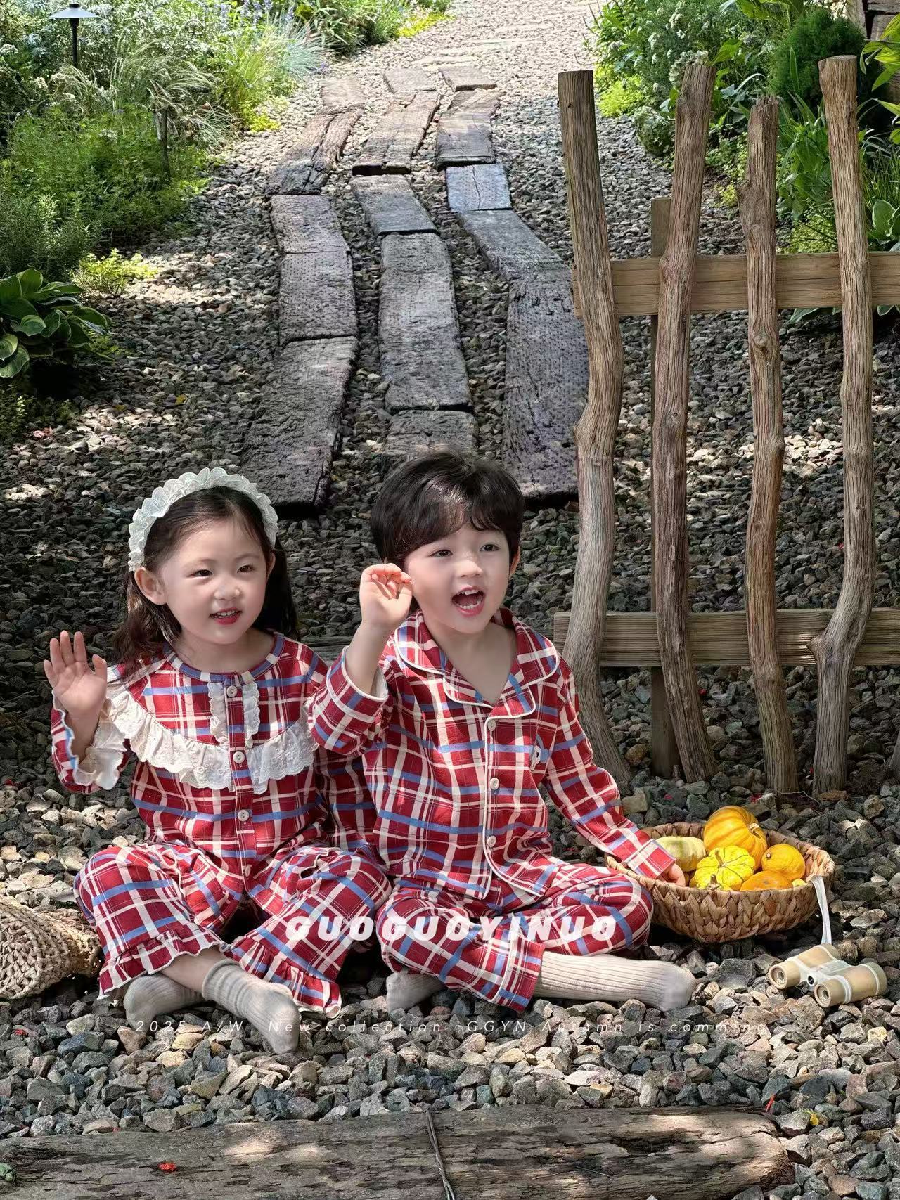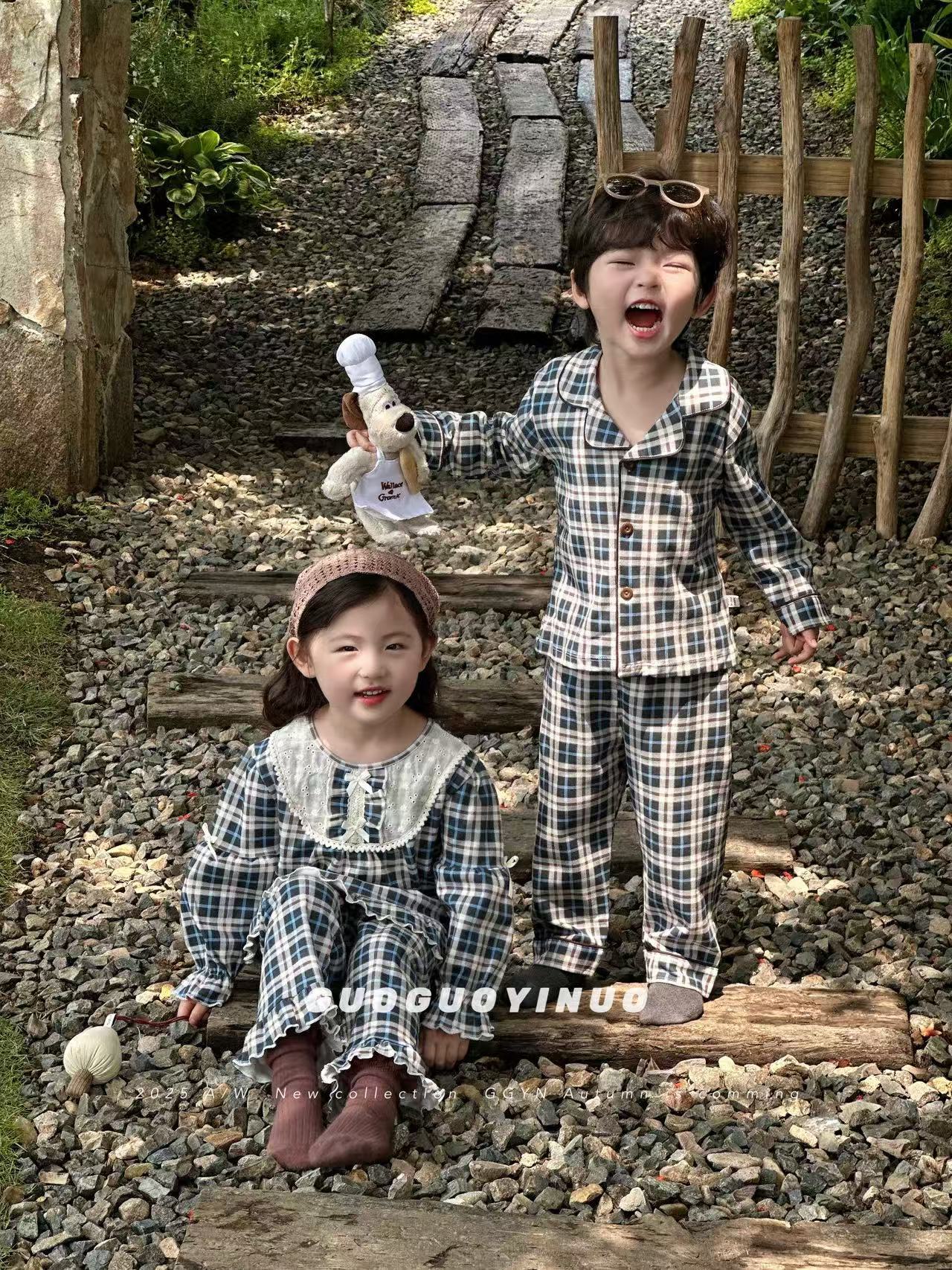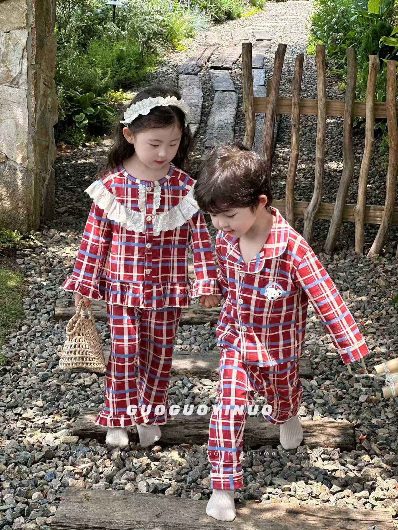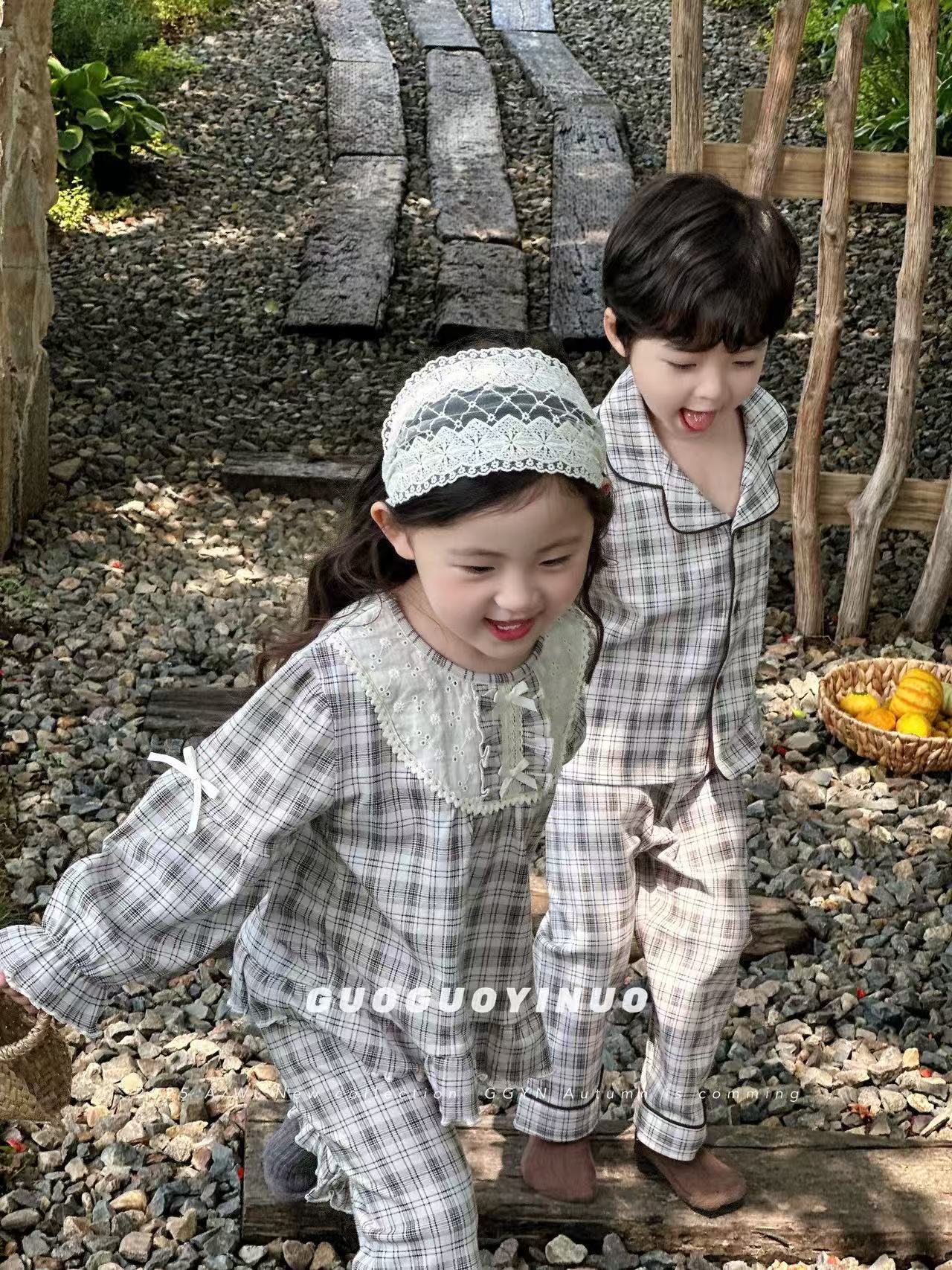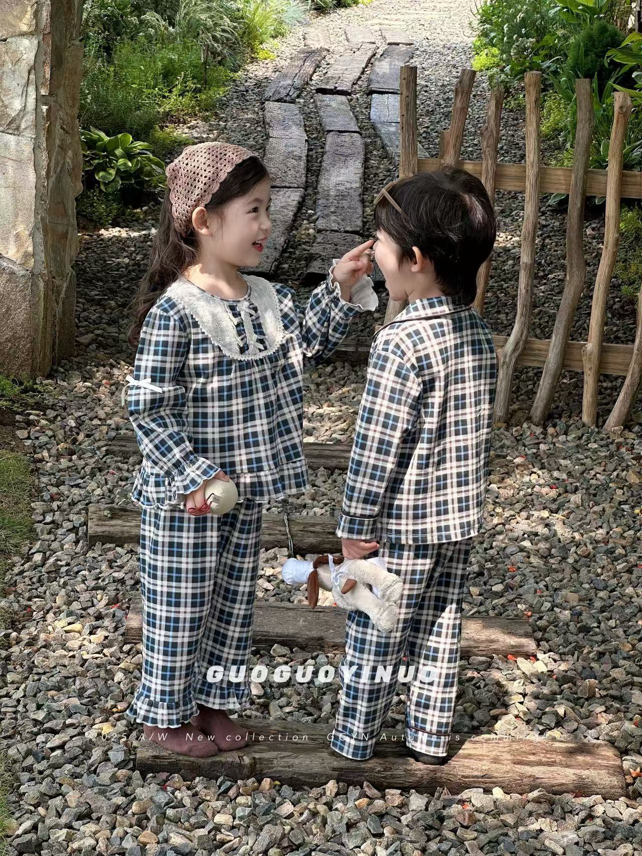 Guoguo YINUO 새로운 가을 잠옷 세트 면 형제 자매 가정복 카테고리 A 카디건 긴팔 격자 무늬 투피스 세트