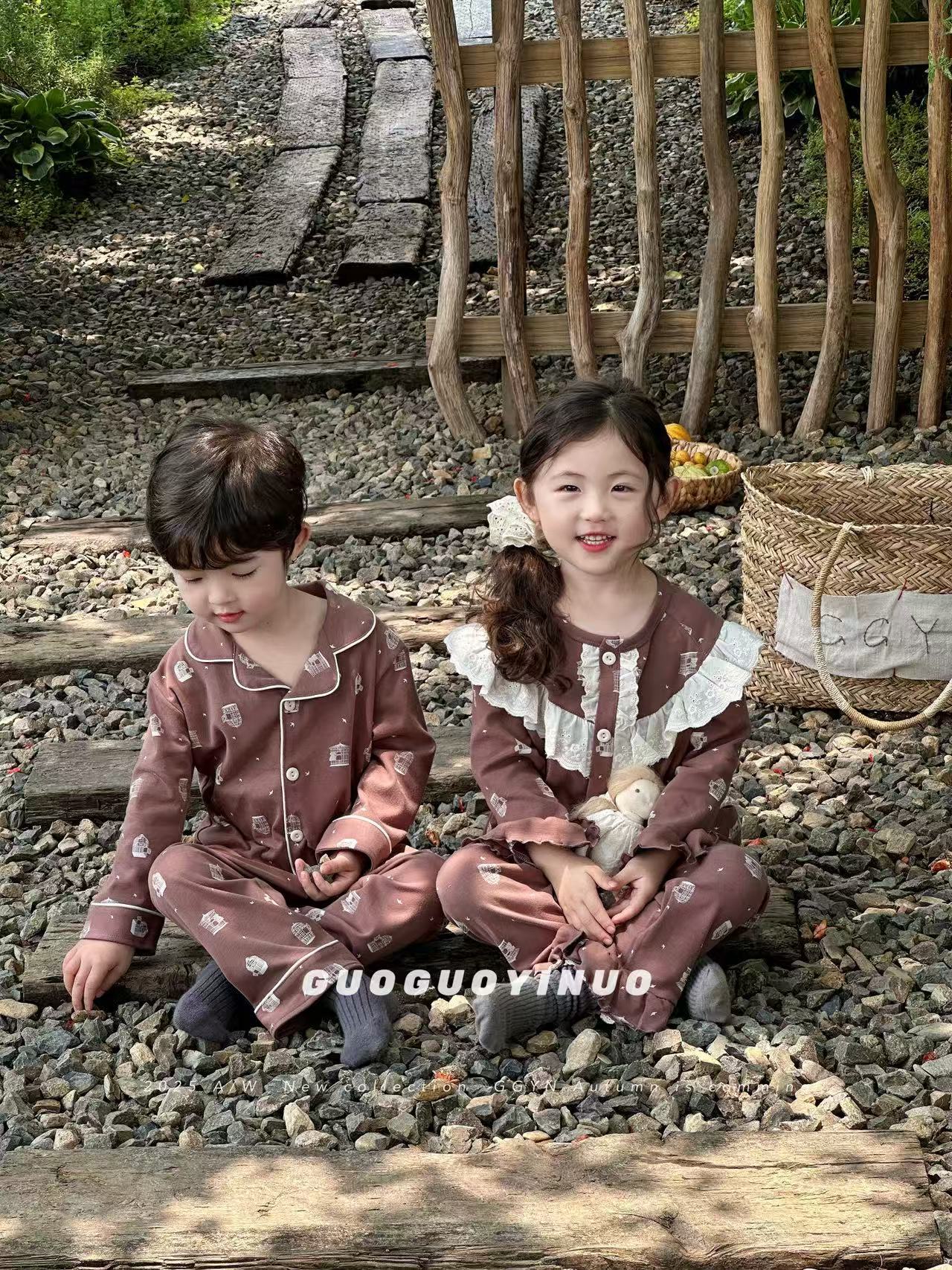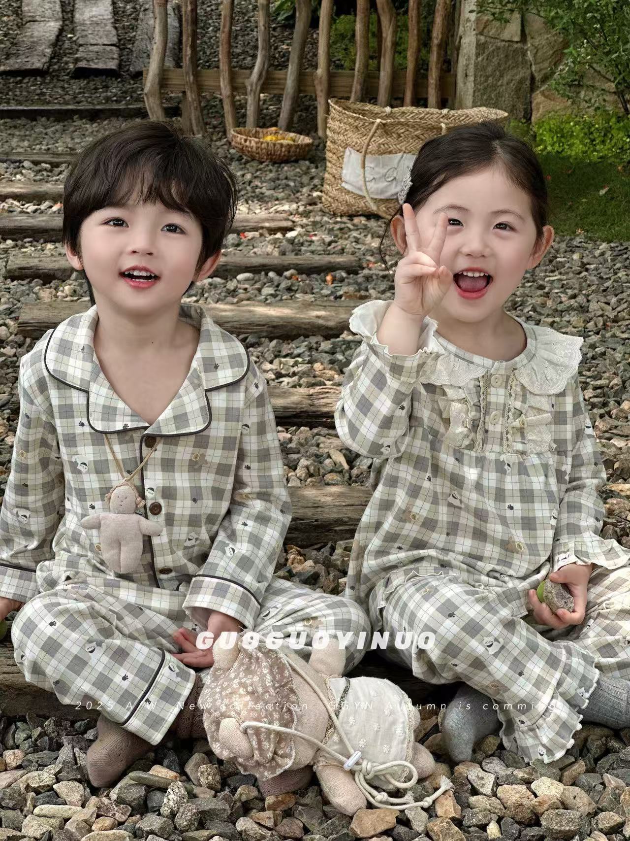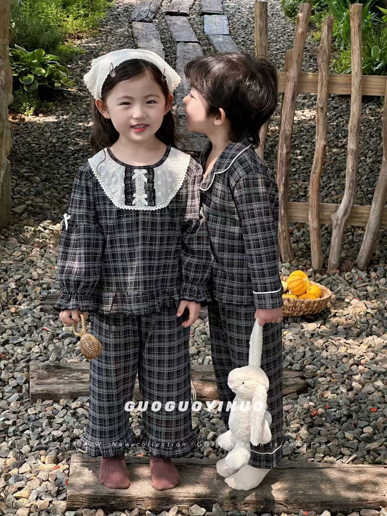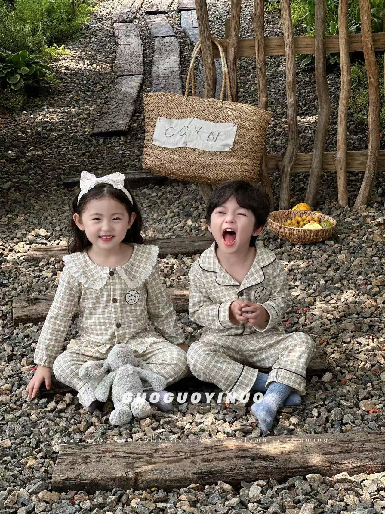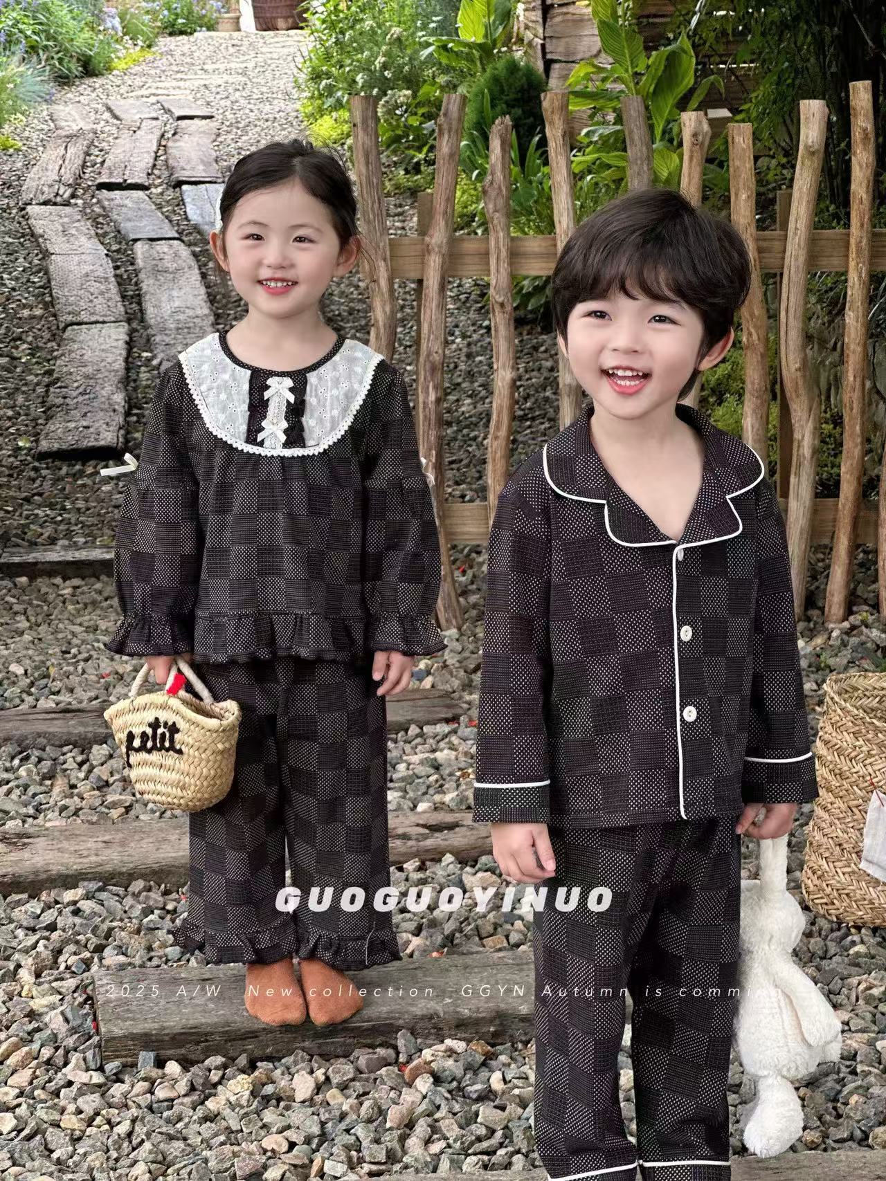 Guoguo YINUO 새로운 가을 잠옷 세트 면 형제 자매 가정복 카테고리 A 카디건 긴팔 격자 무늬 투피스 세트