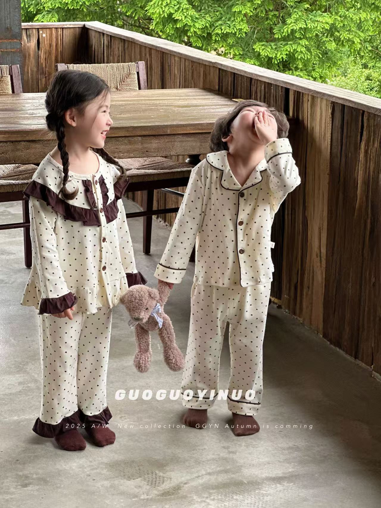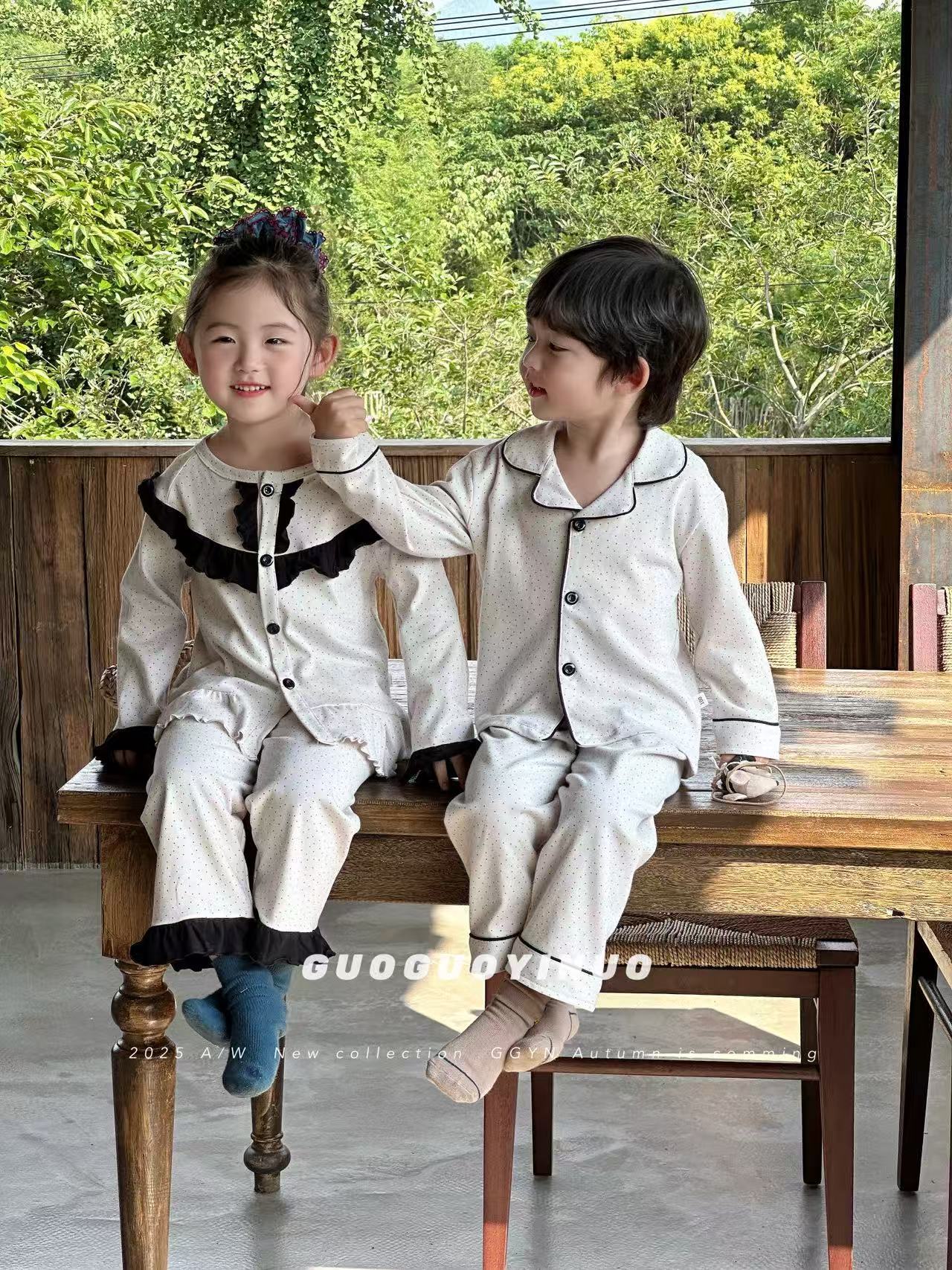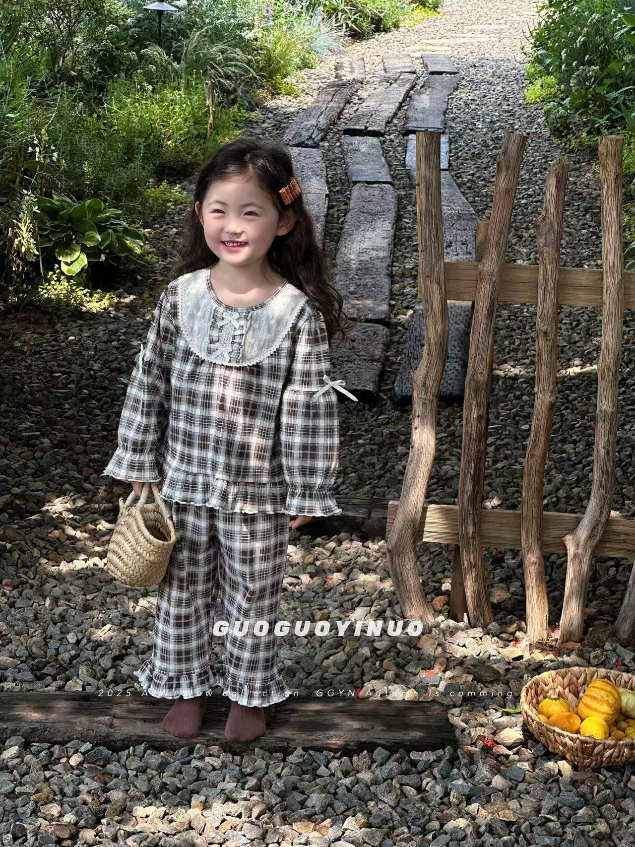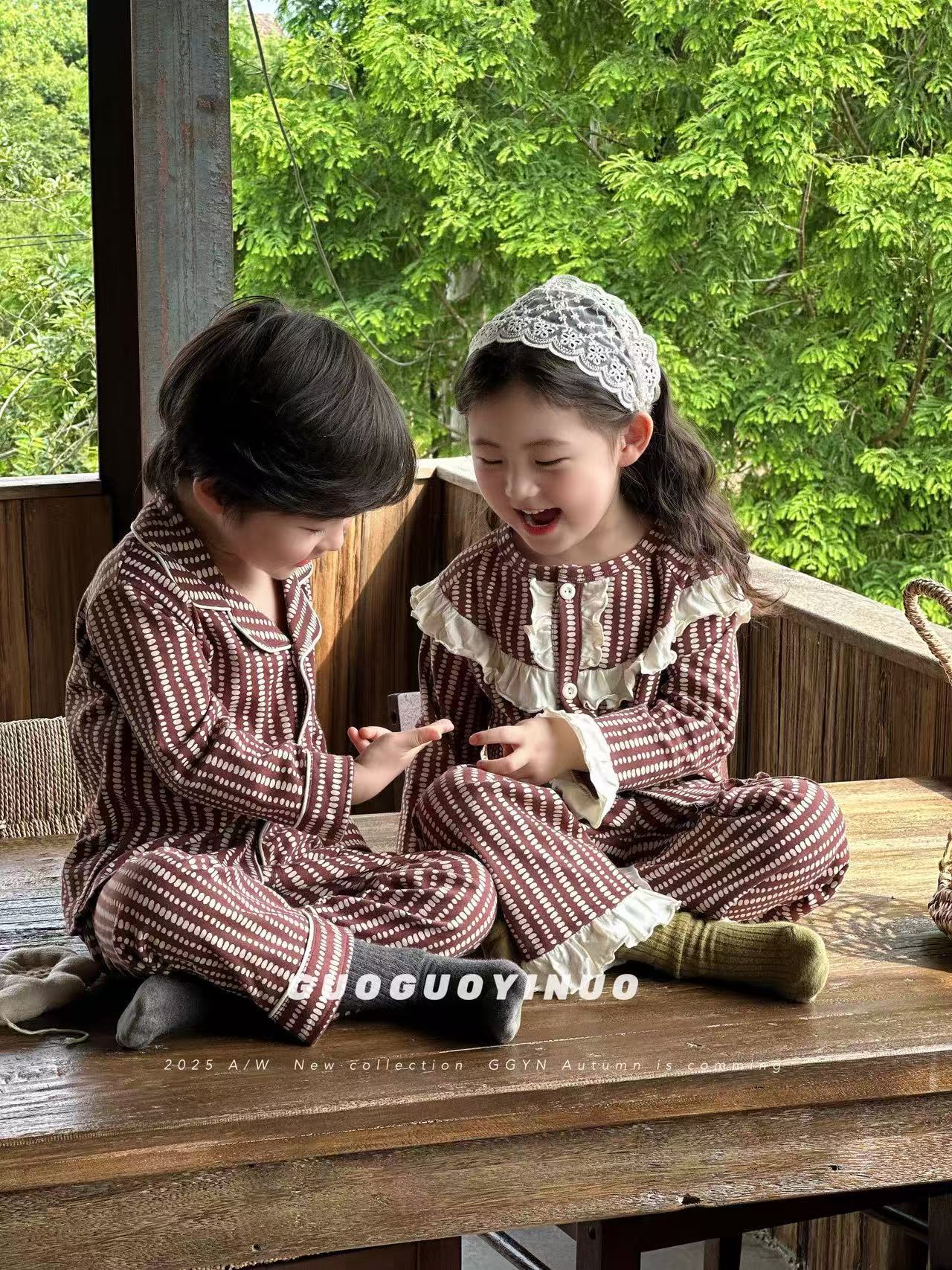 Guoguo YINUO 새로운 가을 잠옷 세트 면 형제 자매 가정복 카테고리 A 카디건 긴팔 격자 무늬 투피스 세트