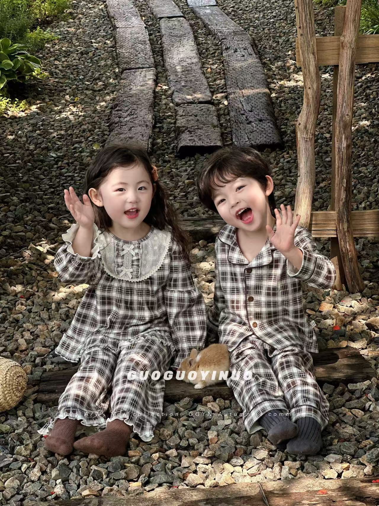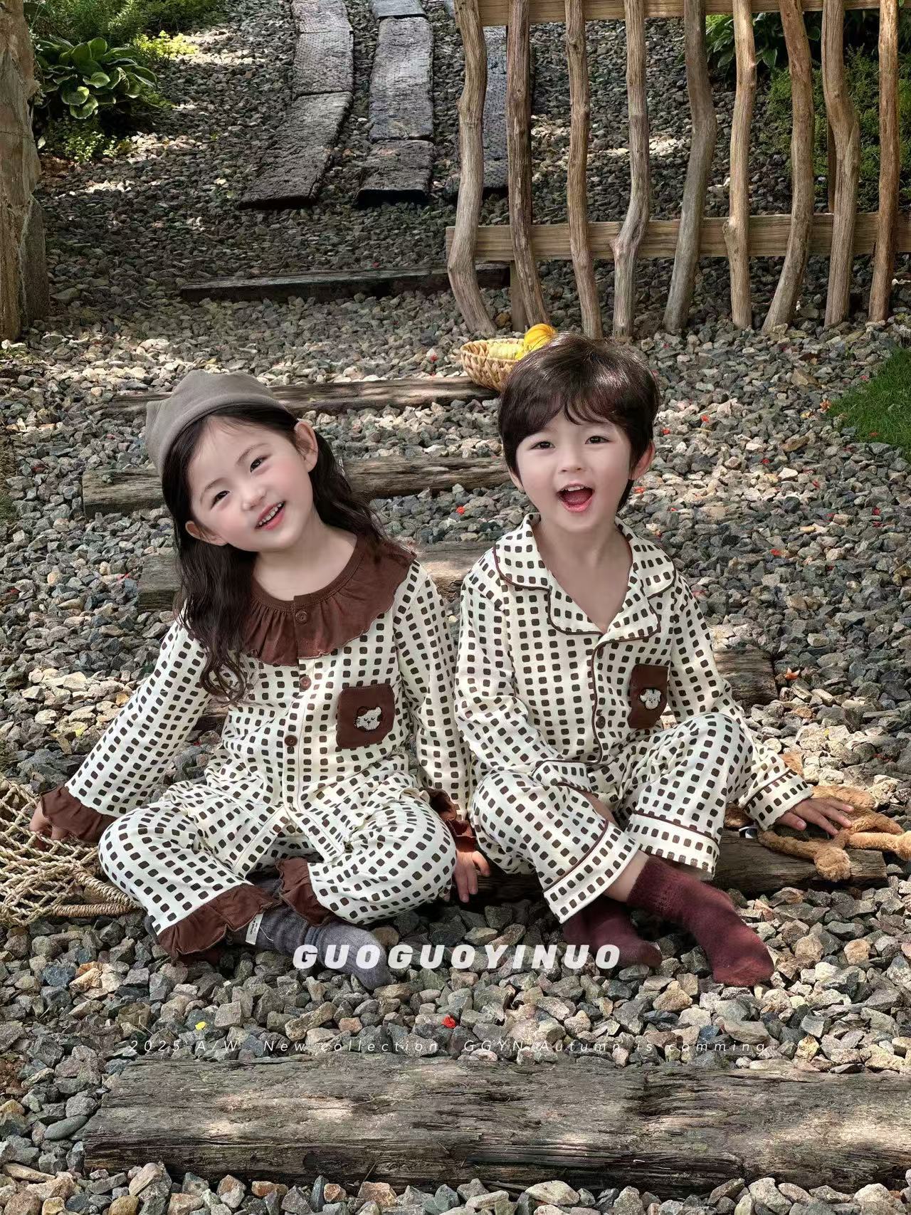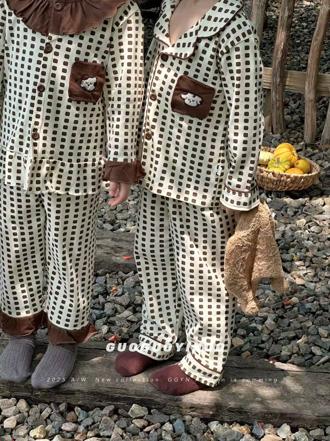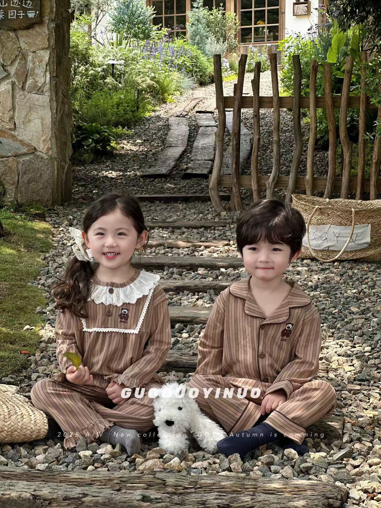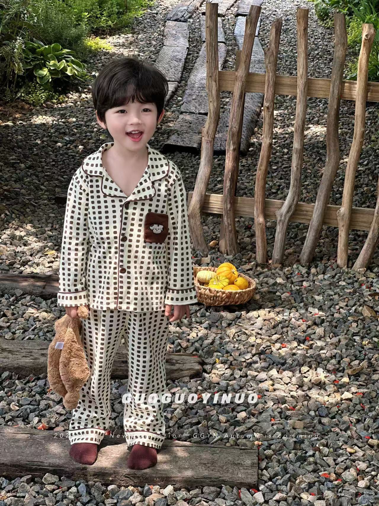 Guoguo YINUO 새로운 가을 잠옷 세트 면 형제 자매 가정복 카테고리 A 카디건 긴팔 격자 무늬 투피스 세트