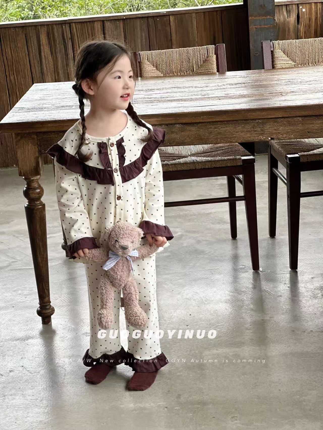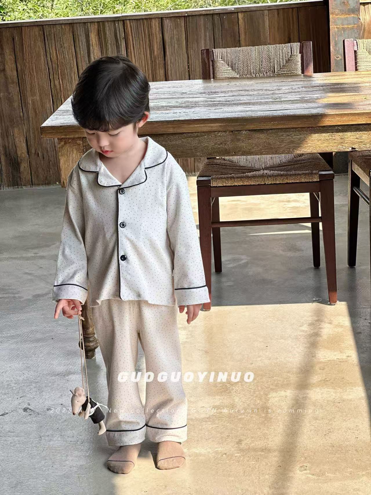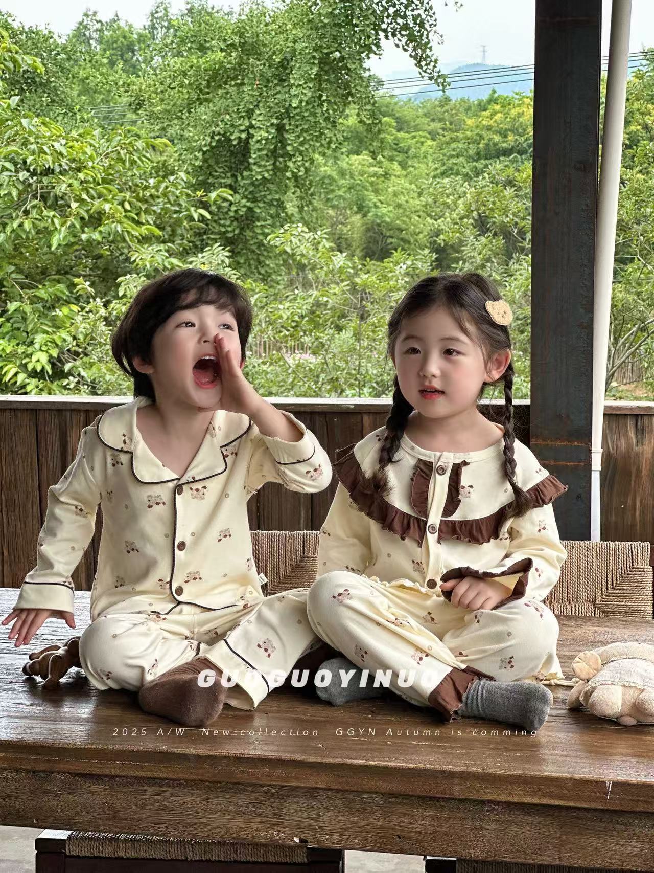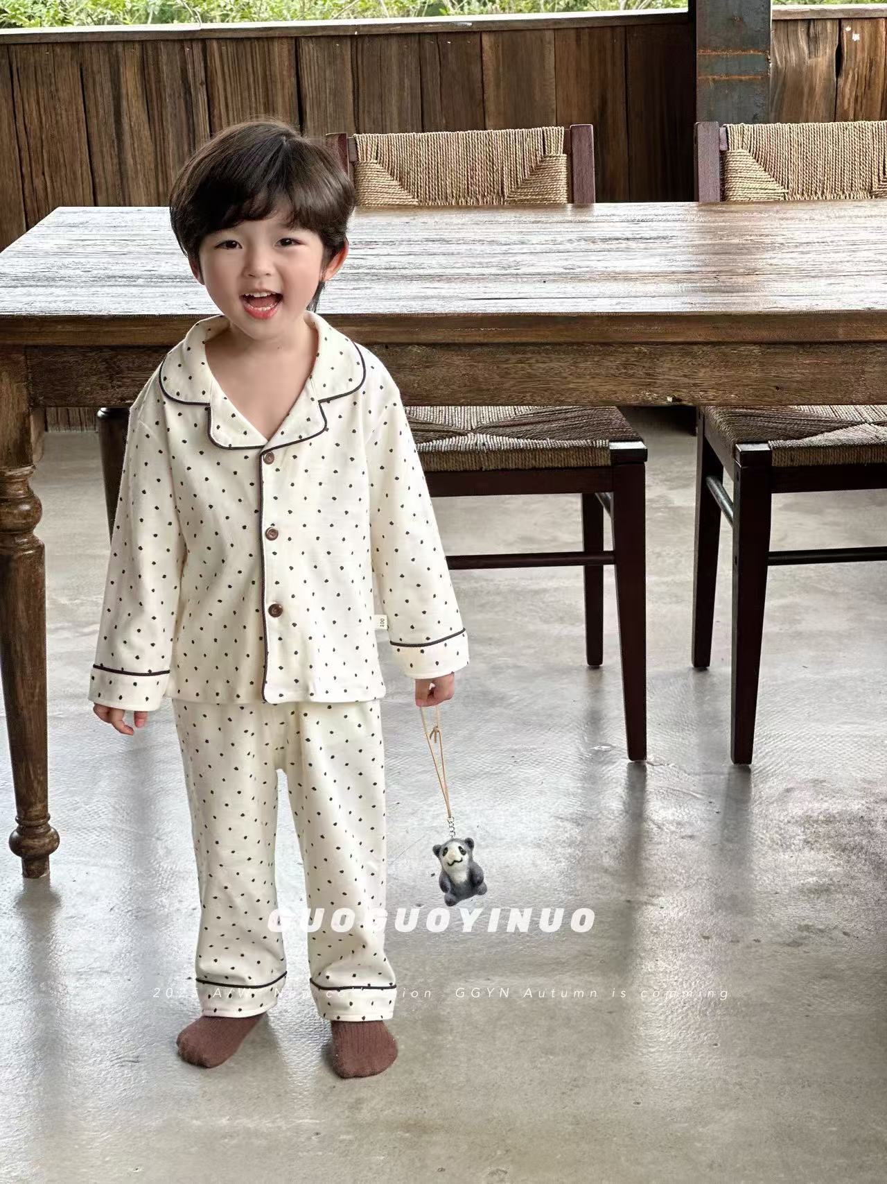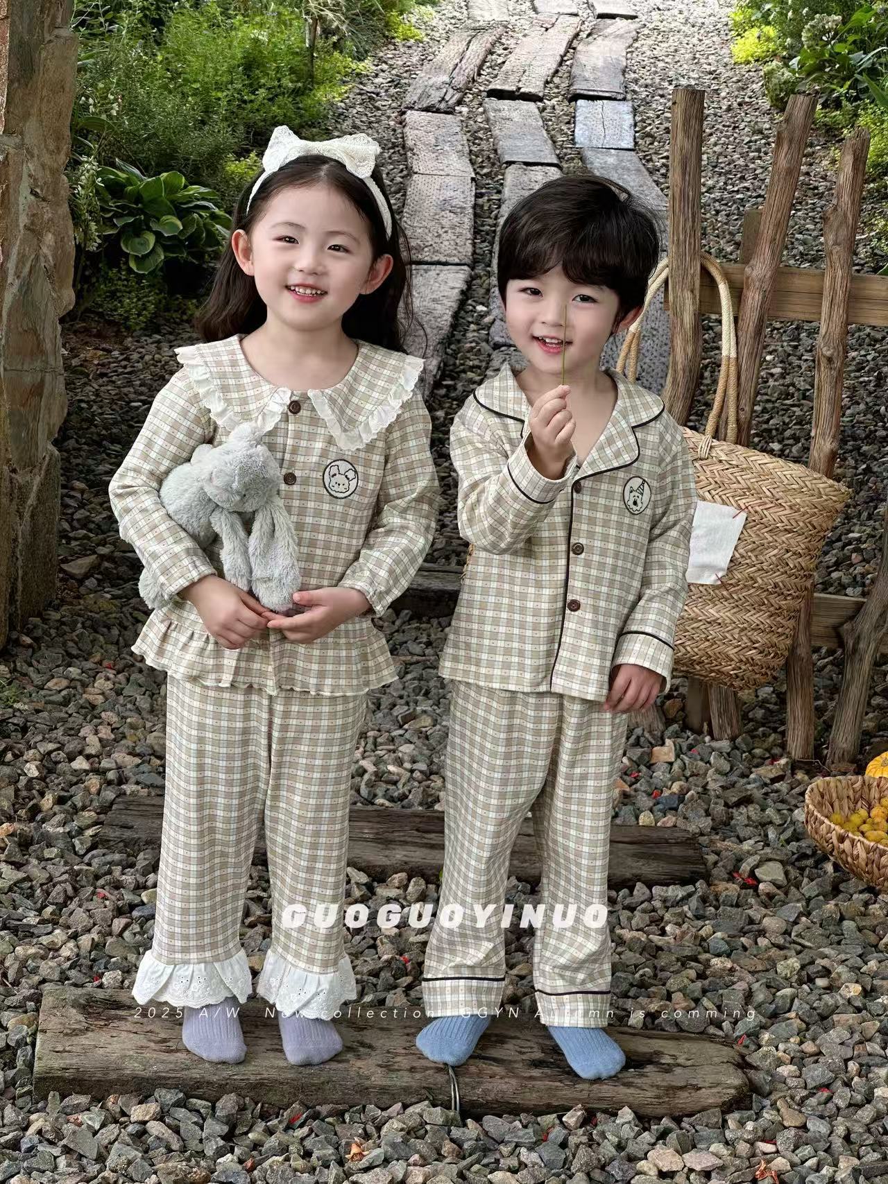 Guoguo YINUO 새로운 가을 잠옷 세트 면 형제 자매 가정복 카테고리 A 카디건 긴팔 격자 무늬 투피스 세트