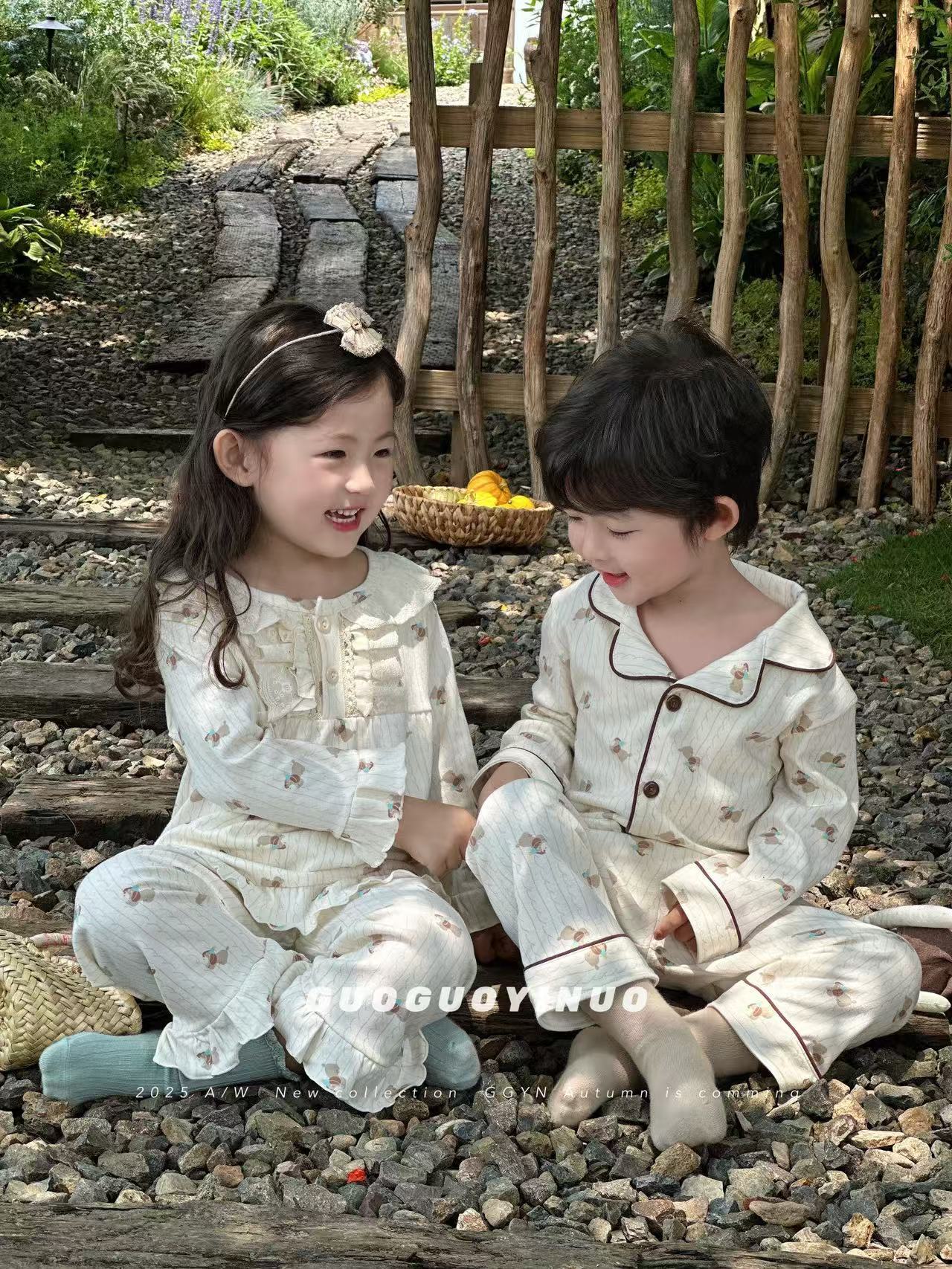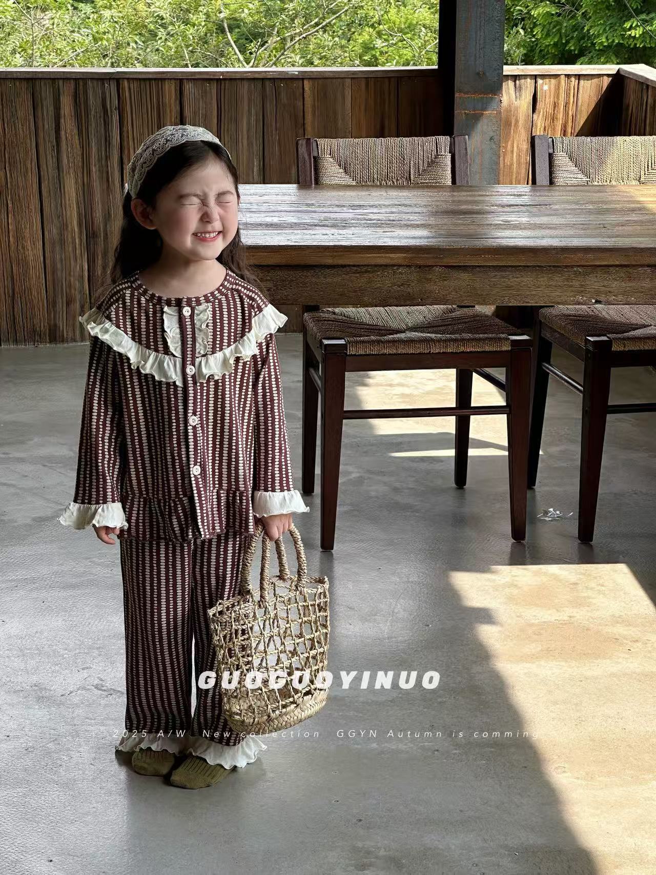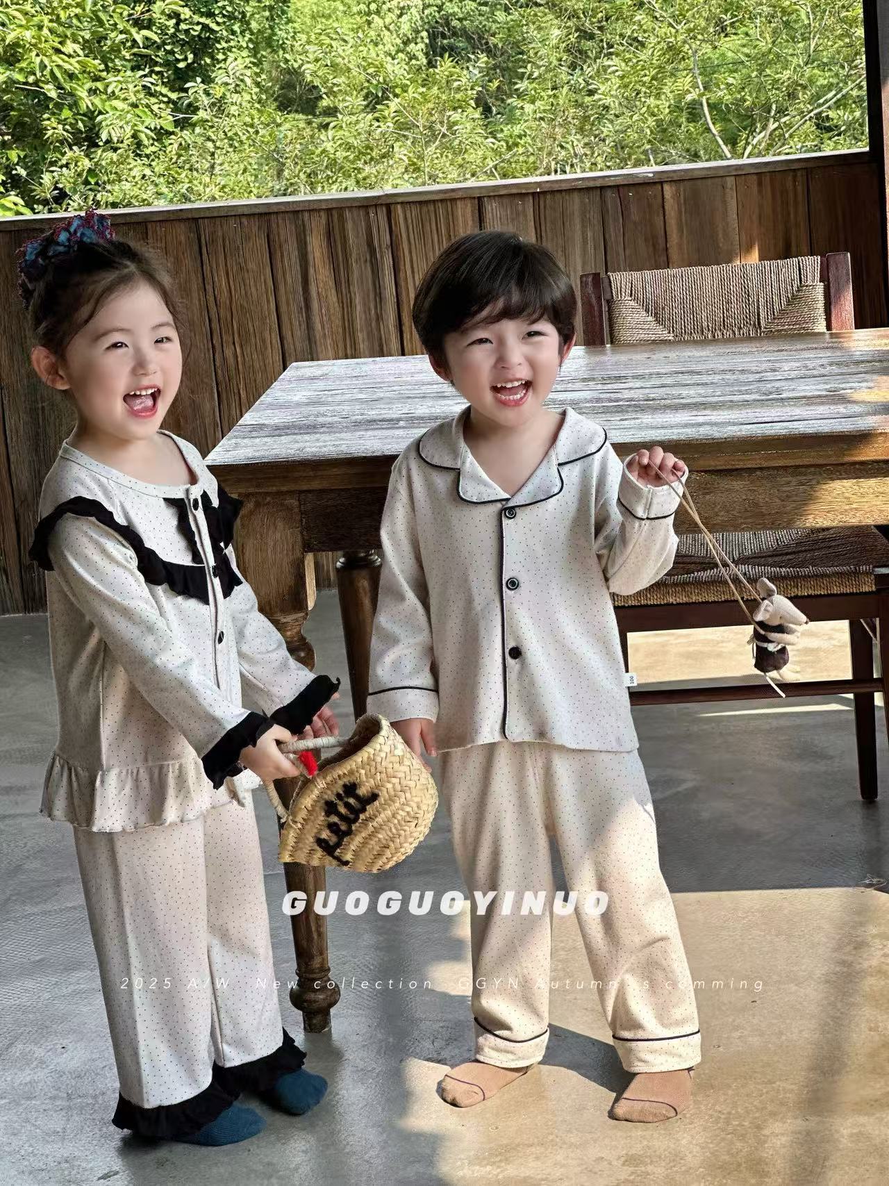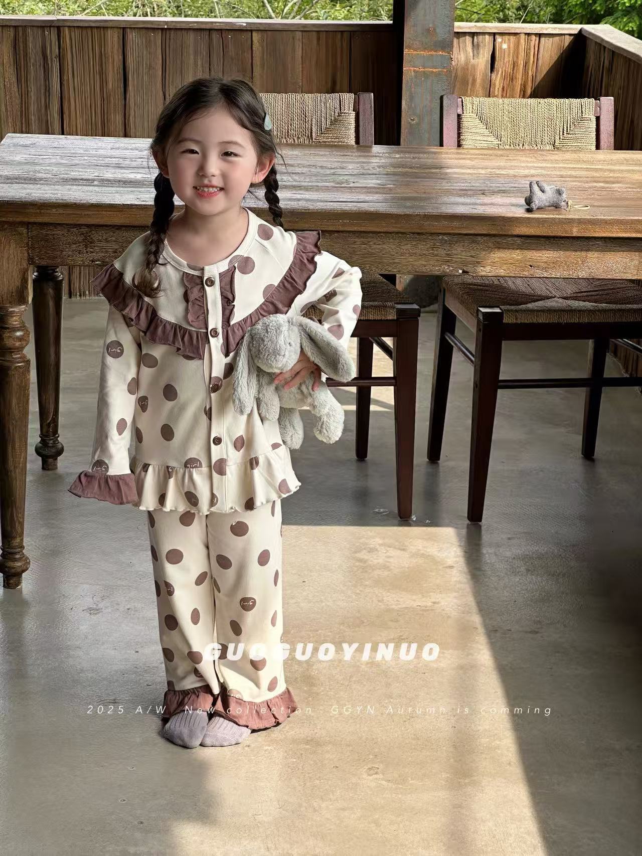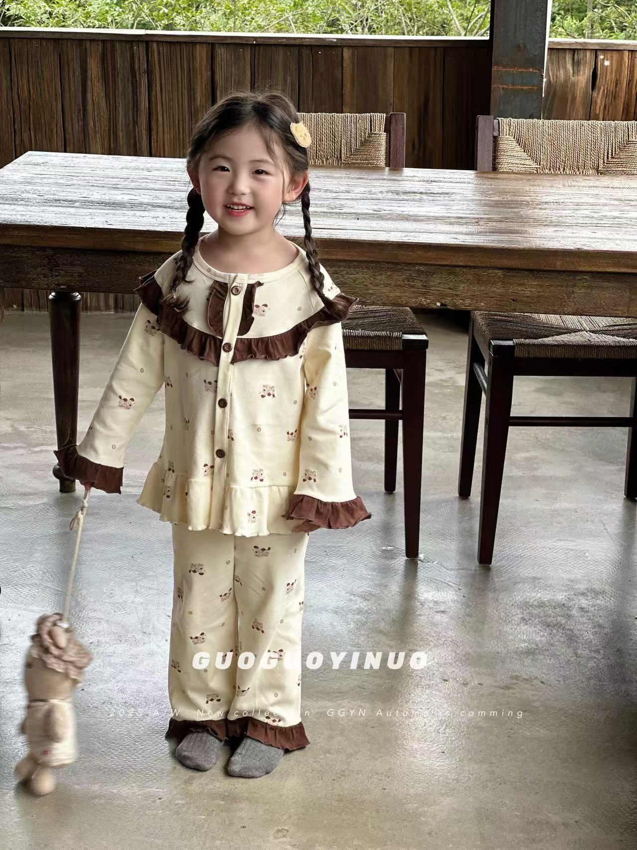 Guoguo YINUO 새로운 가을 잠옷 세트 면 형제 자매 가정복 카테고리 A 카디건 긴팔 격자 무늬 투피스 세트