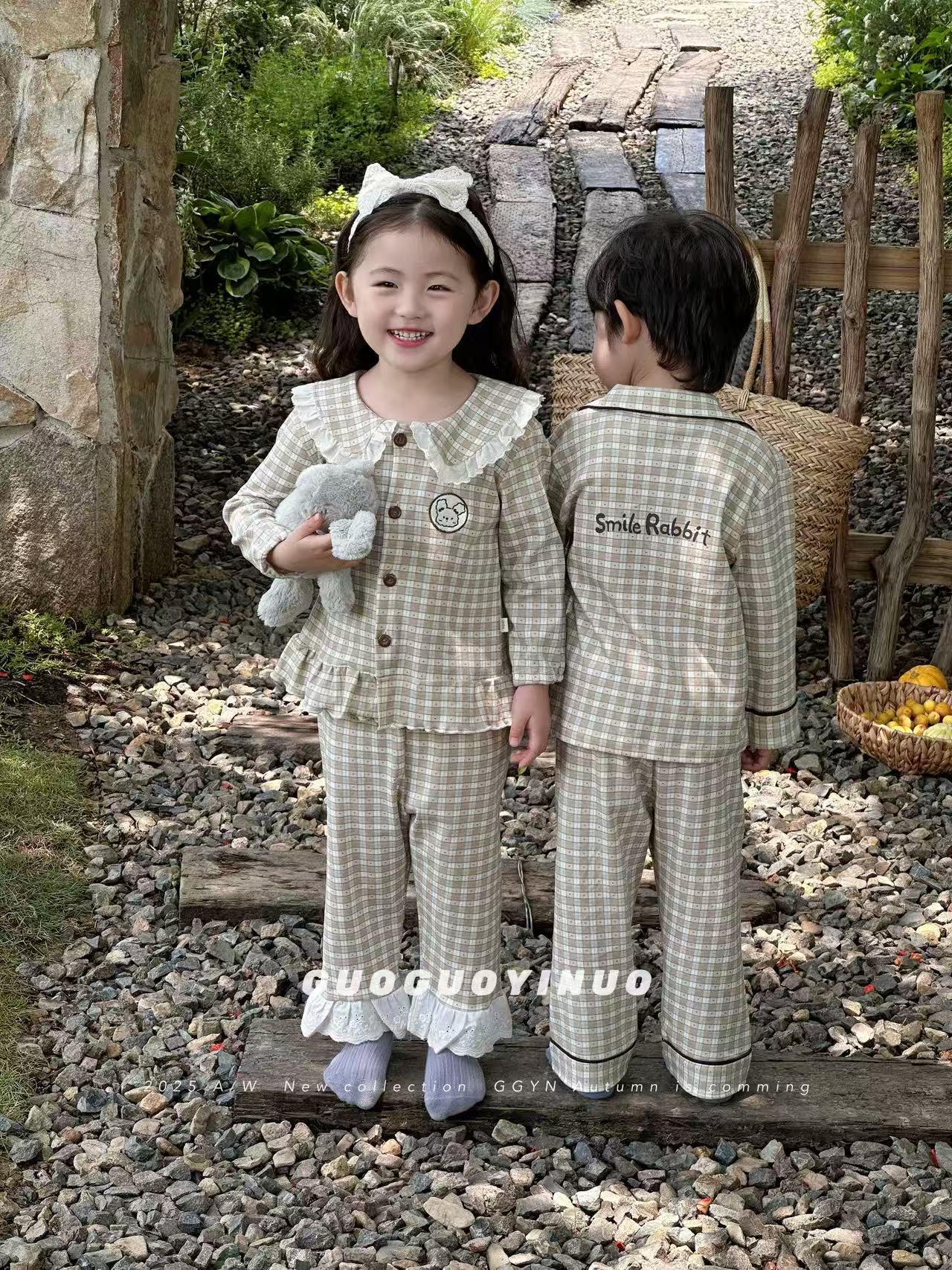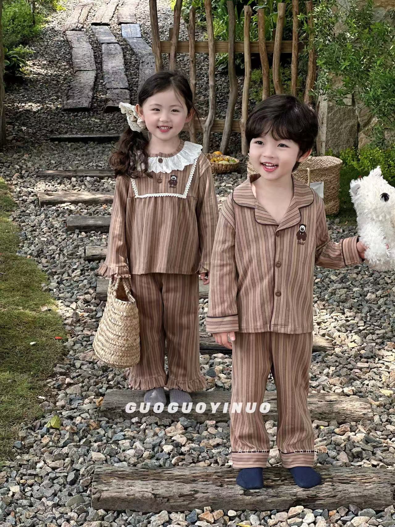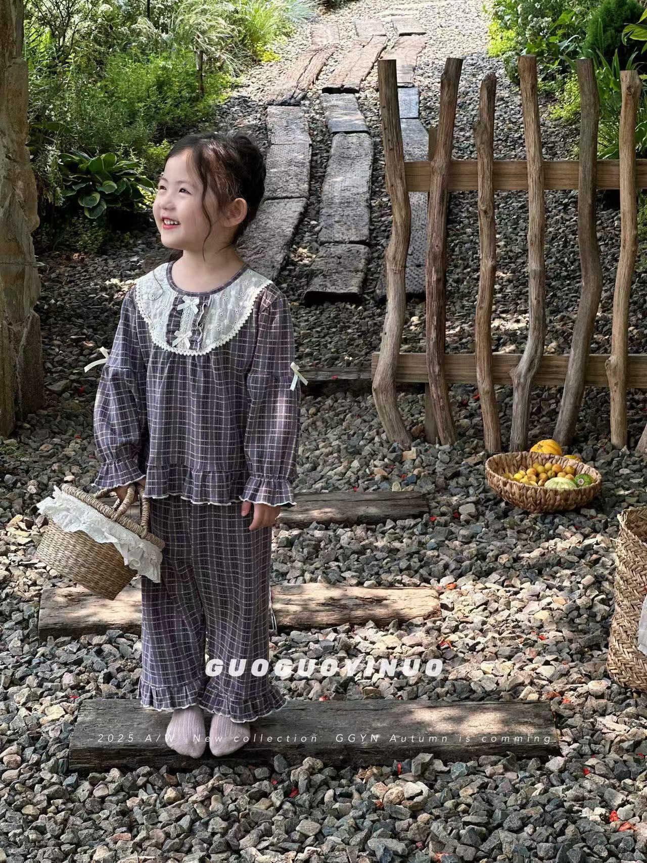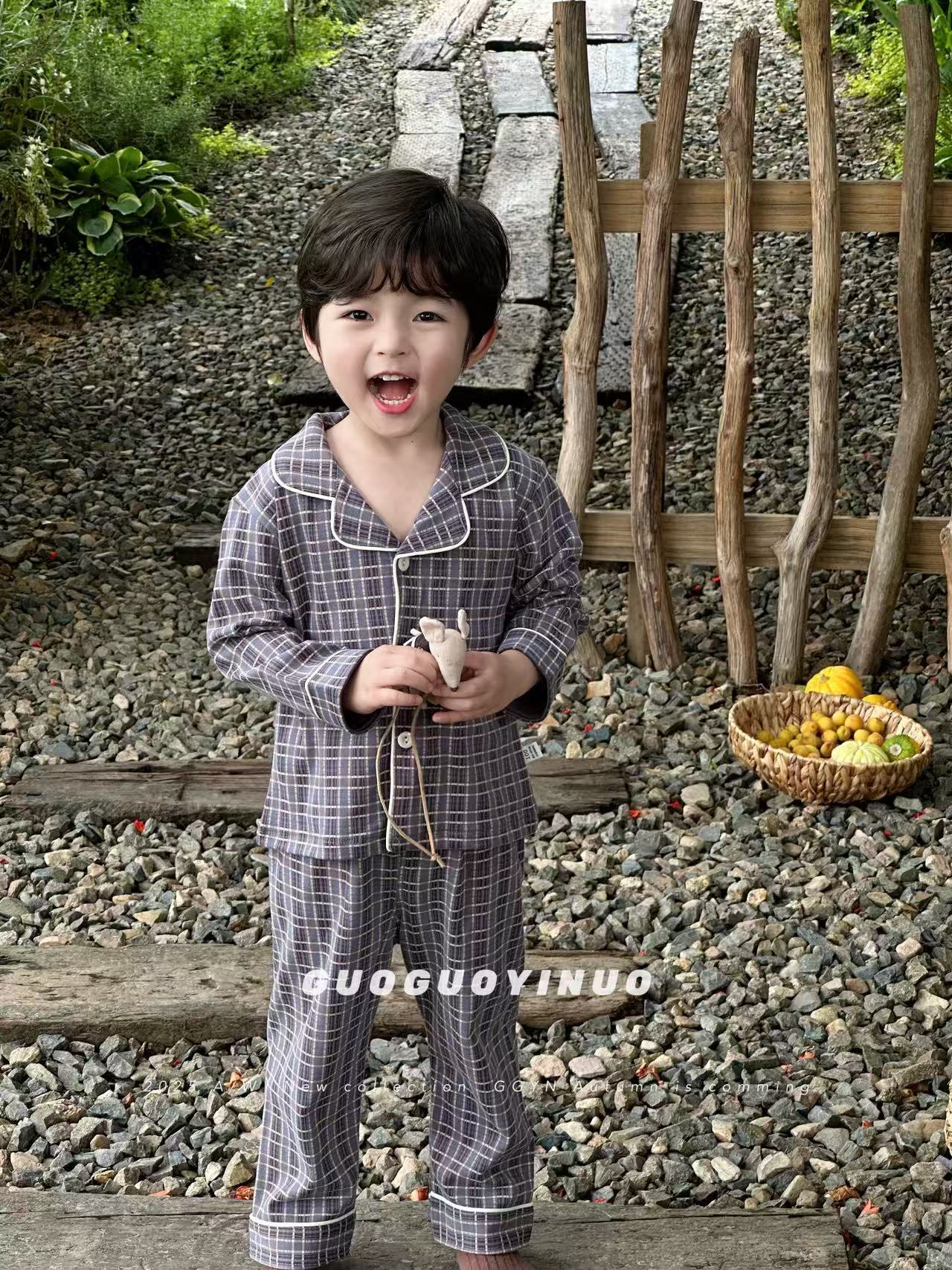 Guoguo YINUO 새로운 가을 잠옷 세트 면 형제 자매 가정복 카테고리 A 카디건 긴팔 격자 무늬 투피스 세트스토어 가기