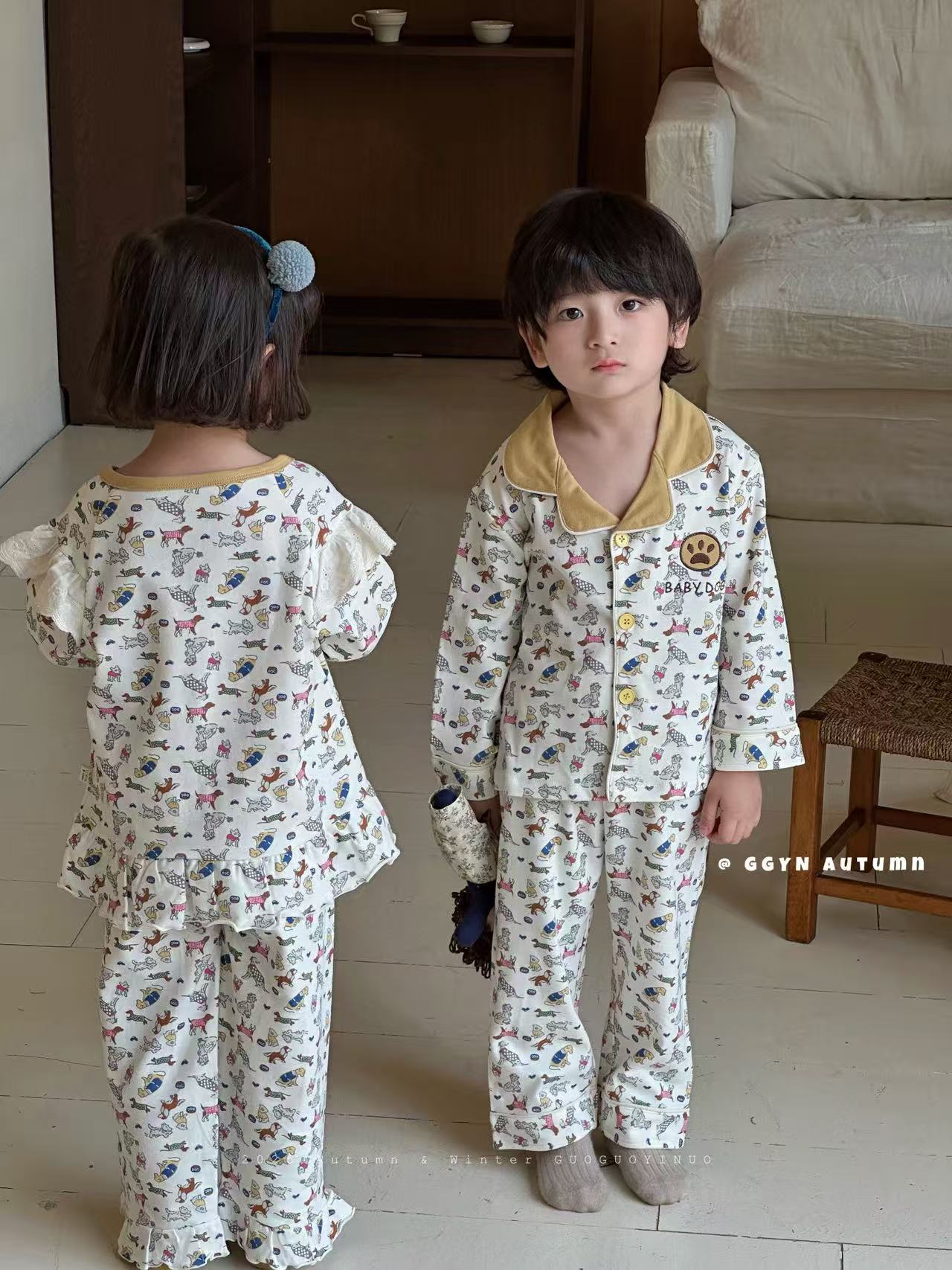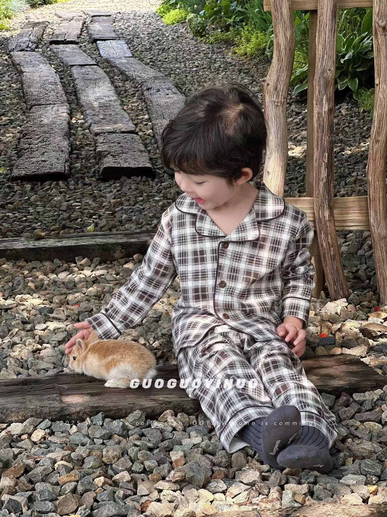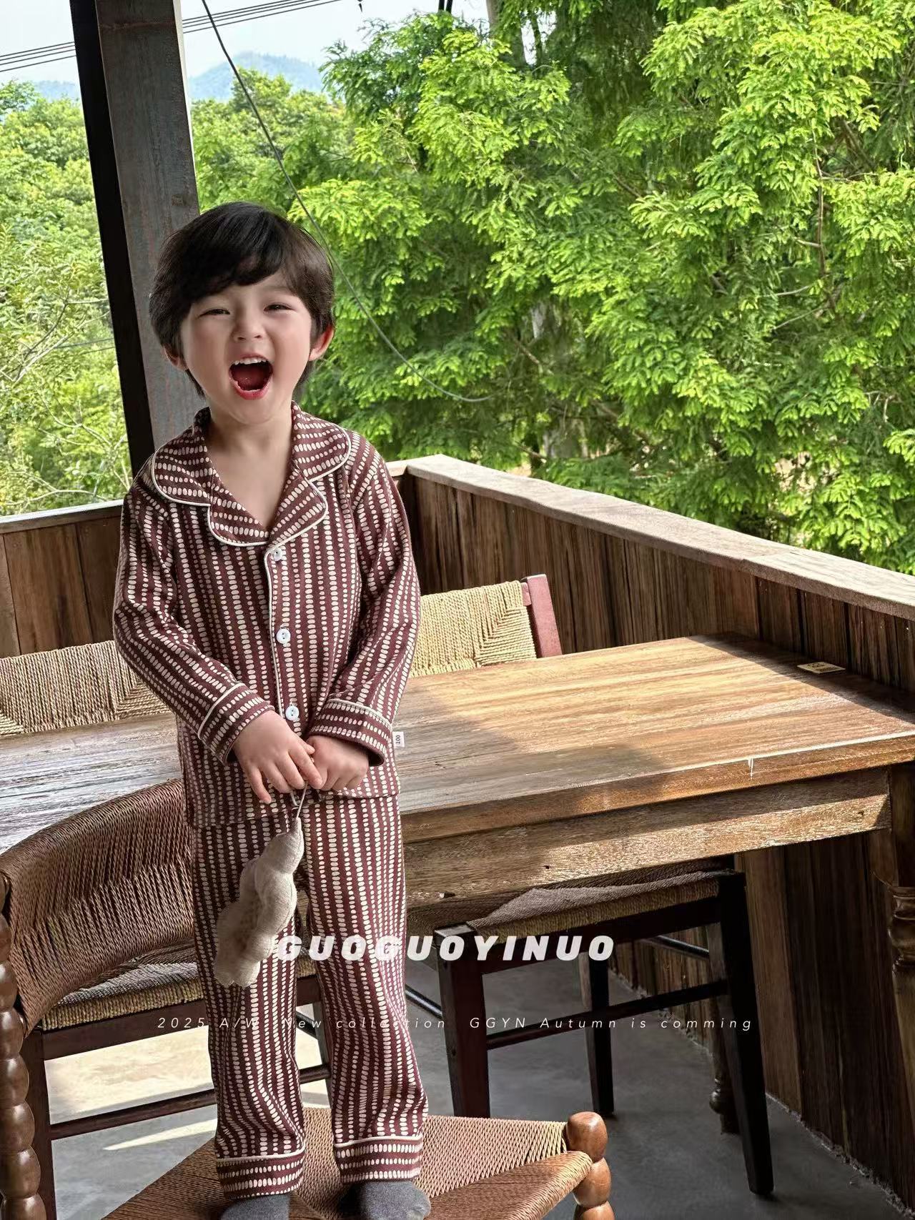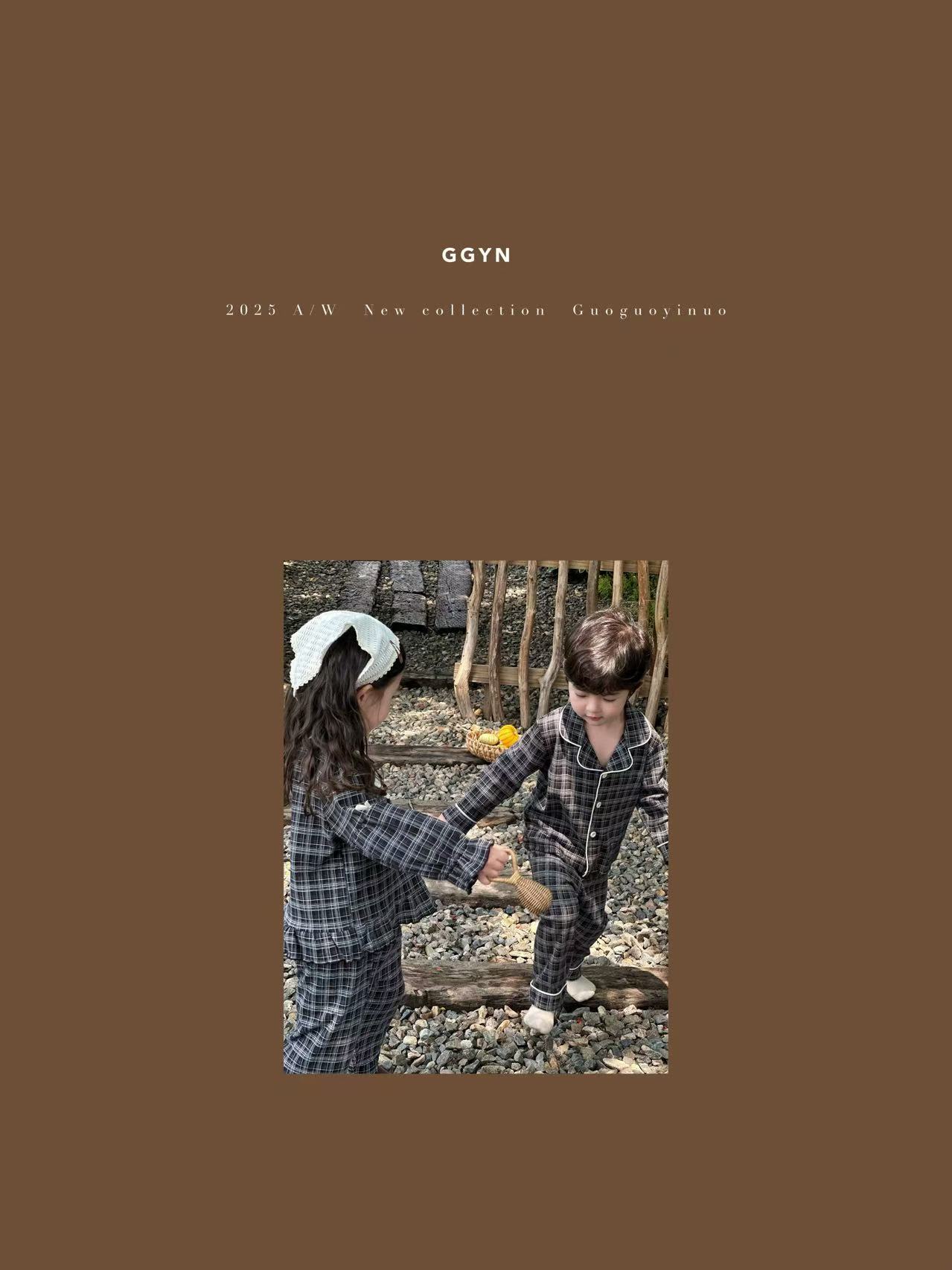 Guoguo YINUO 새로운 가을 잠옷 세트 면 형제 자매 가정복 카테고리 A 카디건 긴팔 격자 무늬 투피스 세트스토어 가기