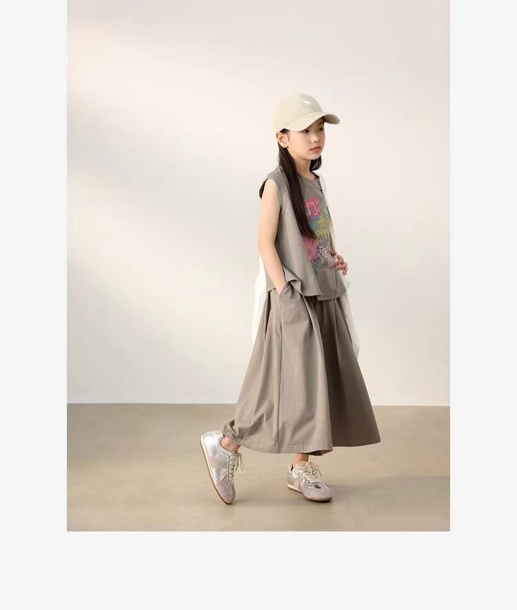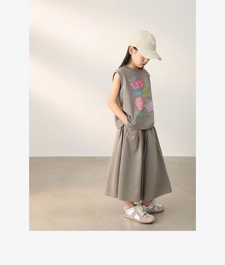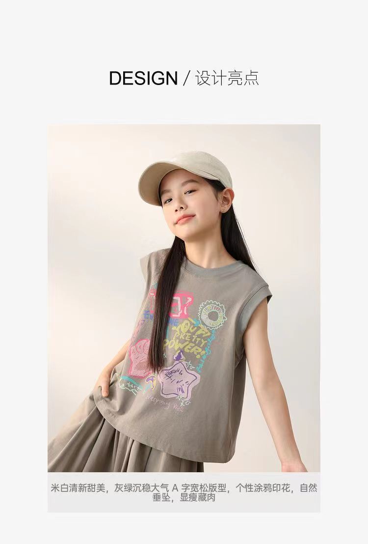 여아 한국 스타일 민소매 티셔츠 여름 얇은 탑 여름 옷 중대형 어린이 여름 신작 단색 패션 투피스 세트스토어 가기