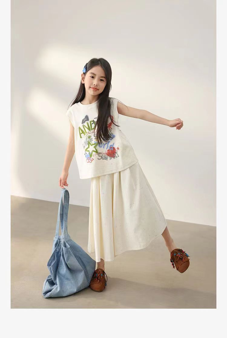 여아 한국 스타일 민소매 티셔츠 여름 얇은 탑 여름 옷 중대형 어린이 여름 신작 단색 패션 투피스 세트