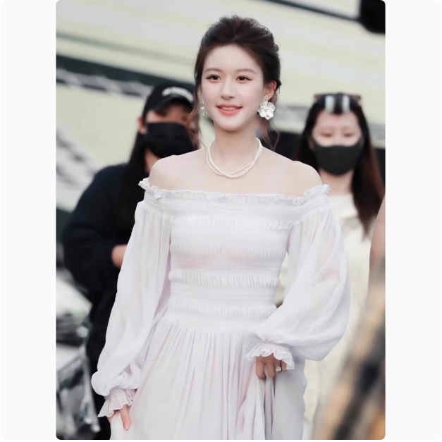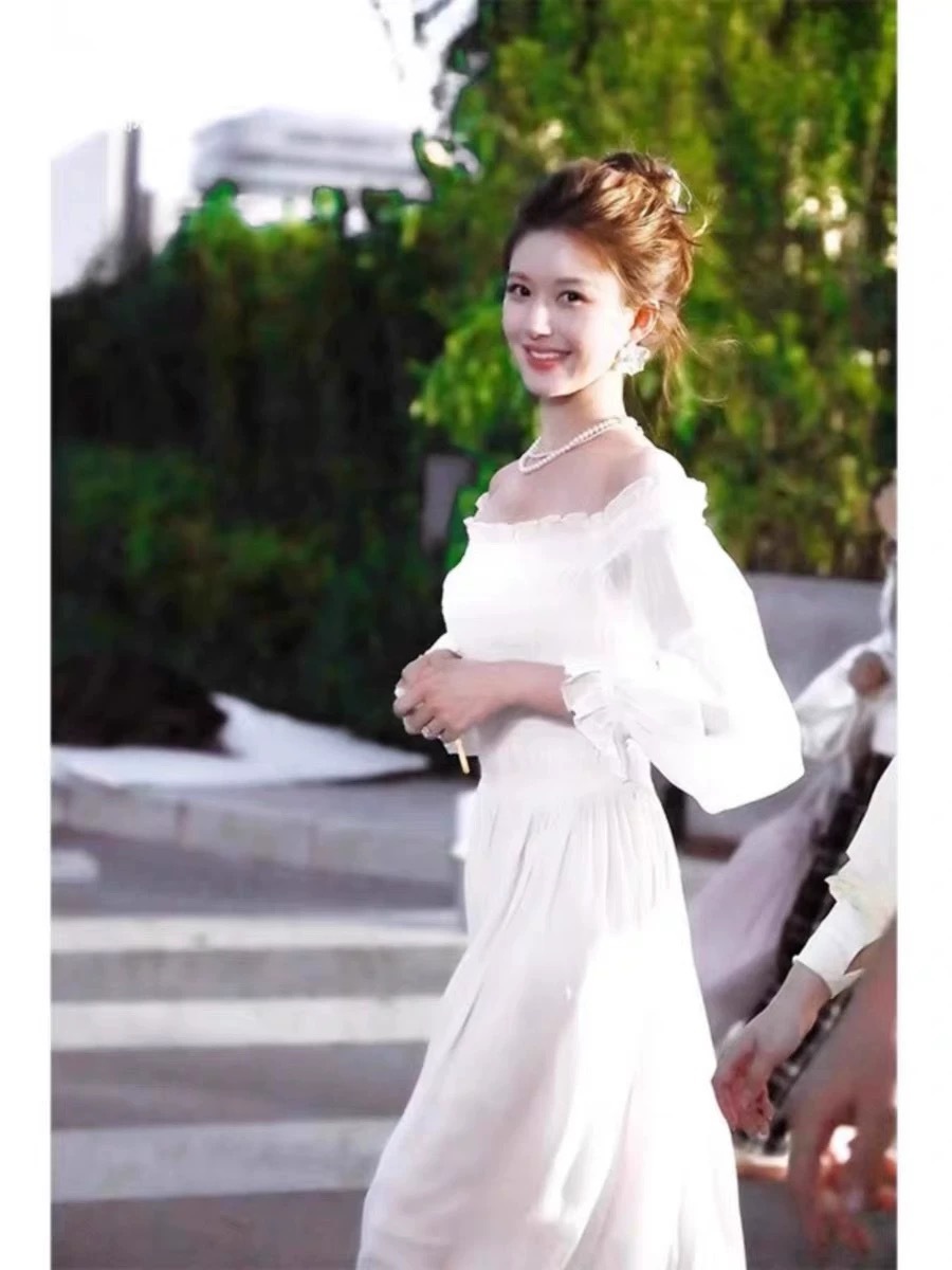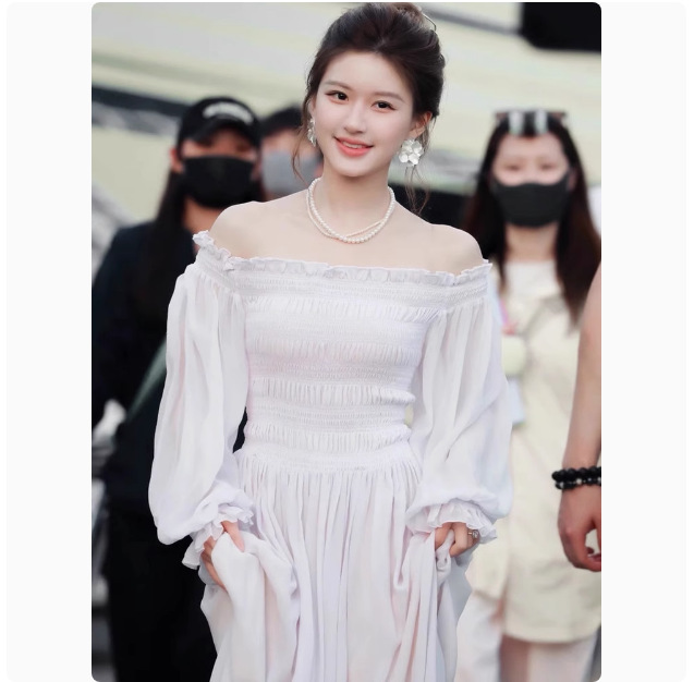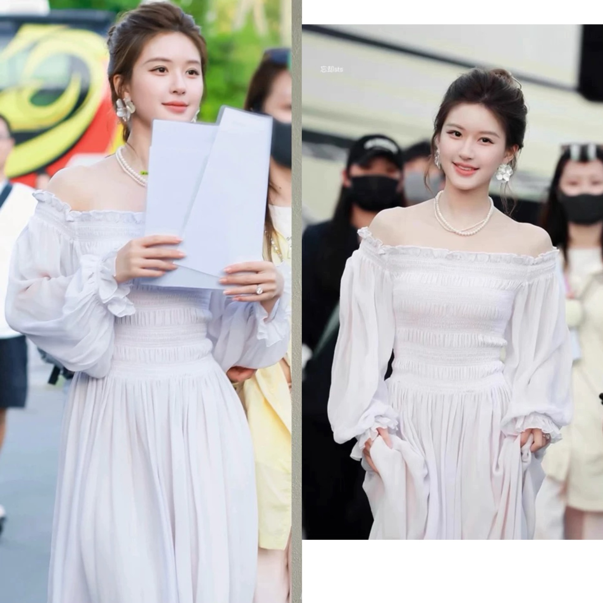 Zhao Lusi의 여성을 위한 달콤한 원 숄더 긴팔 드레스 2025 고급 기질 슬림 롱 스커트