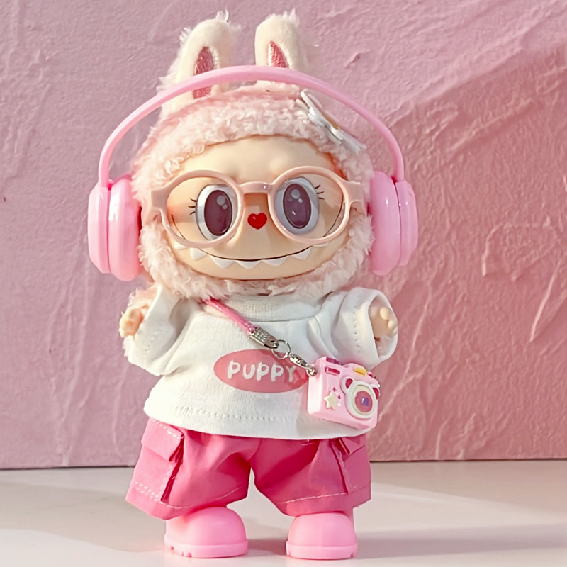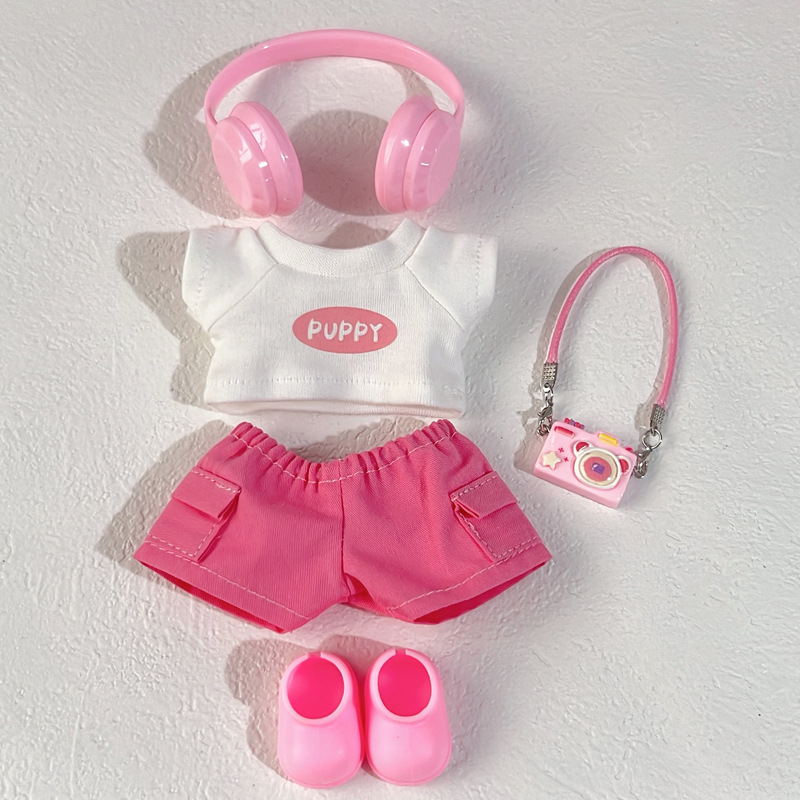 • 핑크 이어폰 + 핑크 푸티셔츠 투피스 세트 + 핑크 PP 신발 + 핑크 카메라