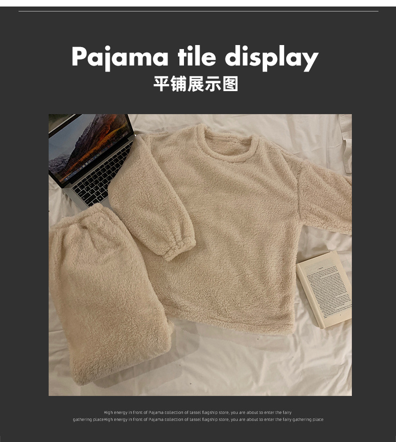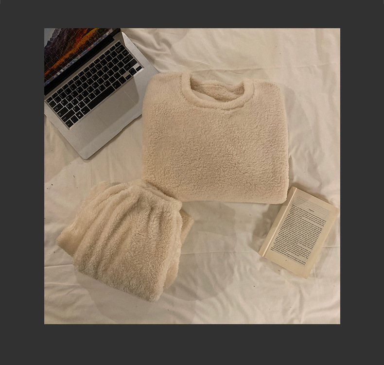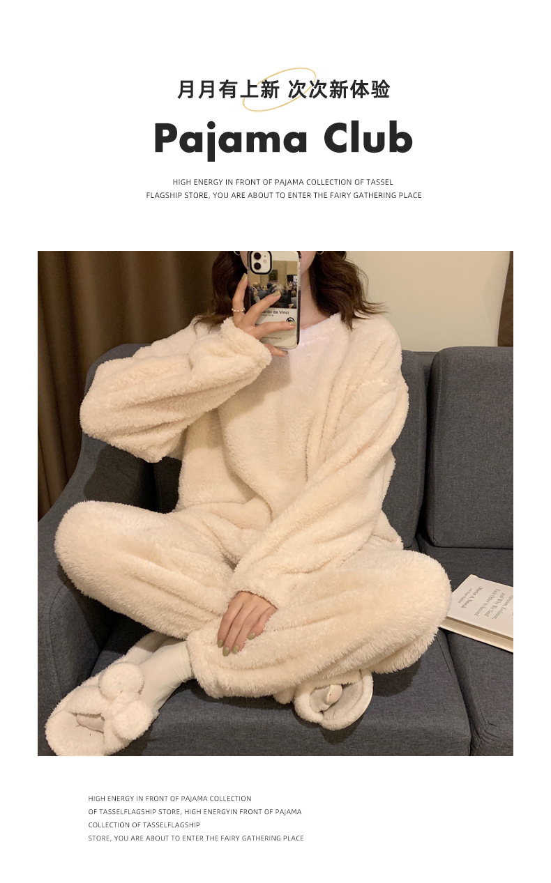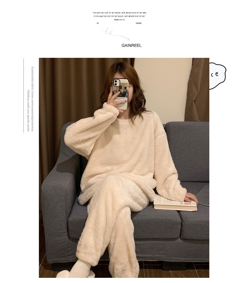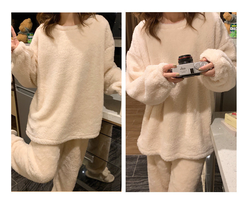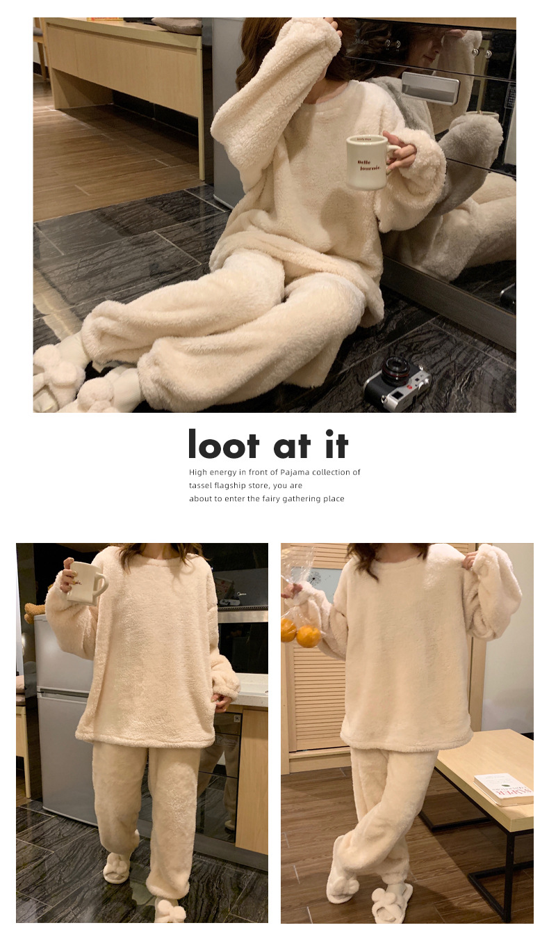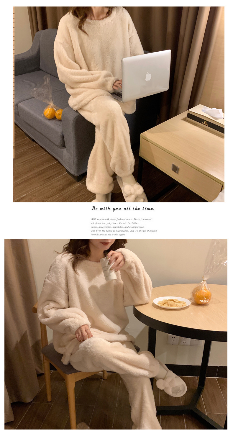 여성용 겨울 잠옷, 산호 벨벳, 두꺼운 라운드 넥, 심플한 루즈한 솔리드 컬러, 기숙사에서 착용 가능, 홈웨어 세트