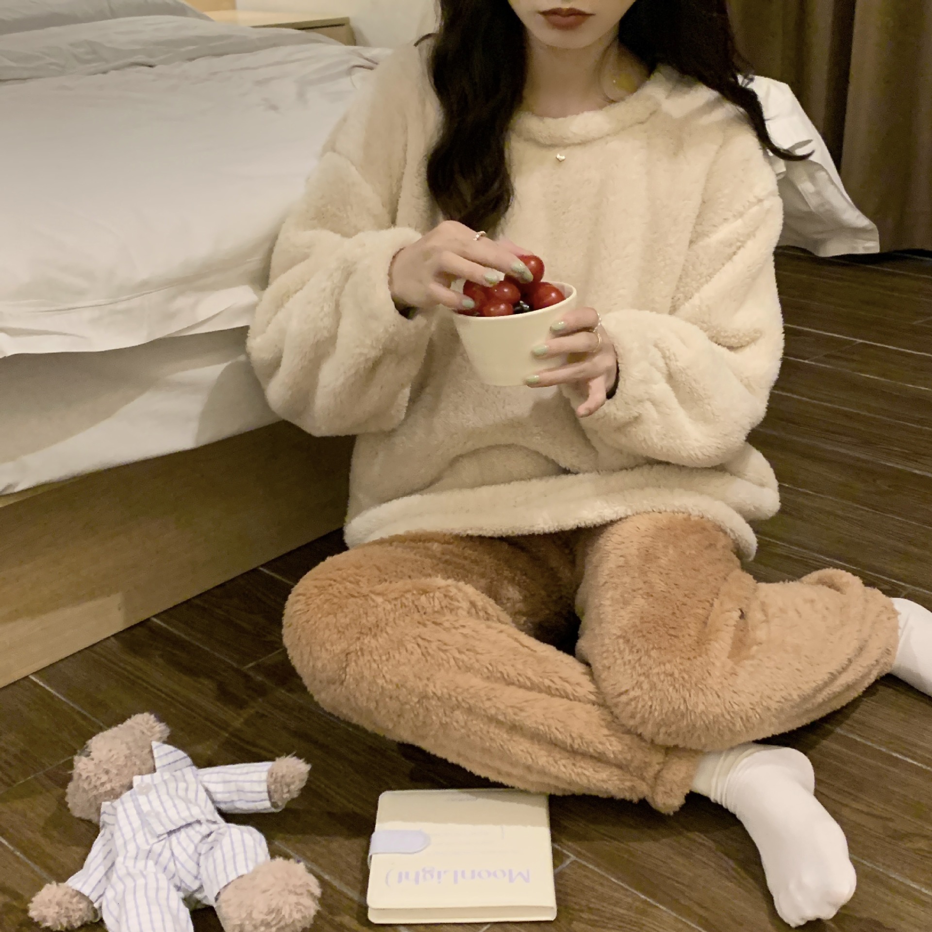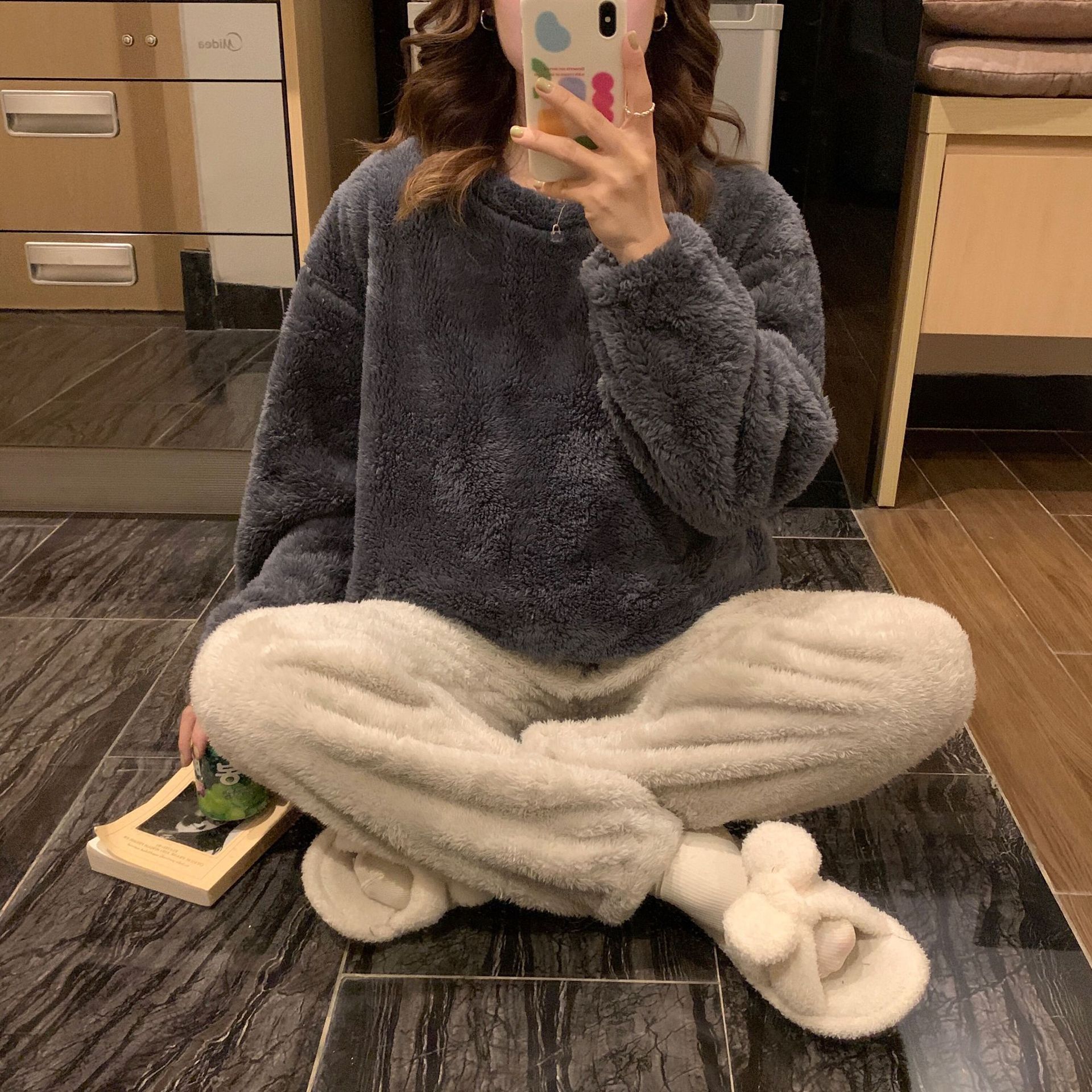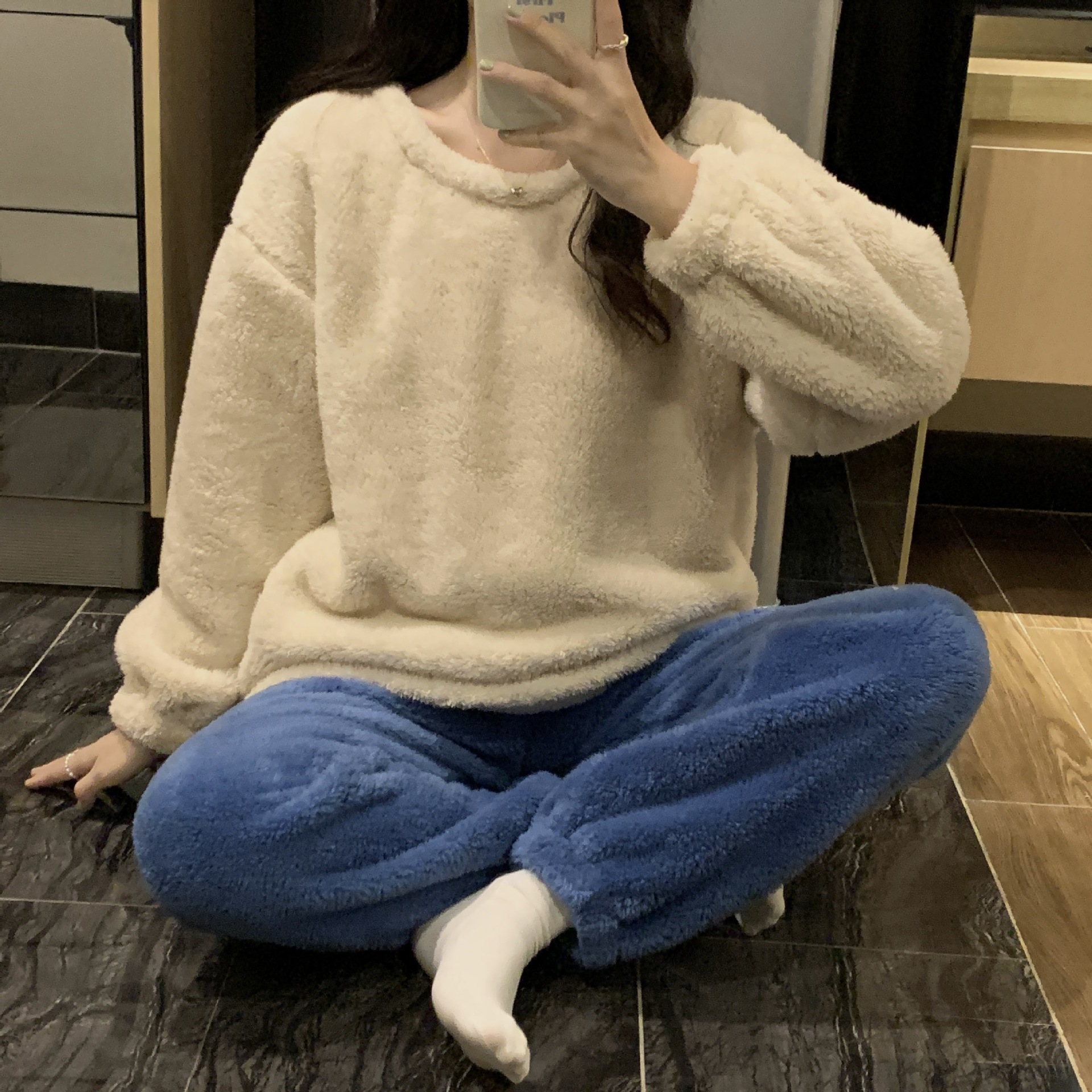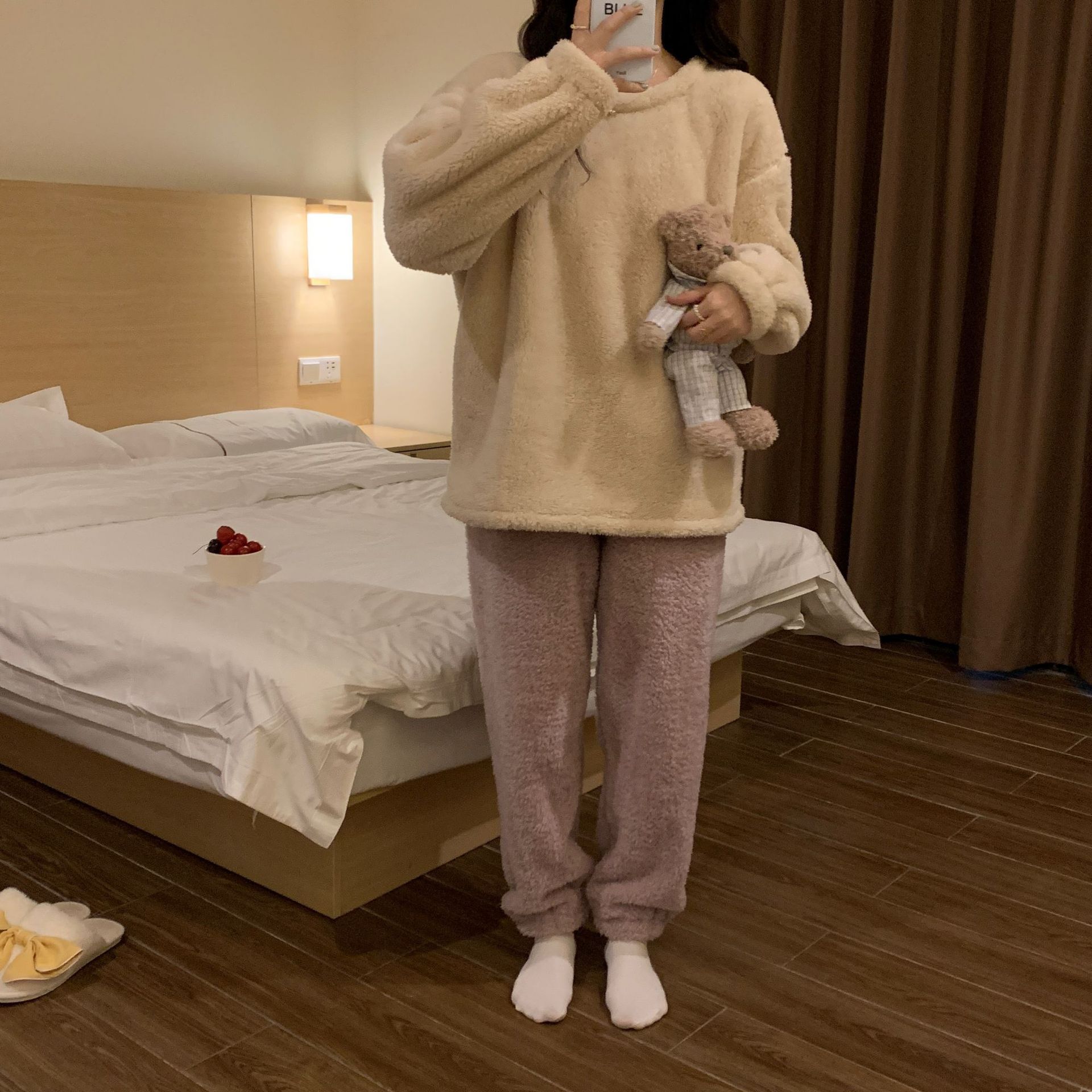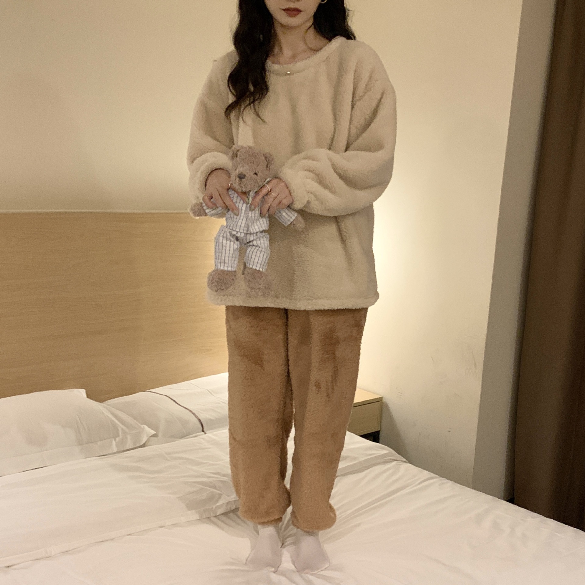 여성용 겨울 잠옷, 산호 벨벳, 두꺼운 라운드 넥, 심플한 루즈한 솔리드 컬러, 기숙사에서 착용 가능, 홈웨어 세트