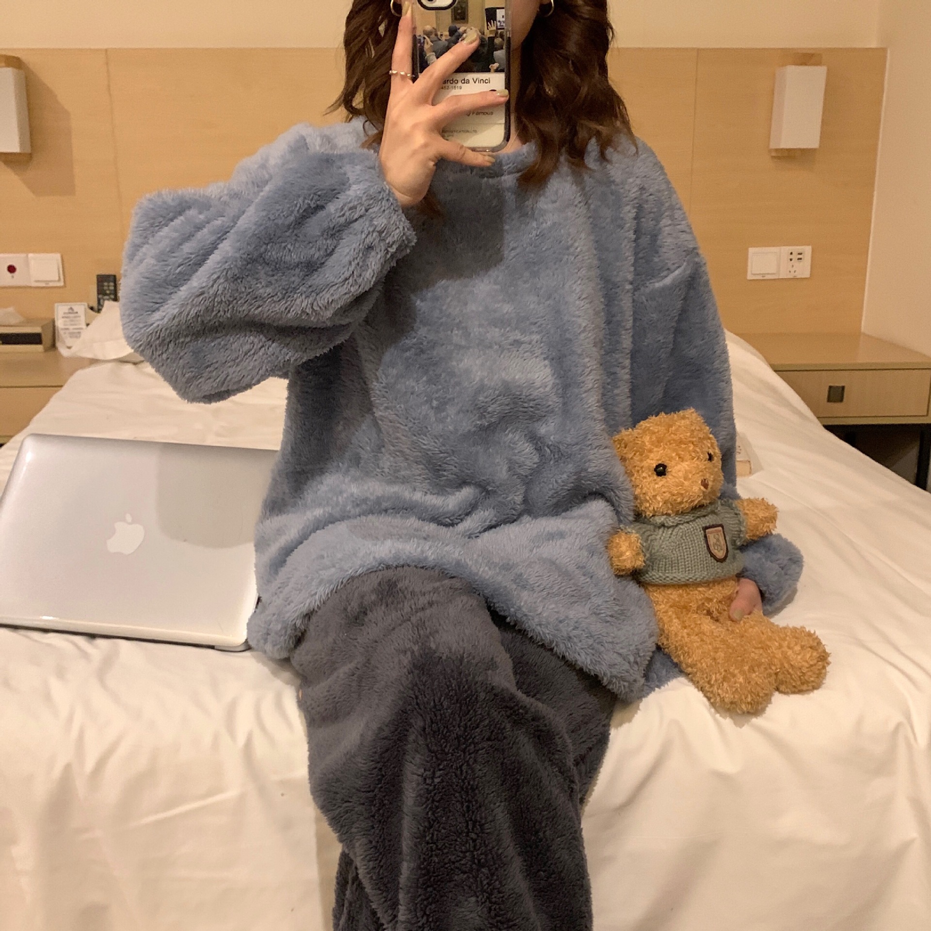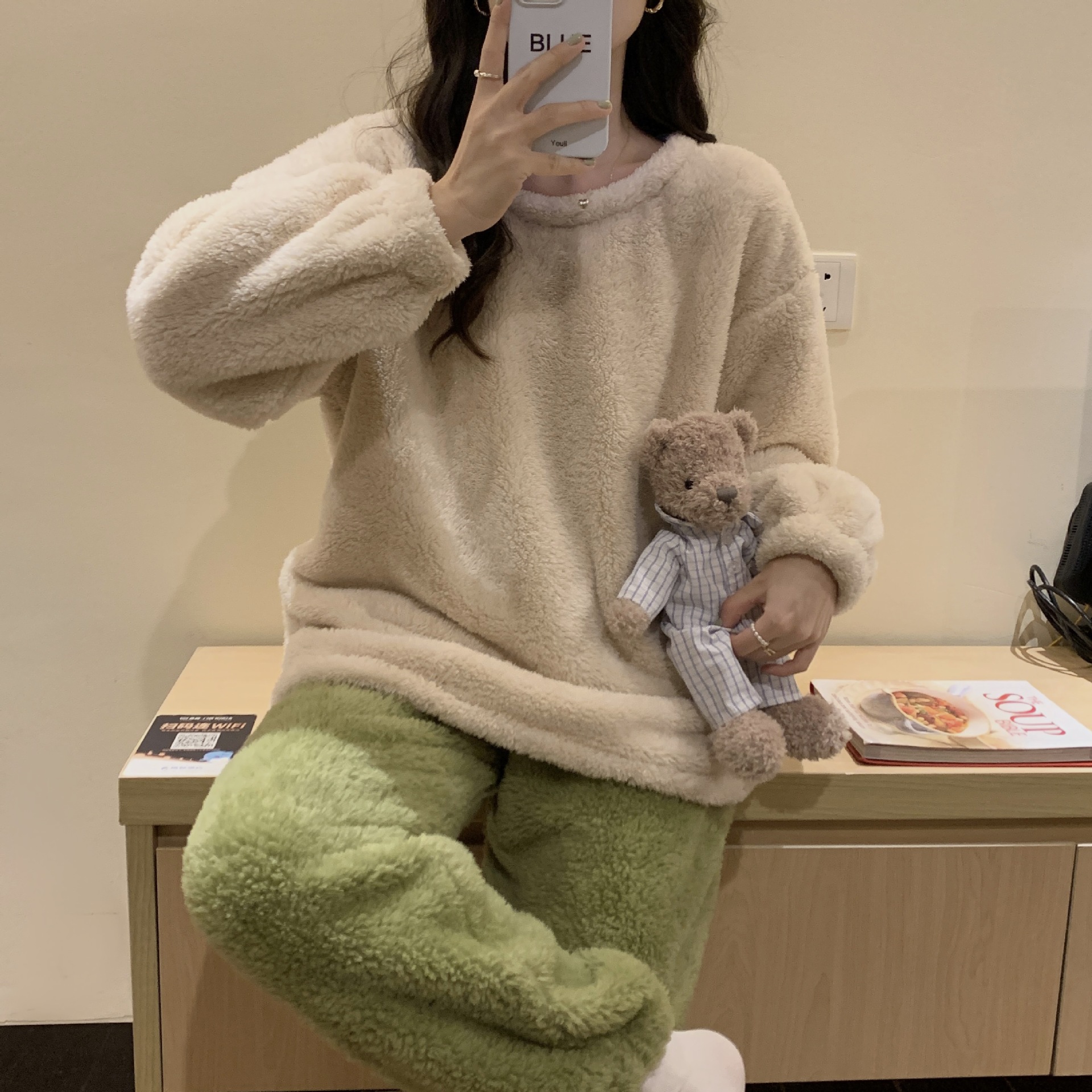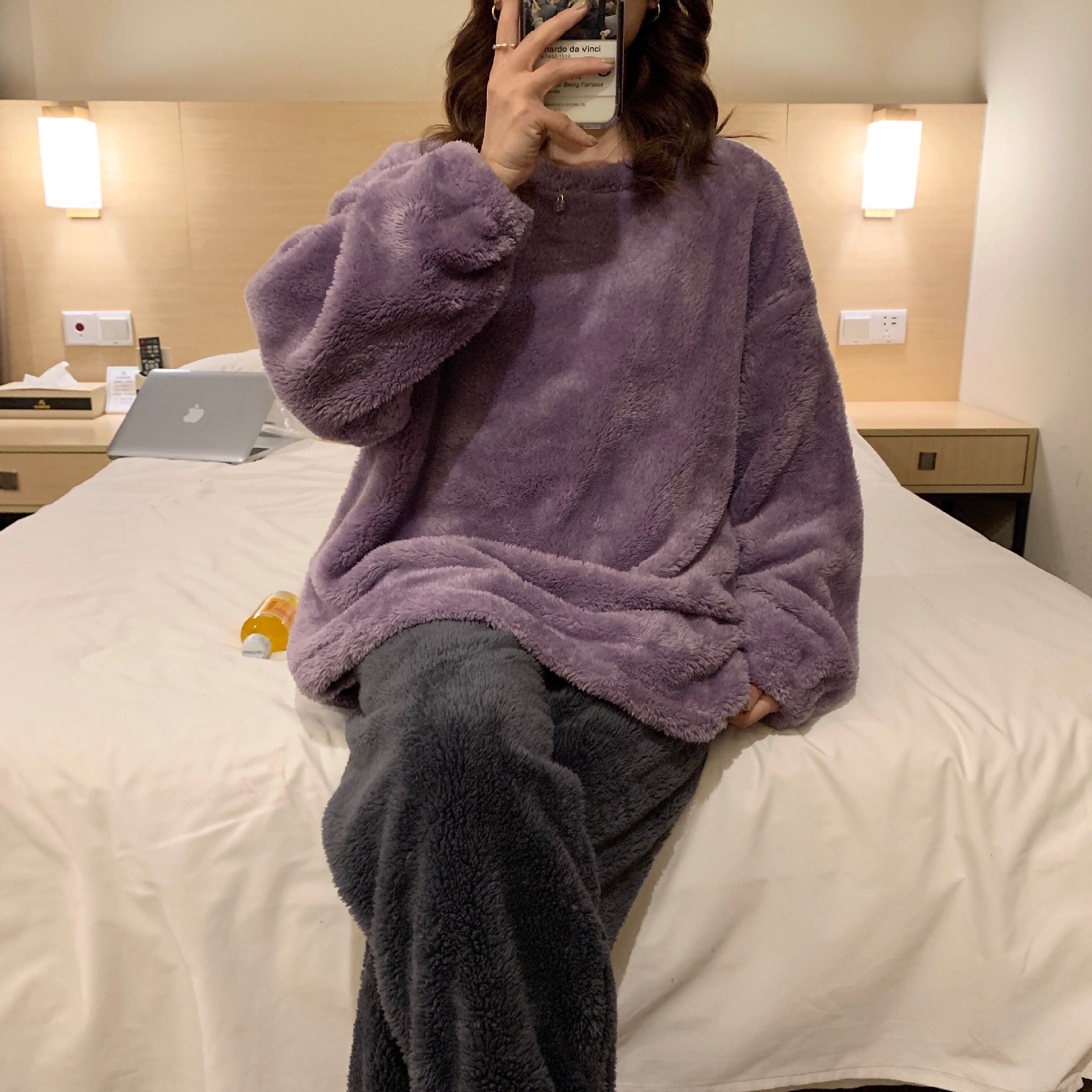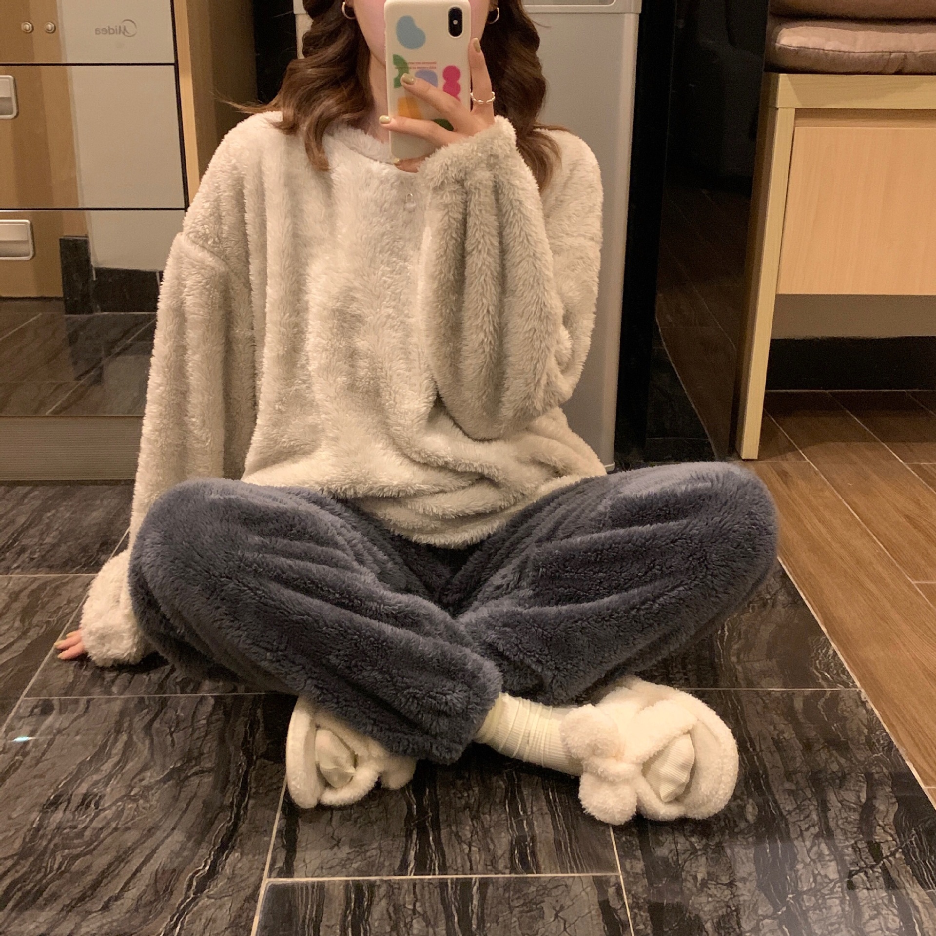 여성용 겨울 잠옷, 산호 벨벳, 두꺼운 라운드 넥, 심플한 루즈한 솔리드 컬러, 기숙사에서 착용 가능, 홈웨어 세트
