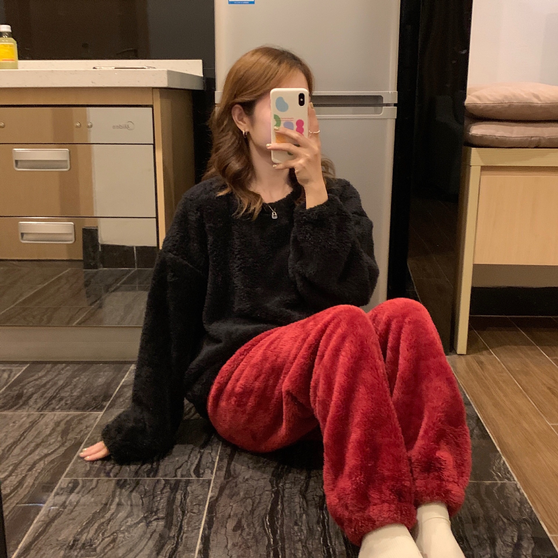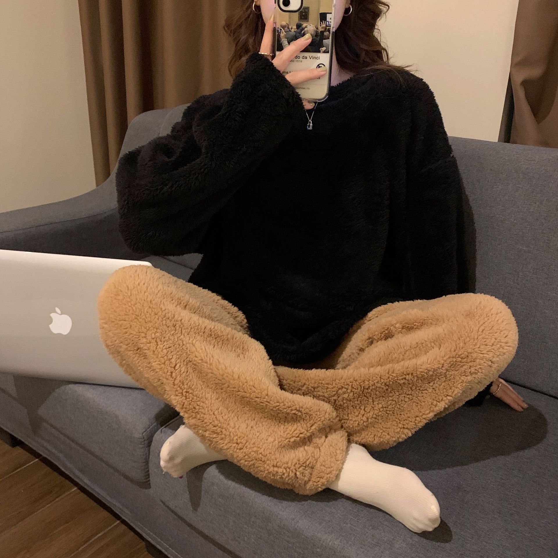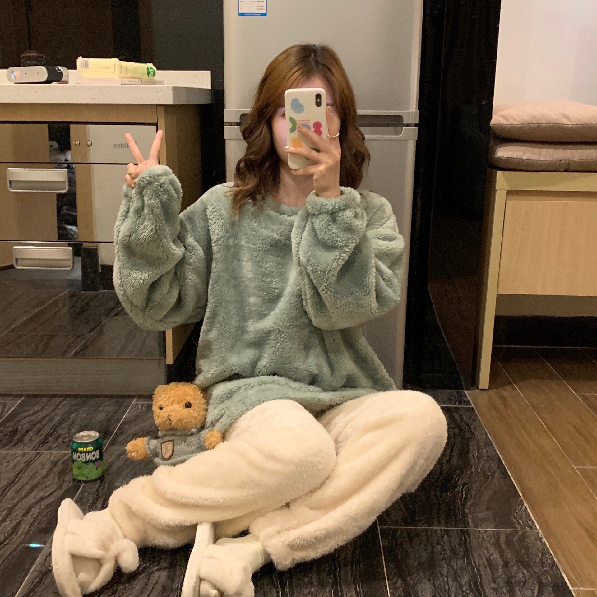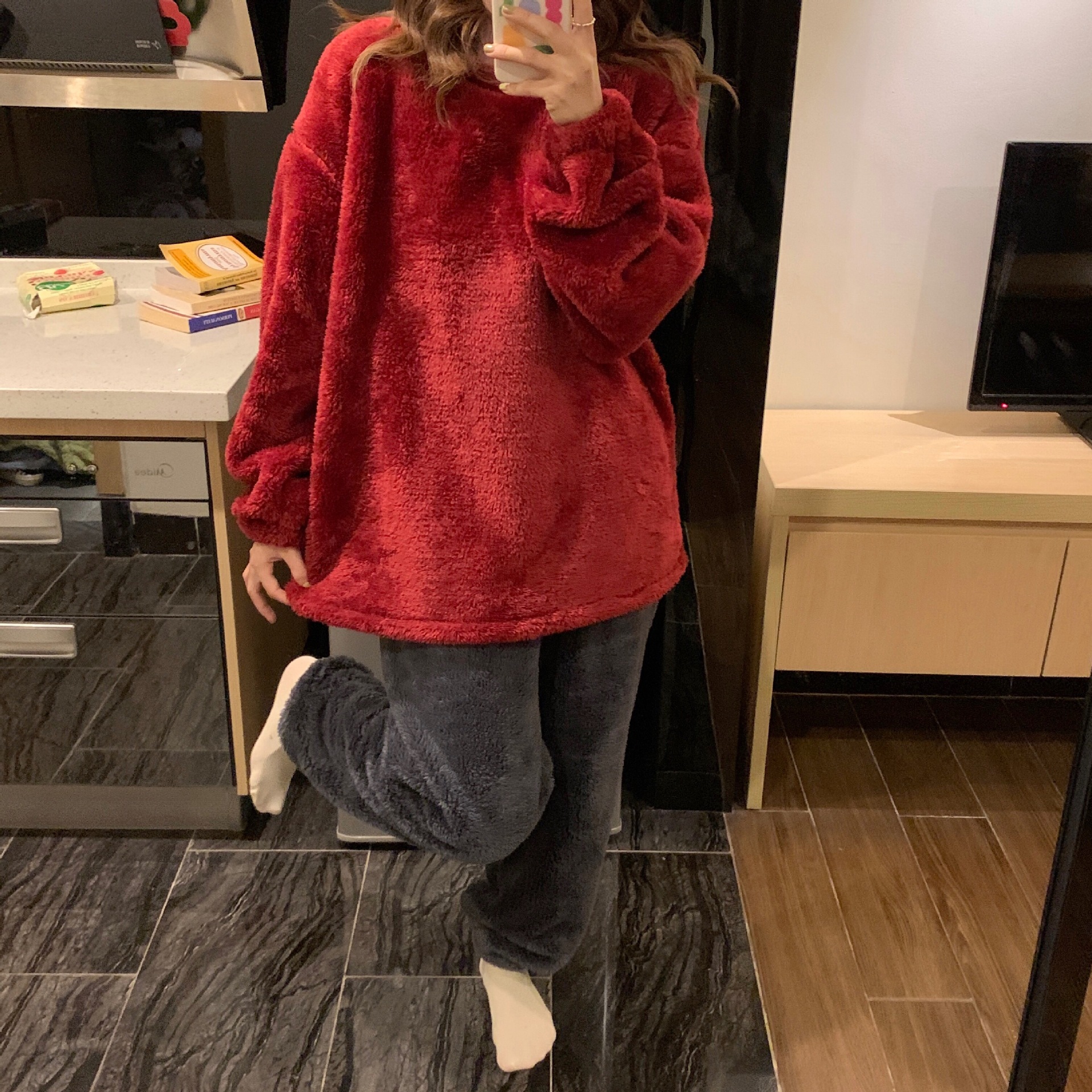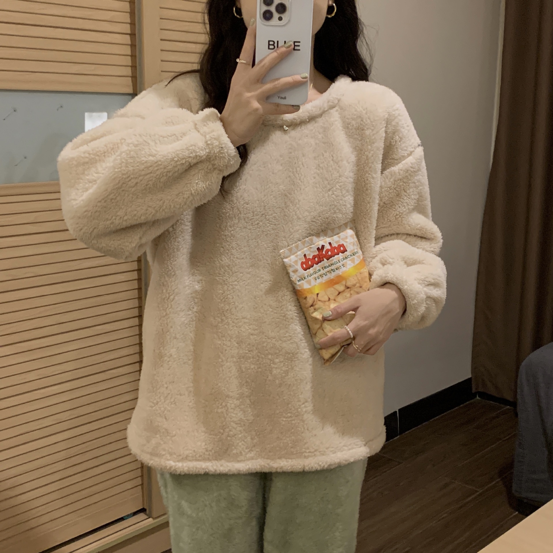 여성용 겨울 잠옷, 산호 벨벳, 두꺼운 라운드 넥, 심플한 루즈한 솔리드 컬러, 기숙사에서 착용 가능, 홈웨어 세트