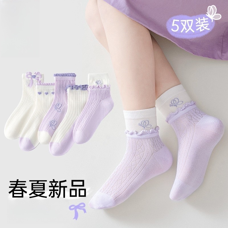어린이 양말, 여아 여름용 얇은 면 양말, A급 냄새 방지 및 땀 흡수 기능, 통기성 좋은 무봉제 중목 양말, 중소형 어린이용