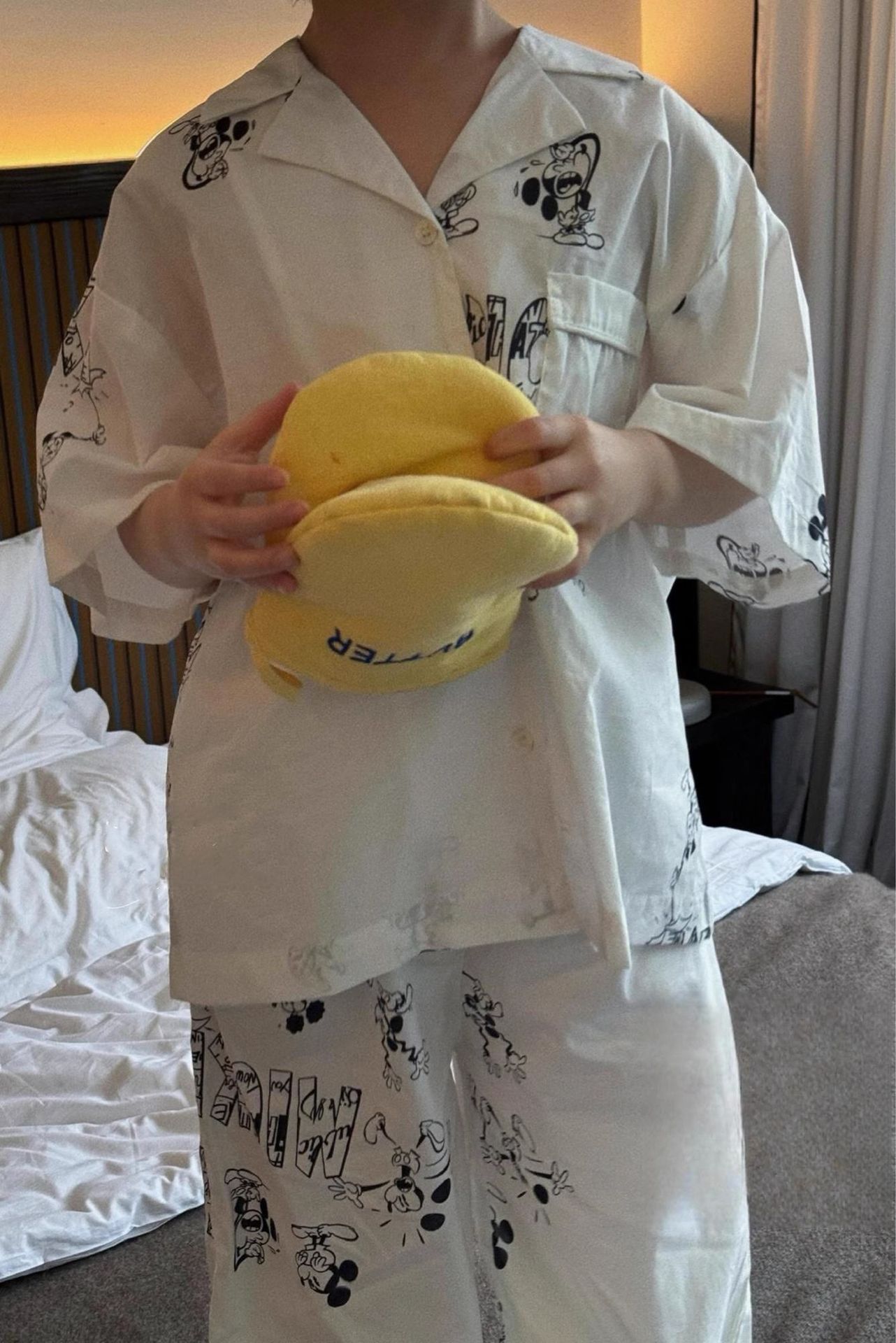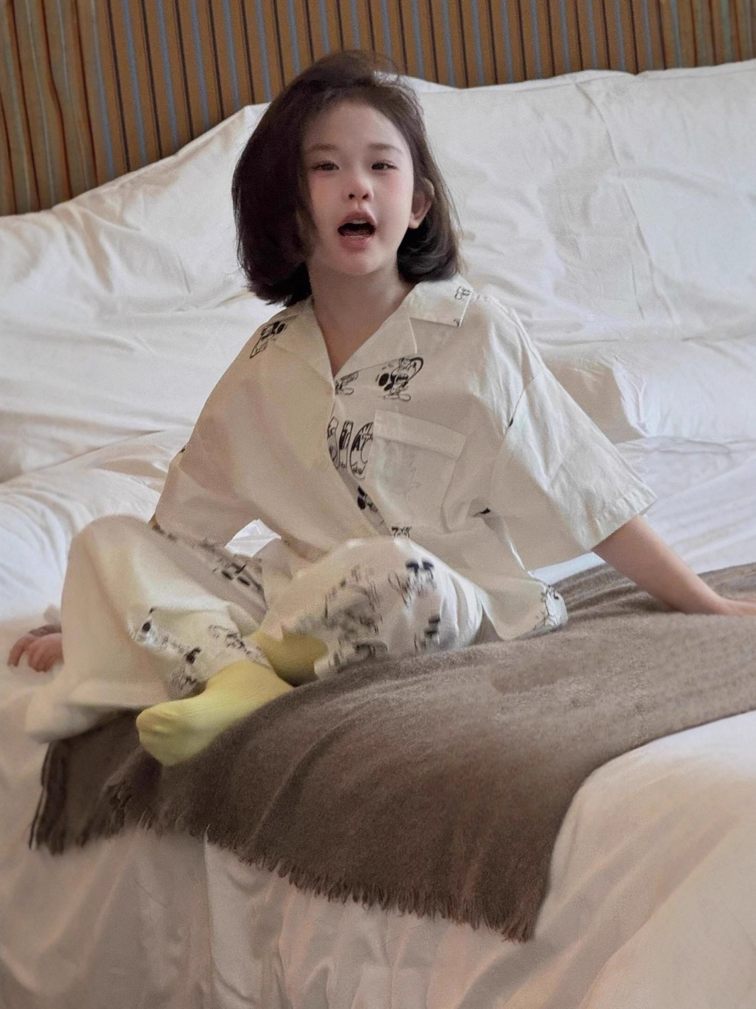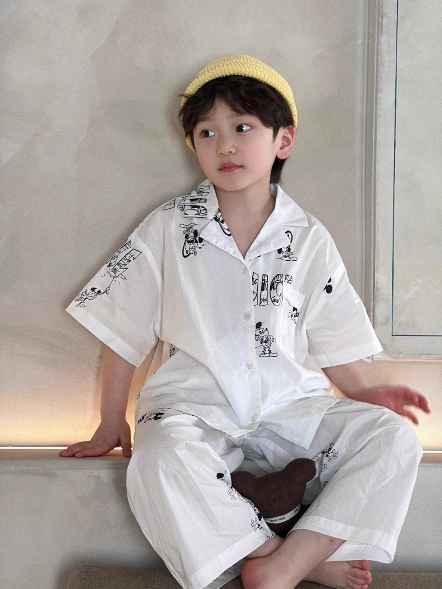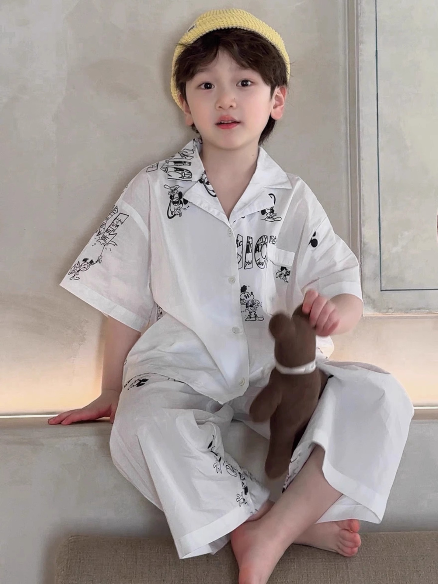 봄 여름 남녀 아동 잠옷, 만화 반팔 바지, 편안한 면 느낌의 에어컨 의류, 야외에서 착용 가능, 가정복 세트스토어 가기