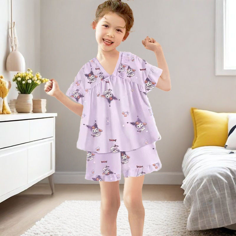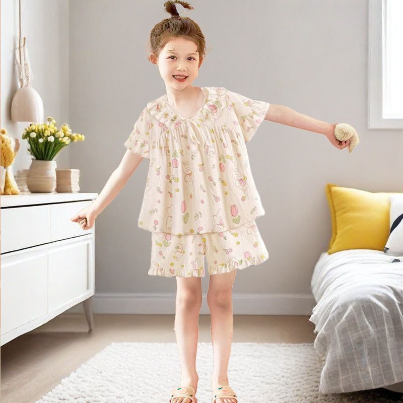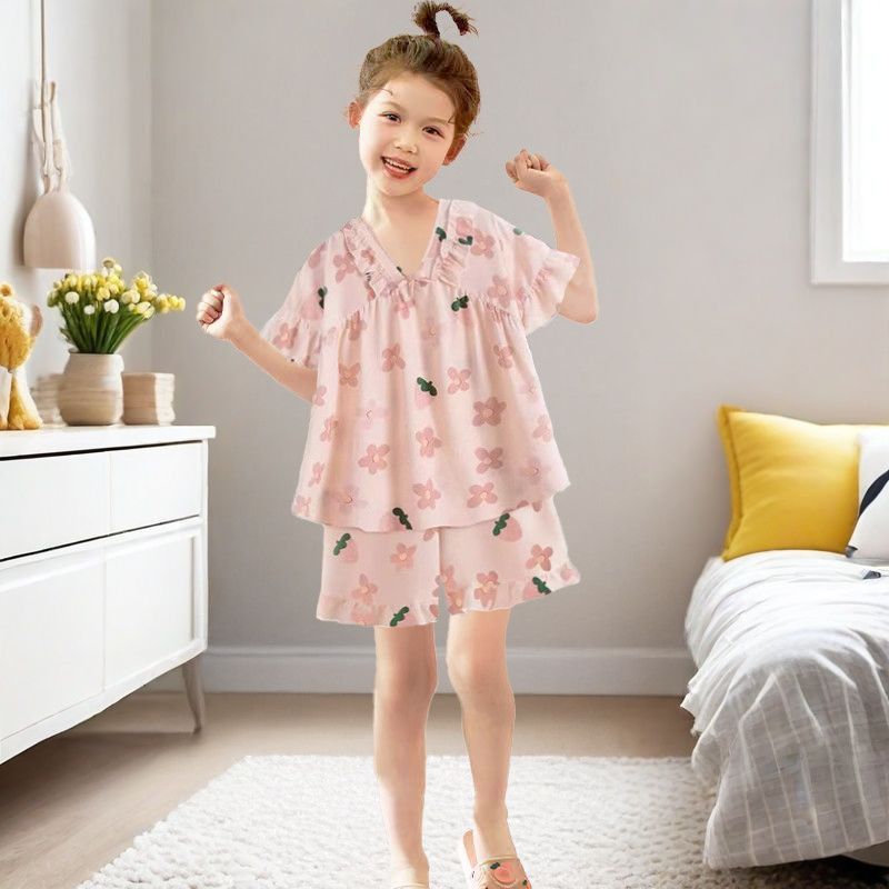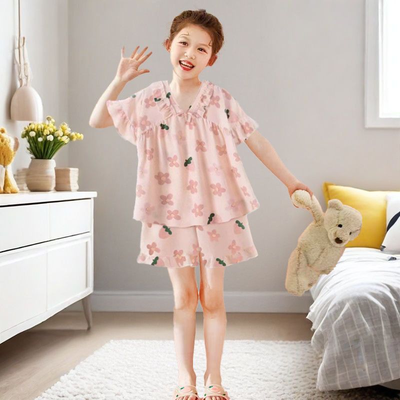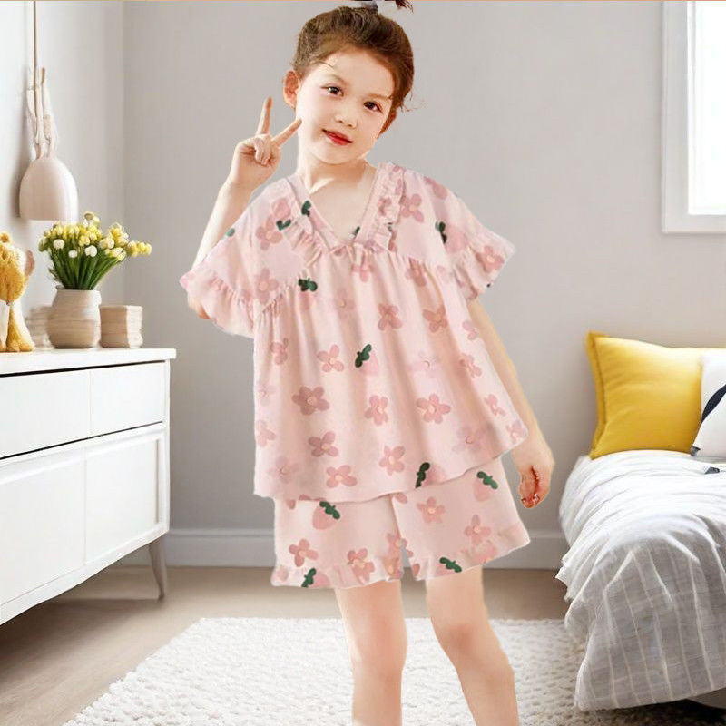 어린이와 소녀를위한 잠옷, 얇은 반팔 공주 스타일, 어린 소녀, 중대형 어린이 베이비 슈트, 여름 가정복, 얼음 실크스토어 가기
