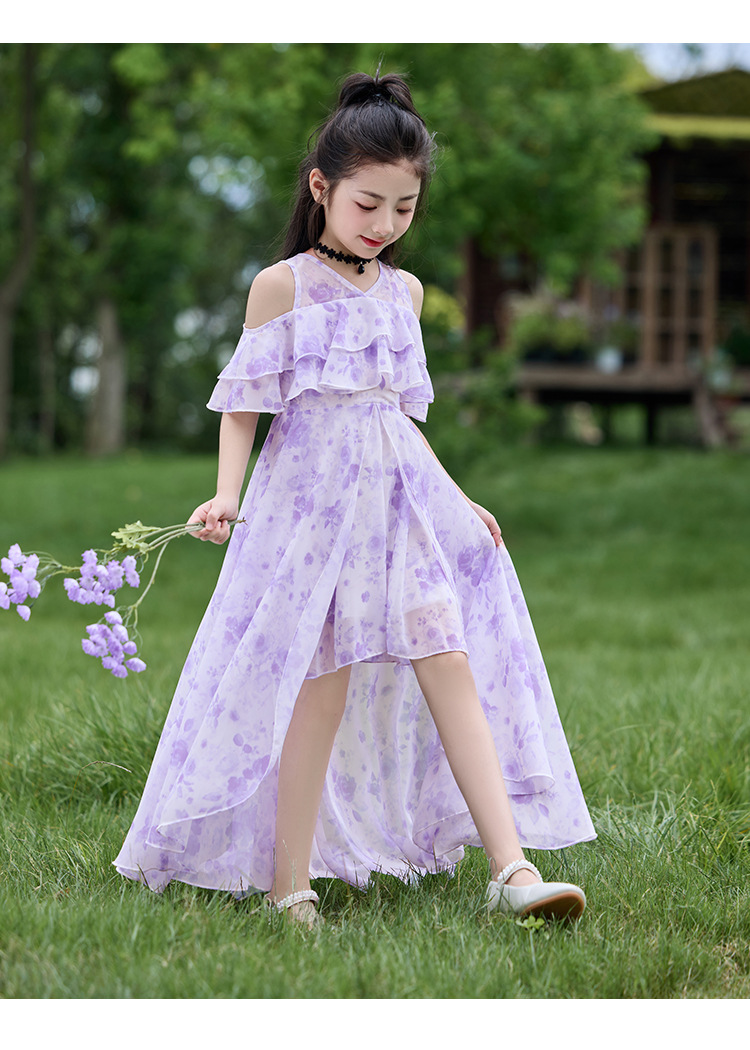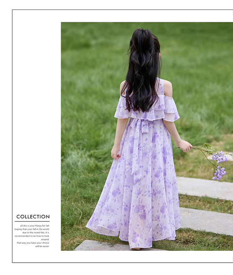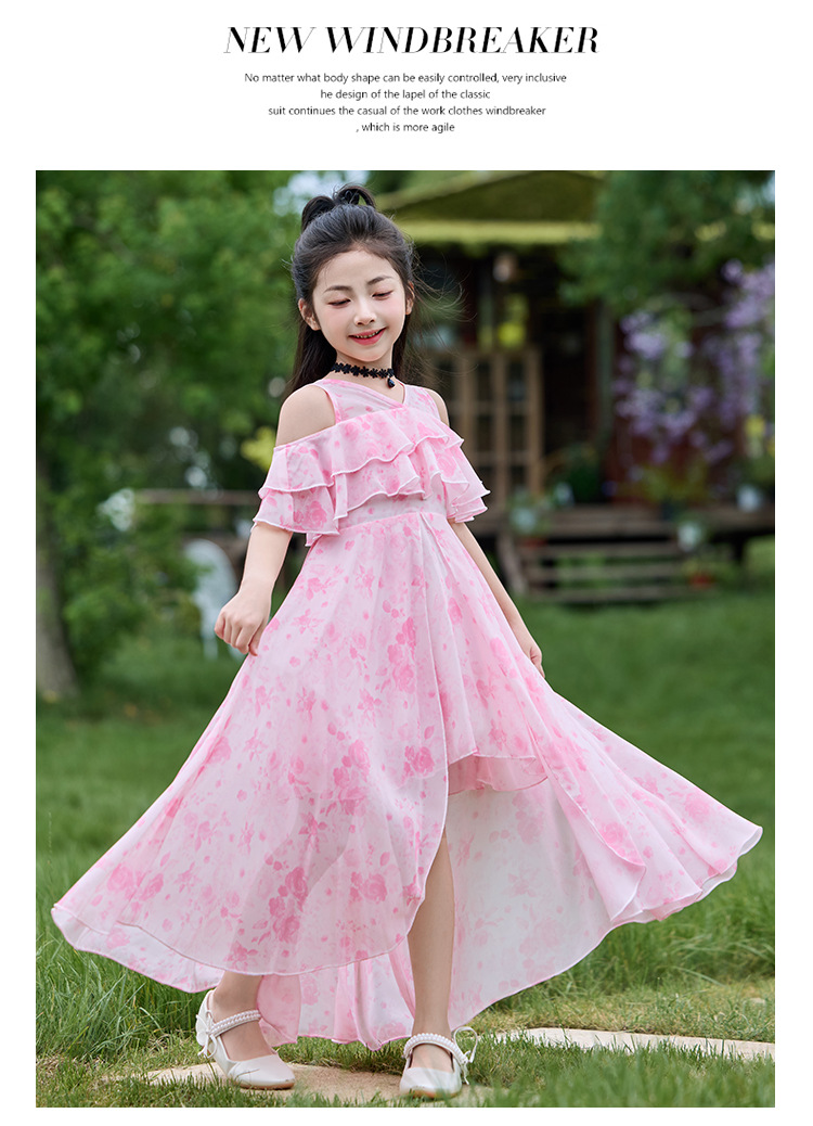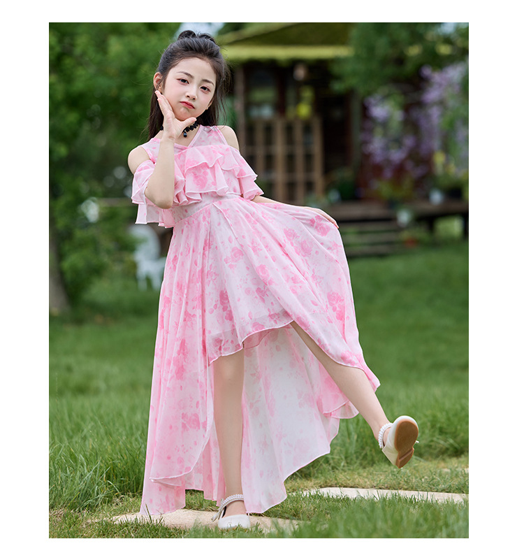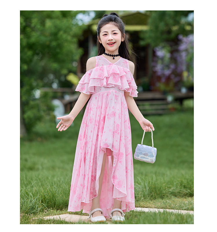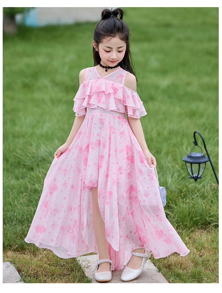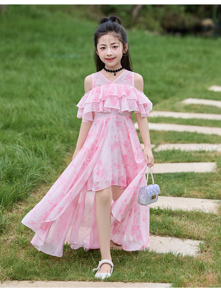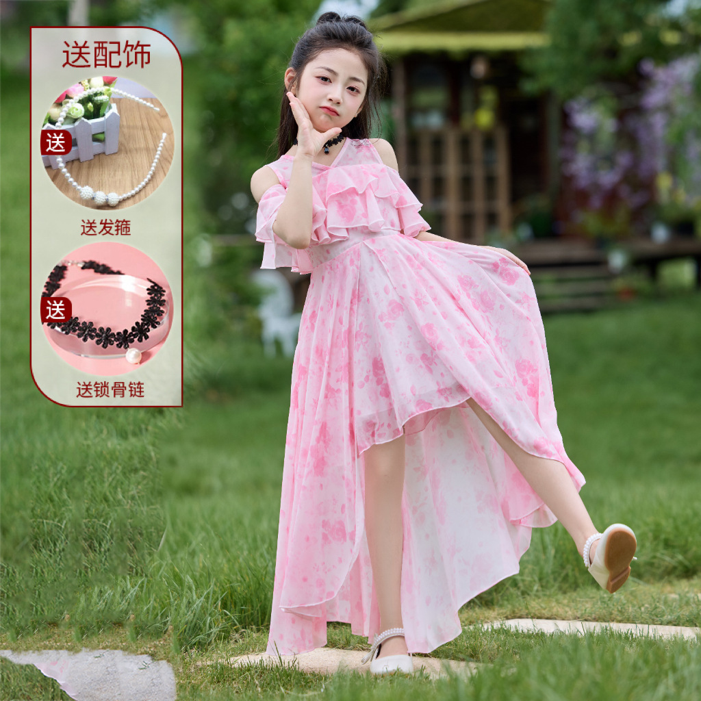 여자 여름 꽃무늬 드레스 2025 새로운 스타일 유행 해변 스커트 서양식 테일 쉬폰 오프 숄더 스커트