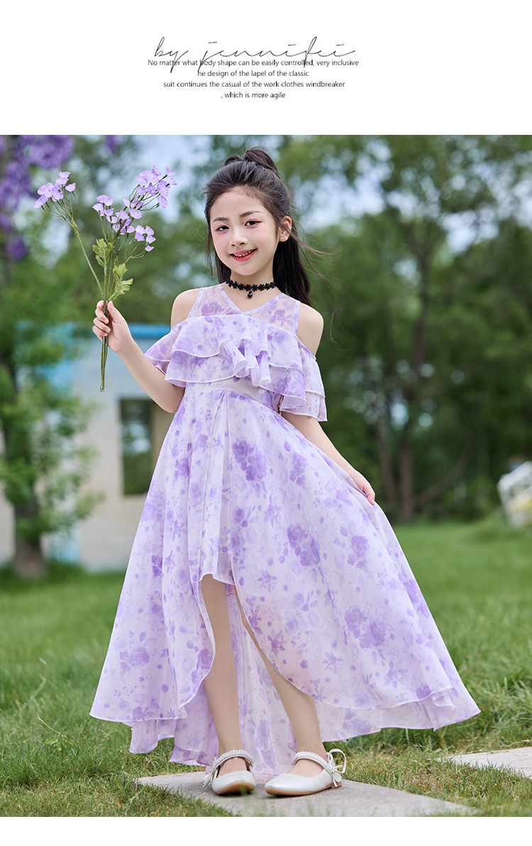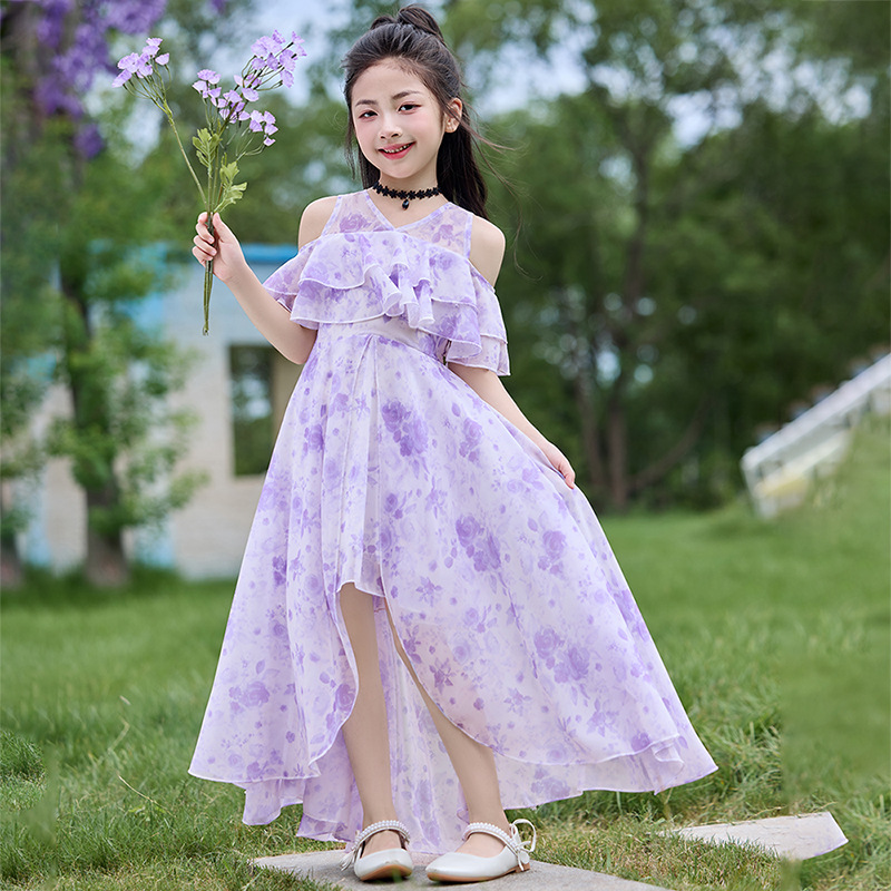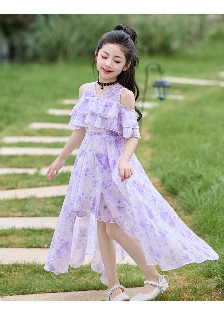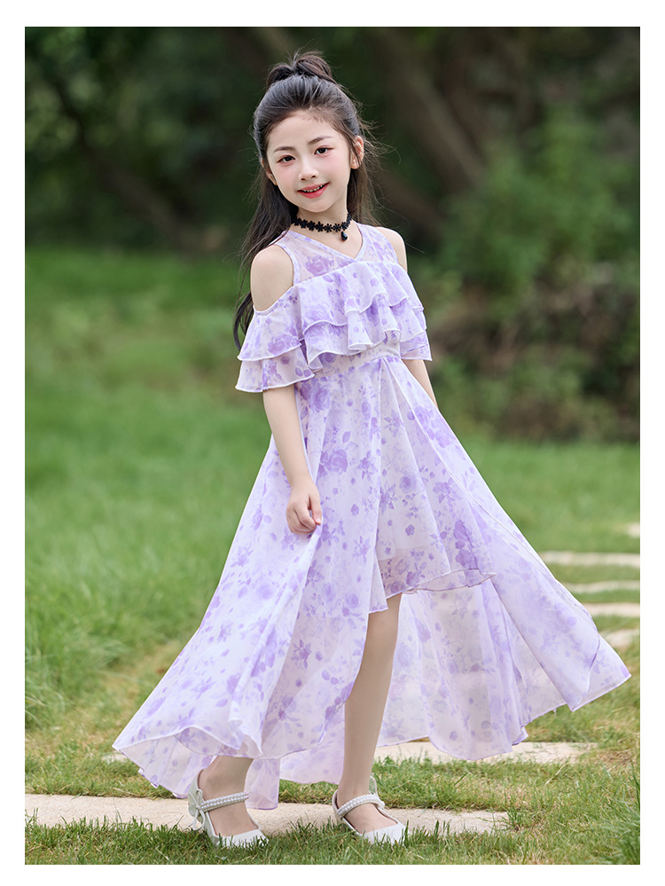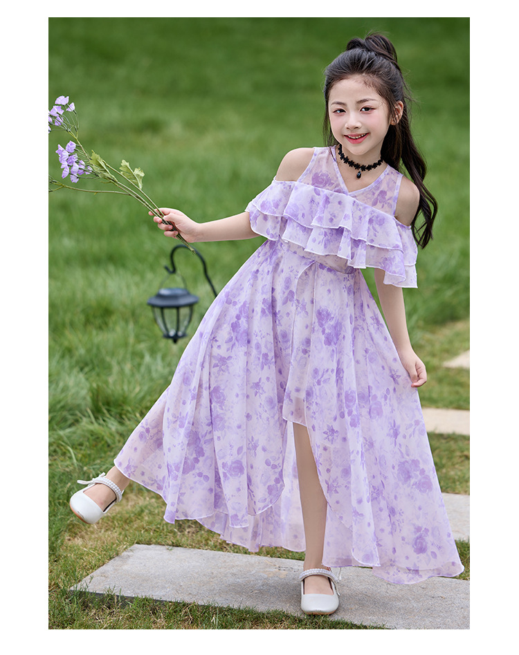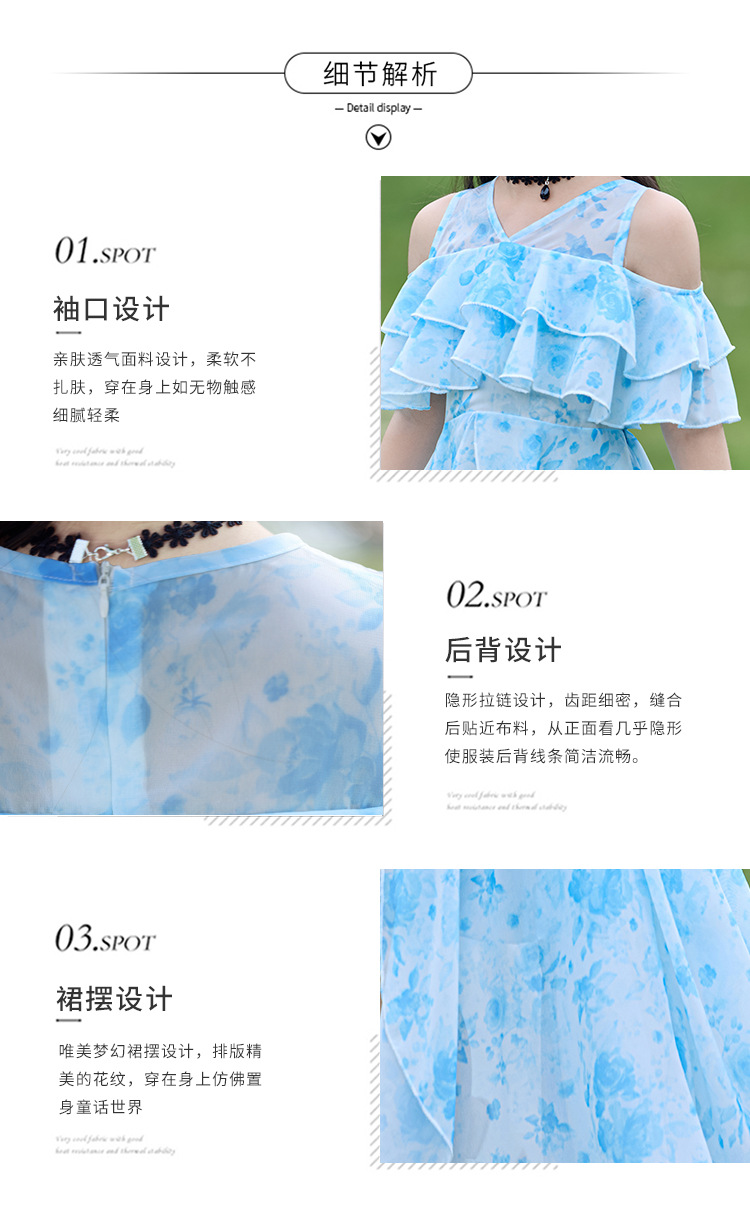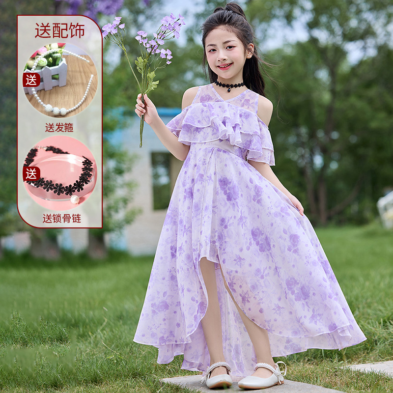 여자 여름 꽃무늬 드레스 2025 새로운 스타일 유행 해변 스커트 서양식 테일 쉬폰 오프 숄더 스커트