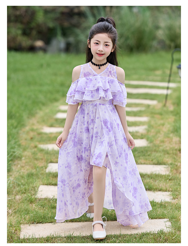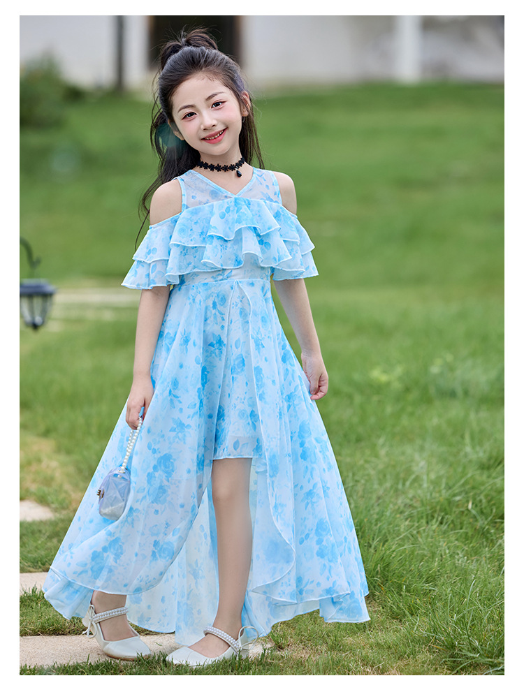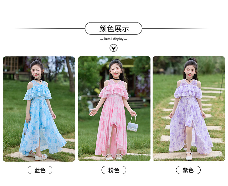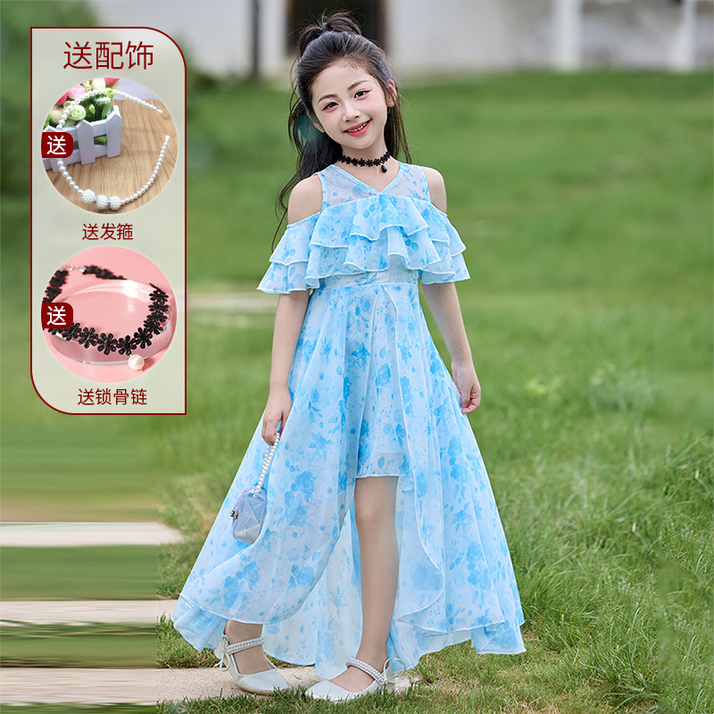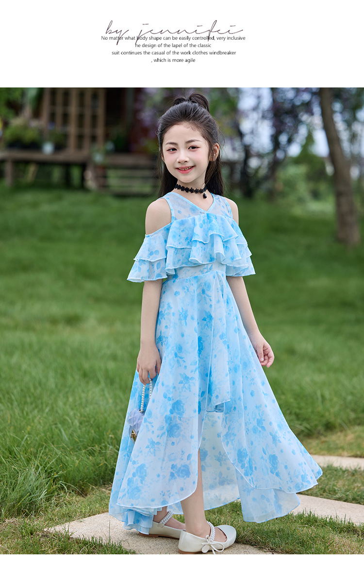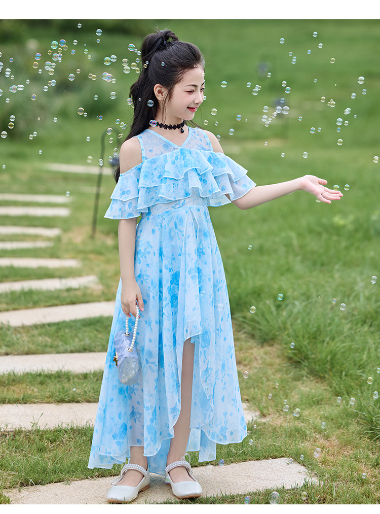 여자 여름 꽃무늬 드레스 2025 새로운 스타일 유행 해변 스커트 서양식 테일 쉬폰 오프 숄더 스커트스토어 가기