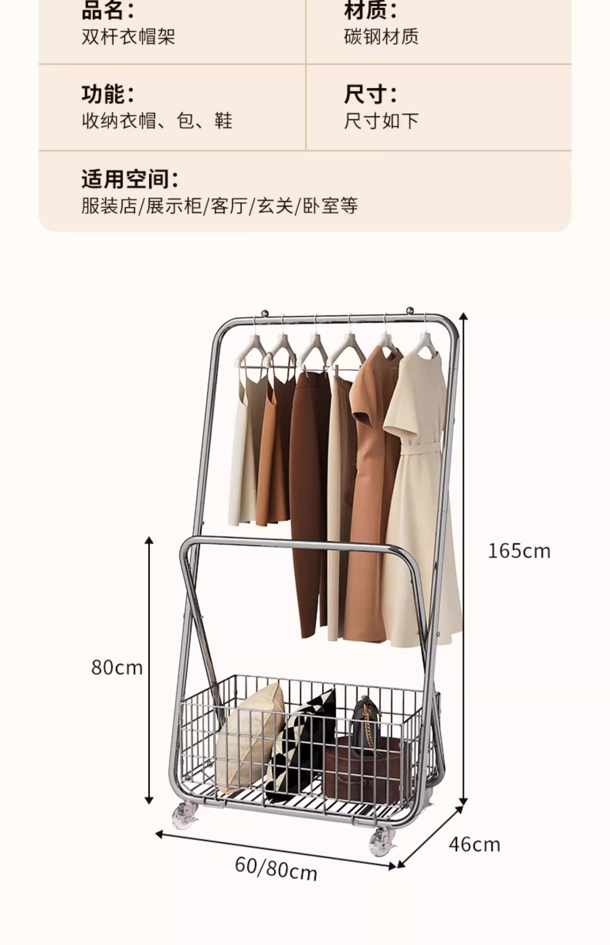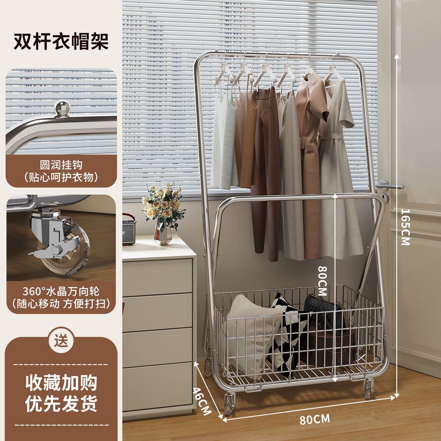 • 더블 폴 코트 랙 - 80cm 크리스탈 실버 - 크리스탈 유니버설 휠