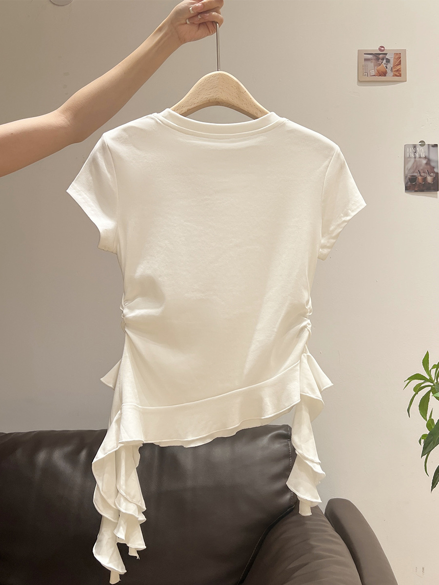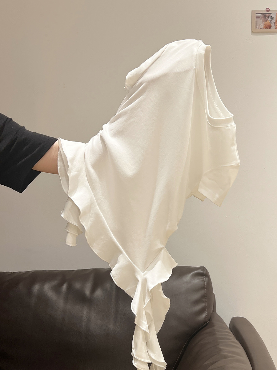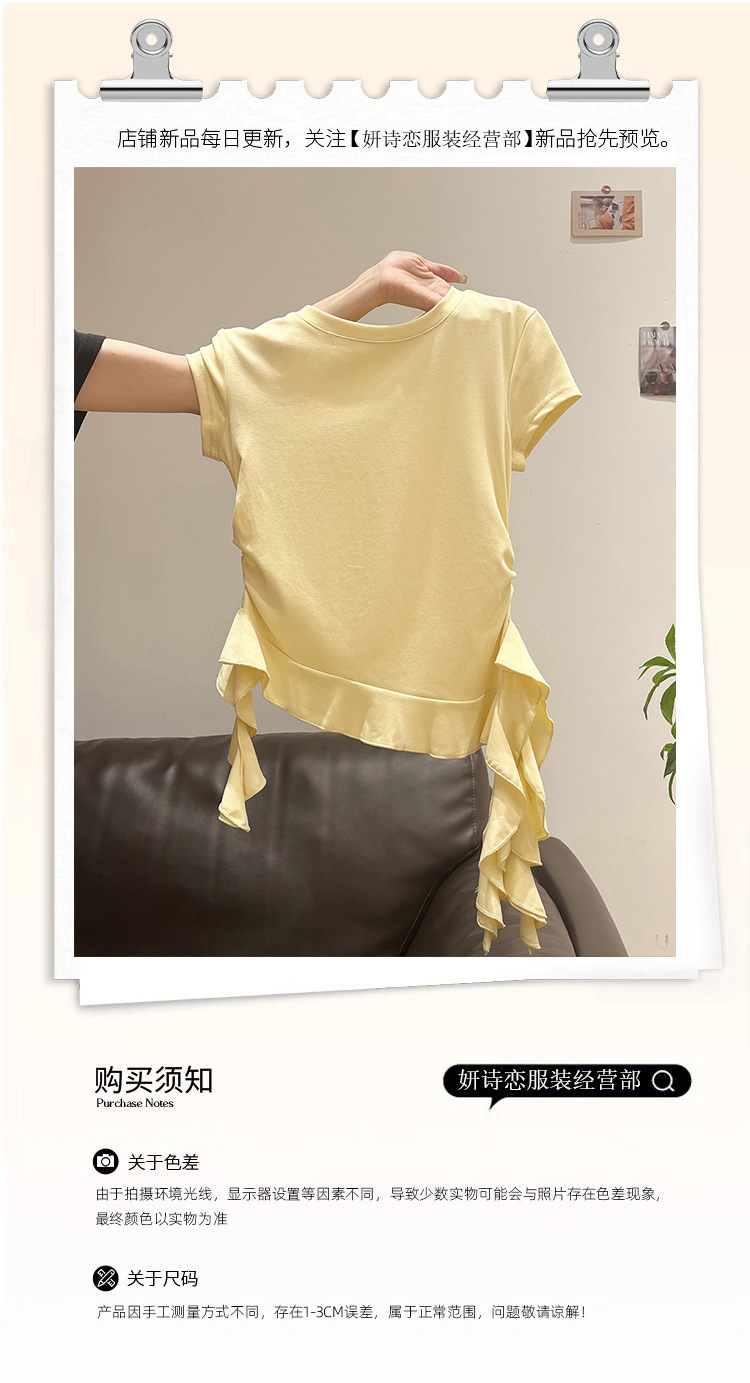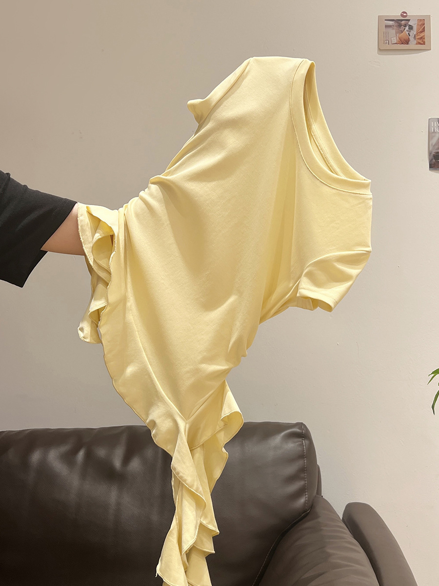 밀크 옐로우 라운드 넥 오른쪽 어깨 반팔 티셔츠 여성 2025 여름 새로운 스타일 불규칙한 밑단 프릴 슬림 탑스토어 가기