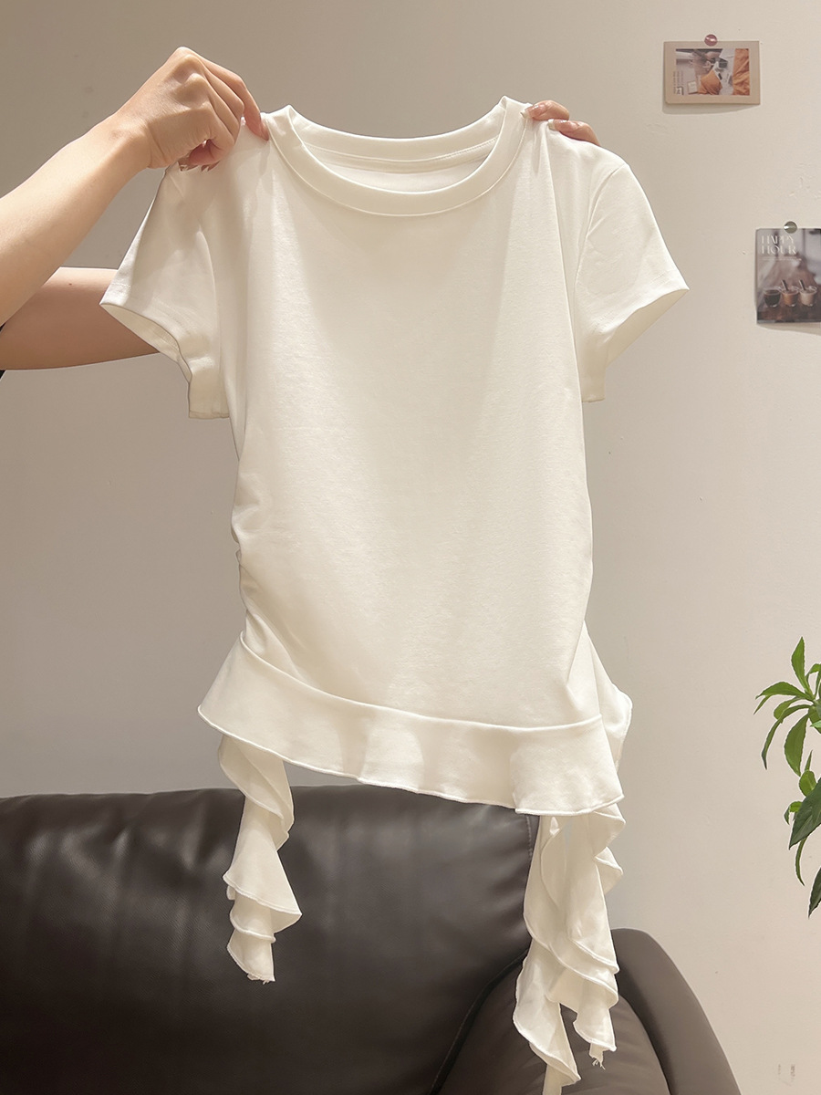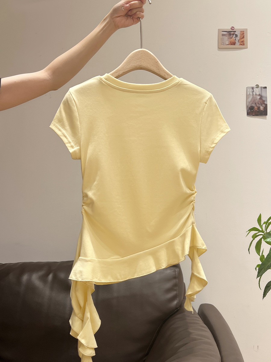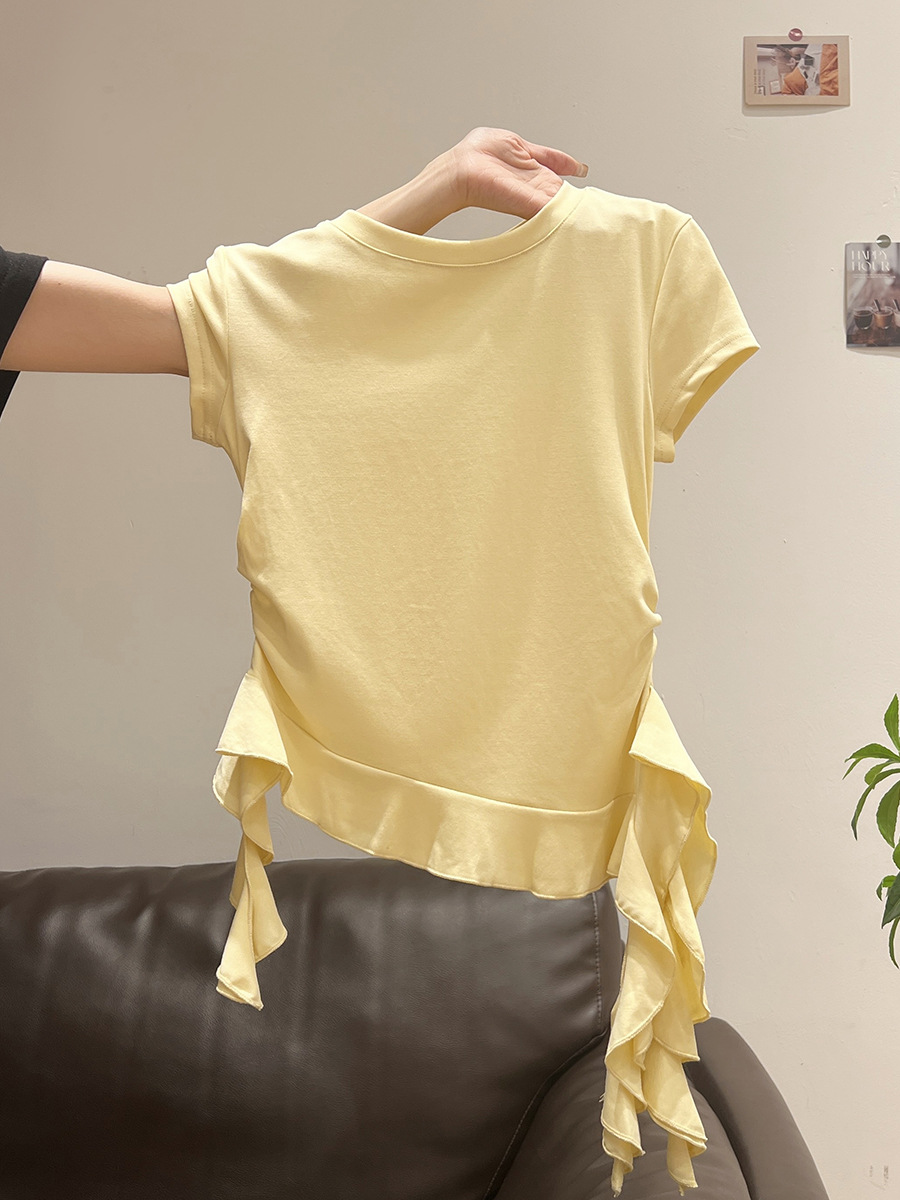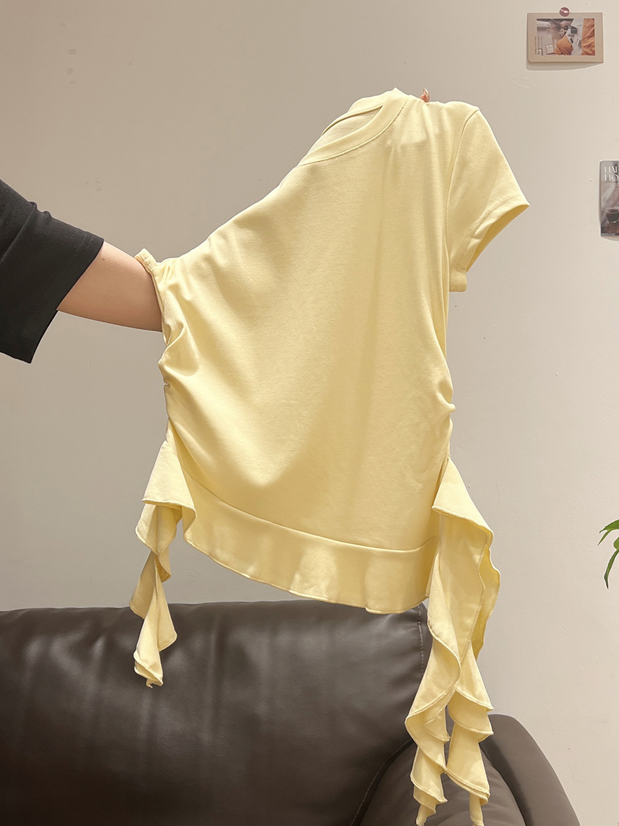 밀크 옐로우 라운드 넥 오른쪽 어깨 반팔 티셔츠 여성 2025 여름 새로운 스타일 불규칙한 밑단 프릴 슬림 탑