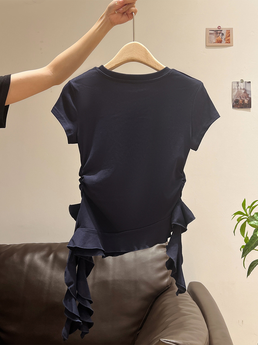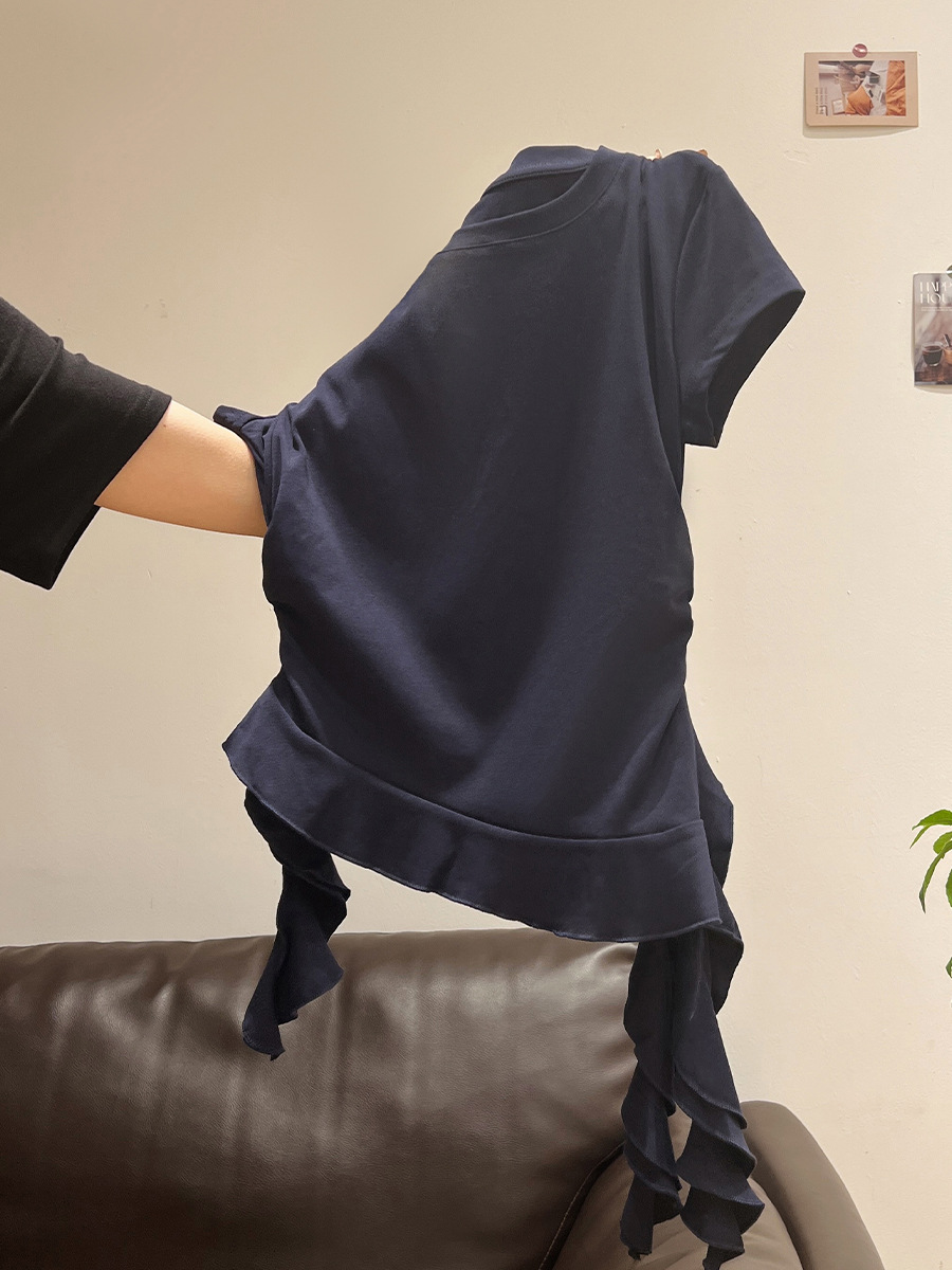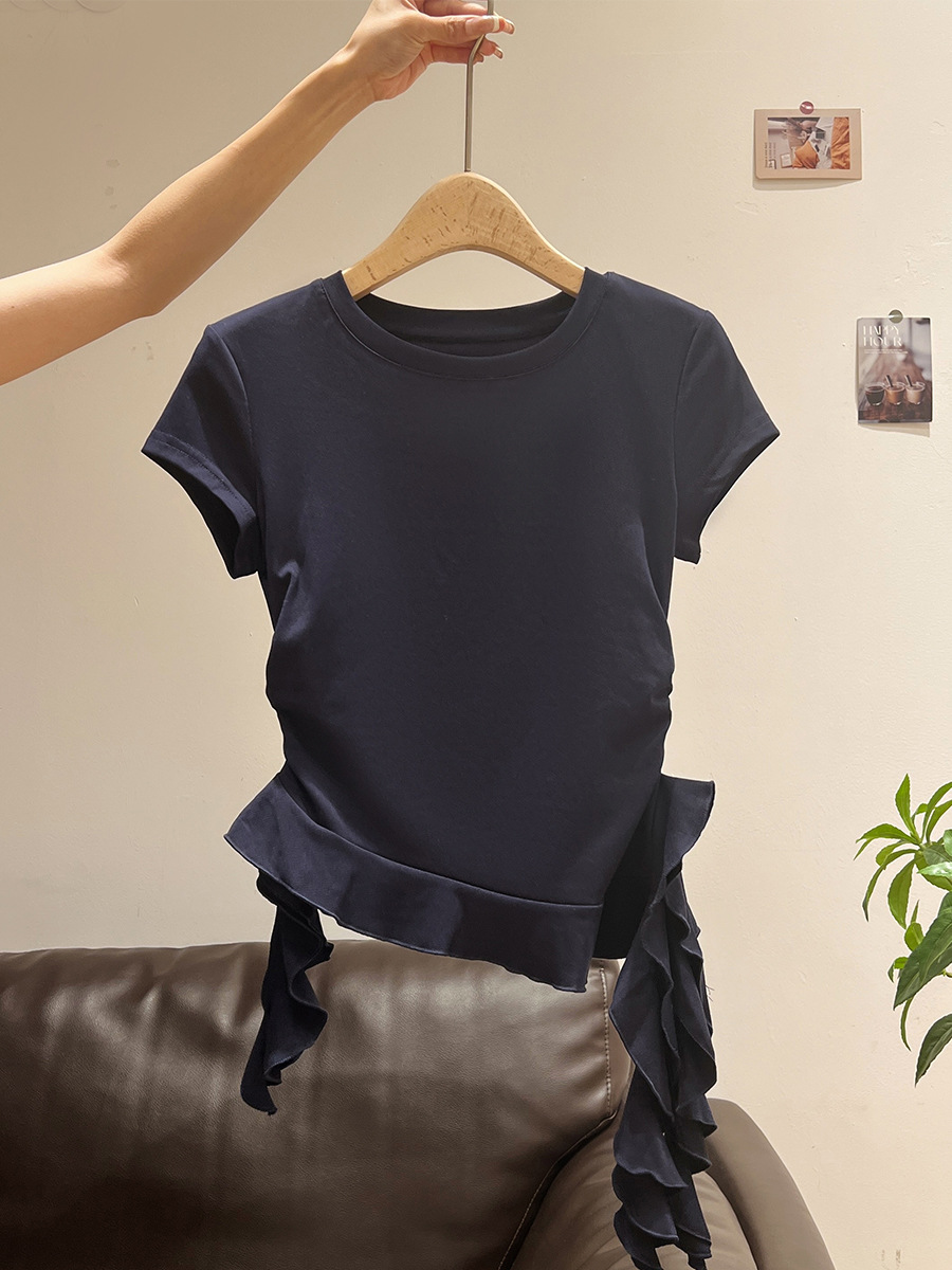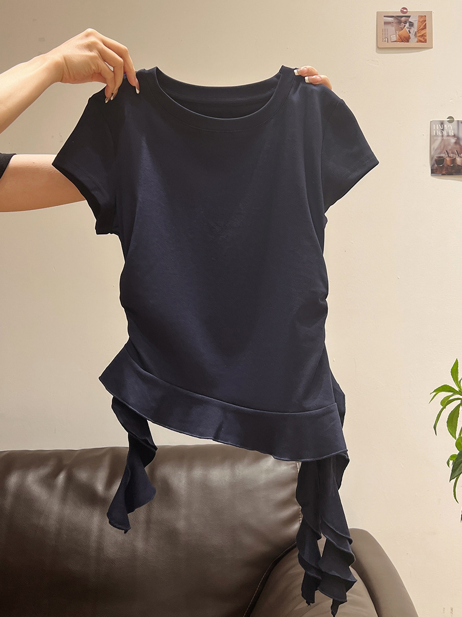 밀크 옐로우 라운드 넥 오른쪽 어깨 반팔 티셔츠 여성 2025 여름 새로운 스타일 불규칙한 밑단 프릴 슬림 탑