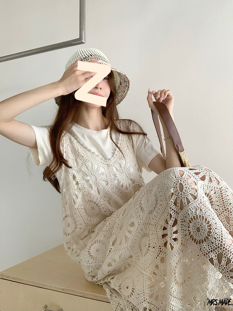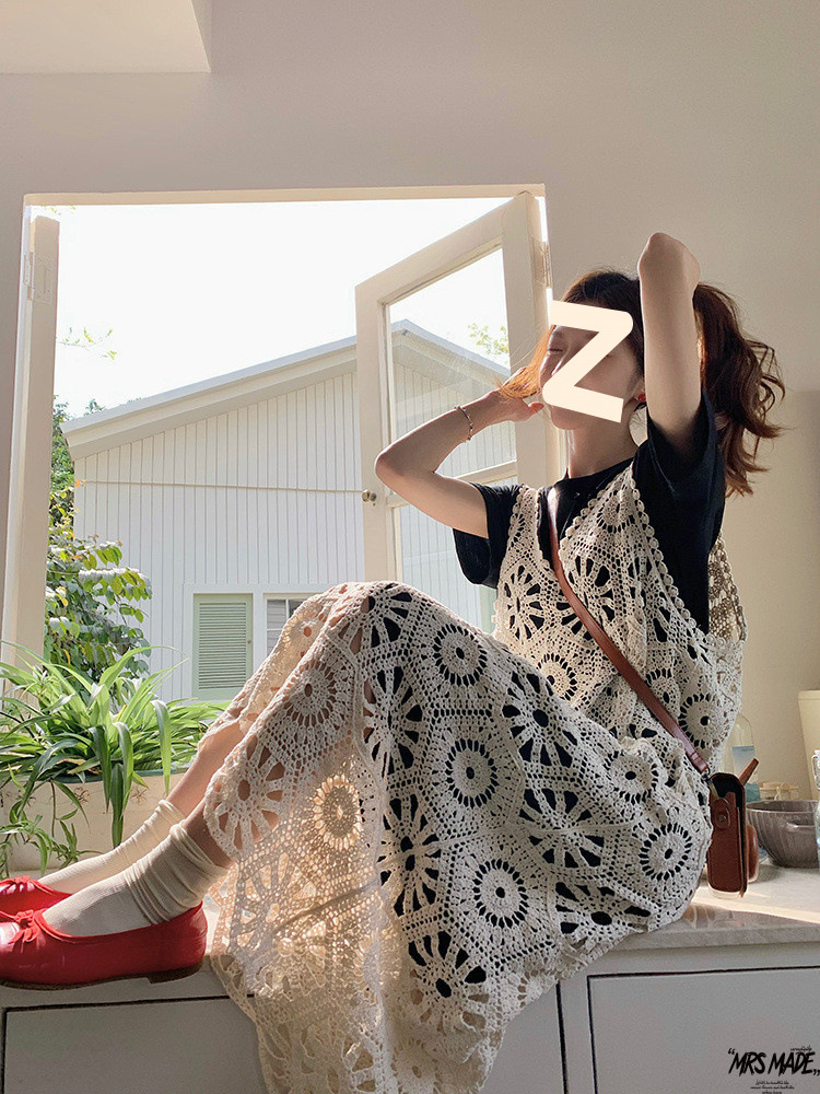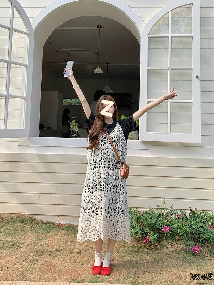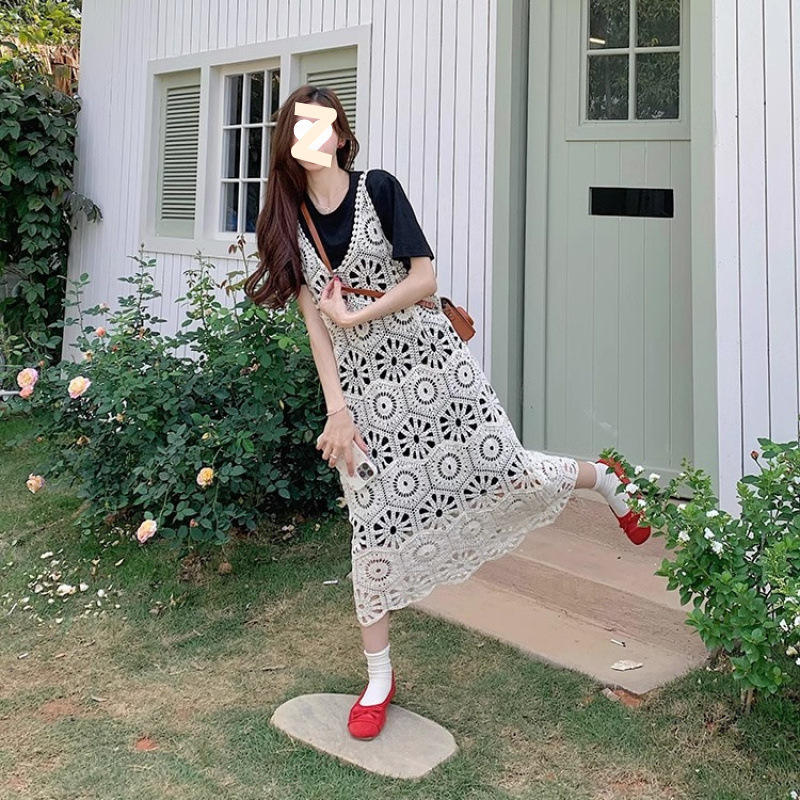 Fat MM 플러스 사이즈 150kg 여름 복고풍 레이어드 크로 셰 뜨개질 중공 드레스 + 여성용 블랙 티셔츠 드레스 투피스 슈트 2