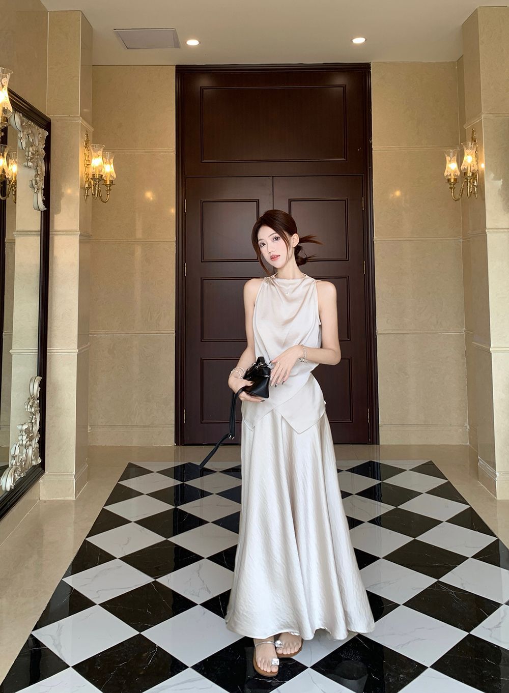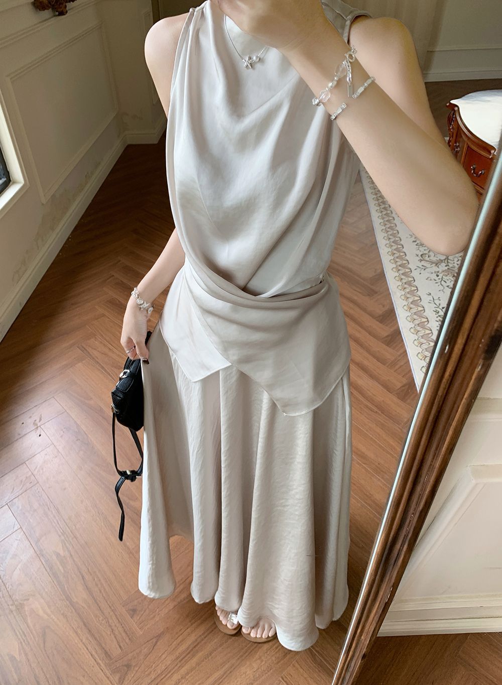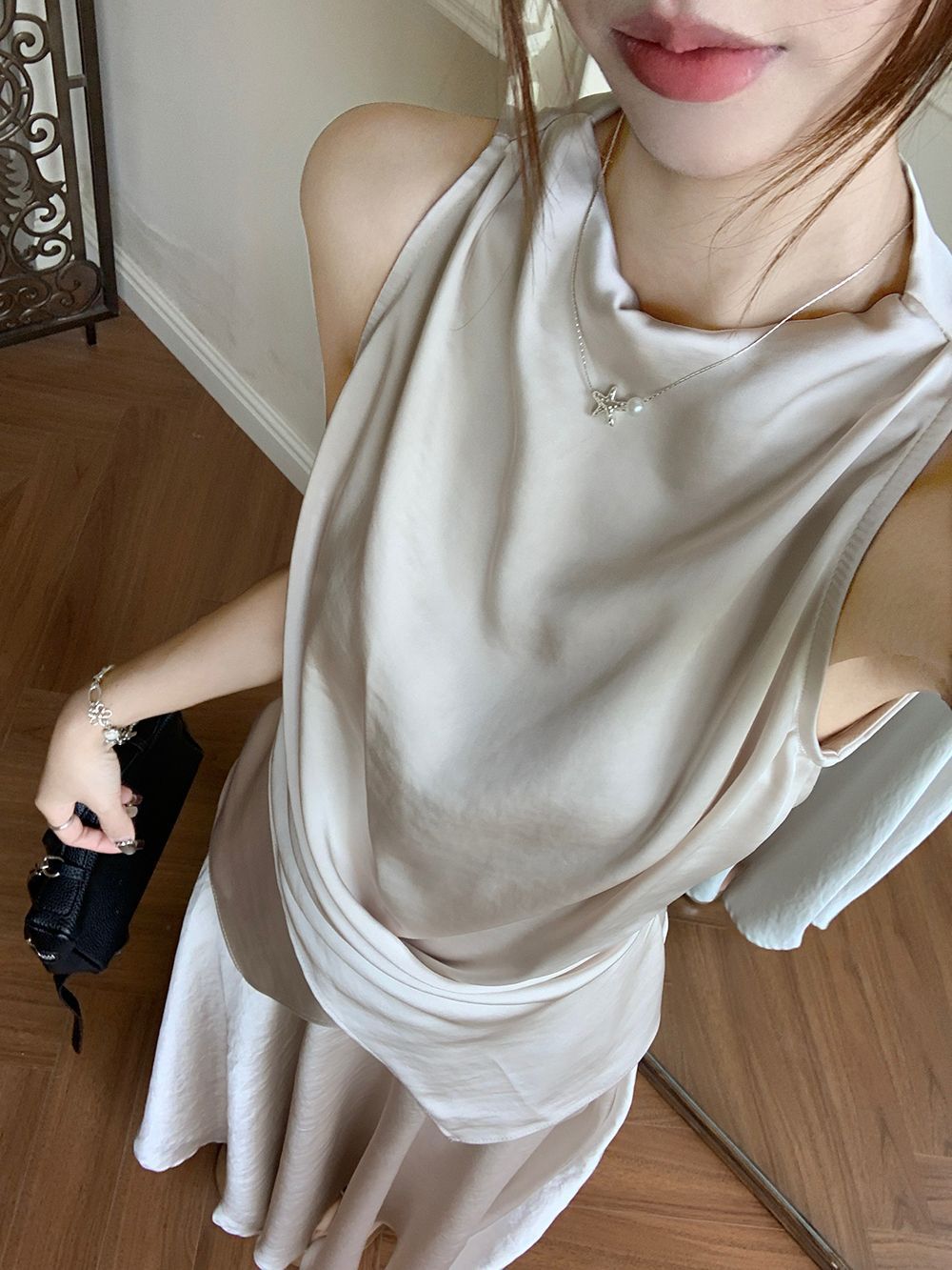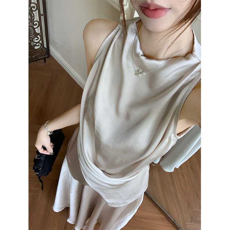 여성 트렌디 통근을 위한 새로운 여름 패션 투피스 세트, 불규칙한 레이스업 디자인 새틴 조끼 스커트스토어 가기