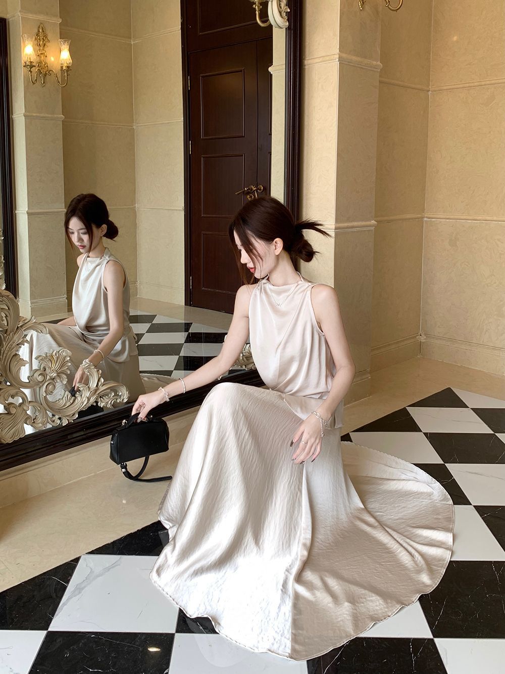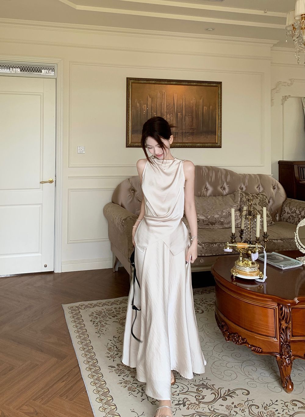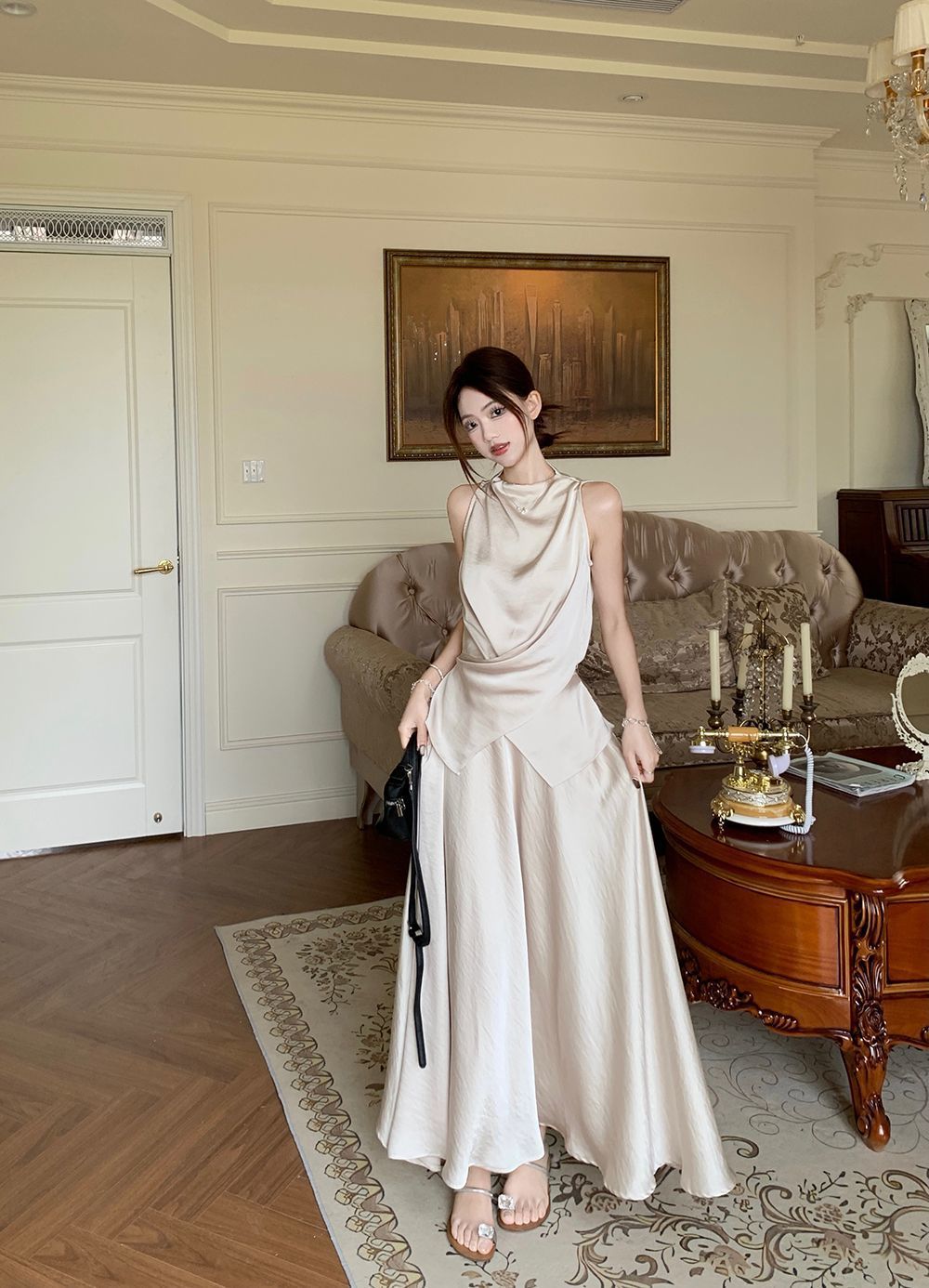 여성 트렌디 통근을 위한 새로운 여름 패션 투피스 세트, 불규칙한 레이스업 디자인 새틴 조끼 스커트스토어 가기