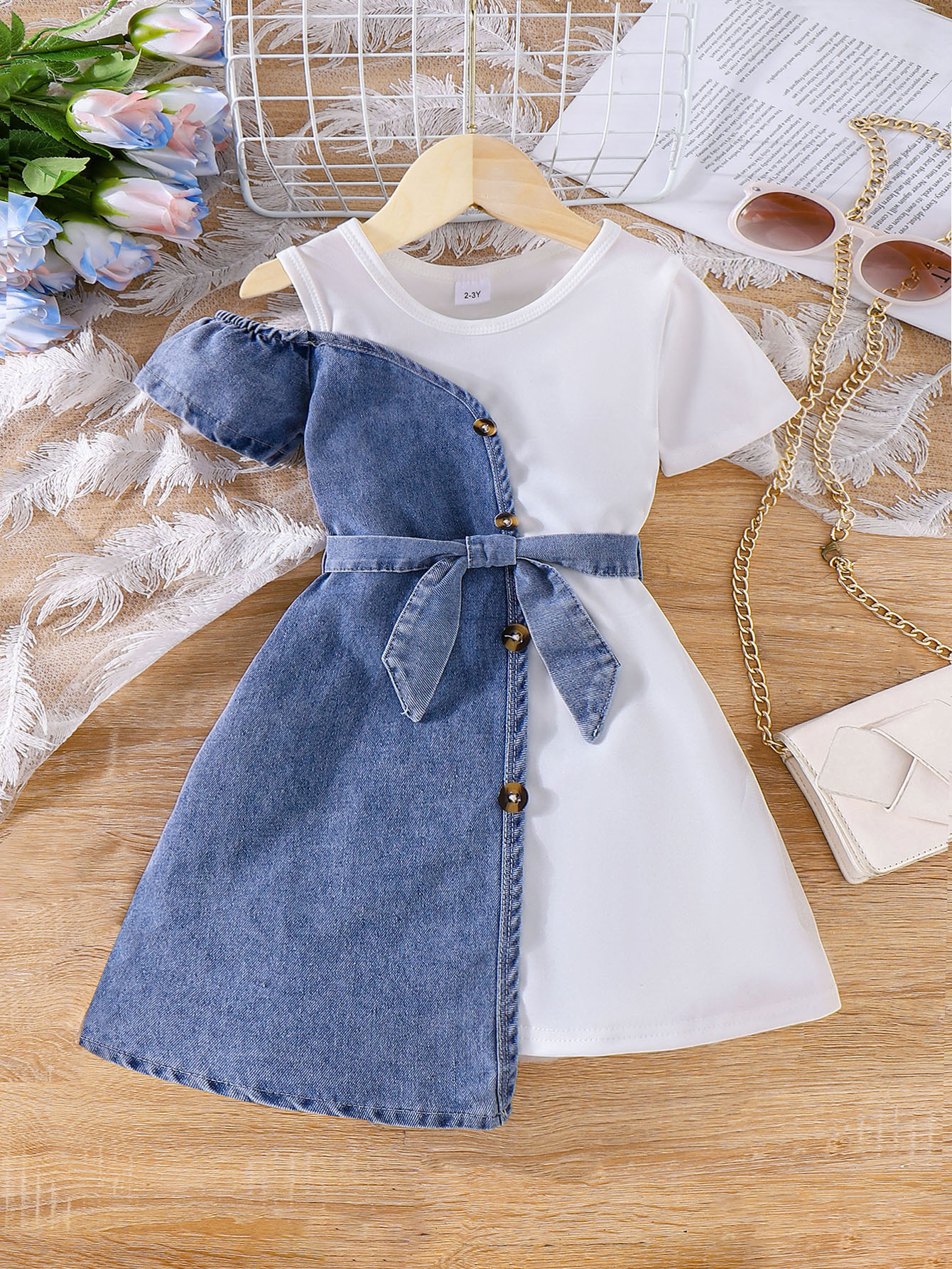 2025 크로스보더 여름 유럽과 미국 스타일의 어린이 스플라이스 데님 반팔 불규칙 드레스 + 벨트 투피스 세트