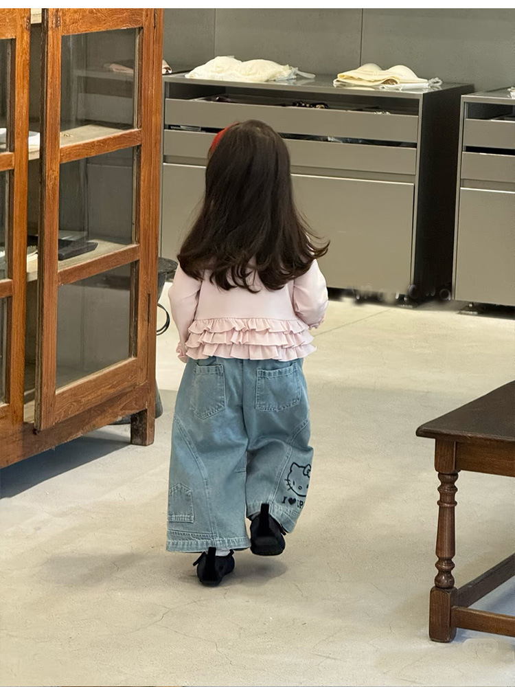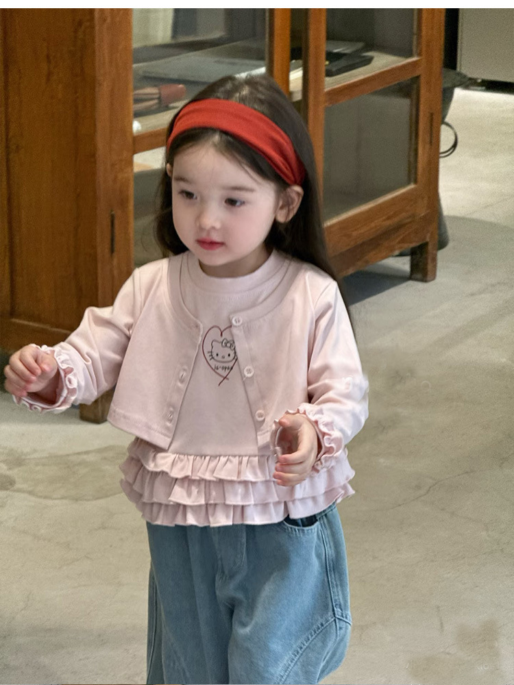 2025 새로운 가을 어린이 정장 소녀와 어린이 한국 스타일 KT 고양이 프릴 가짜 투피스 티셔츠 와이드 레그 데님스토어 가기