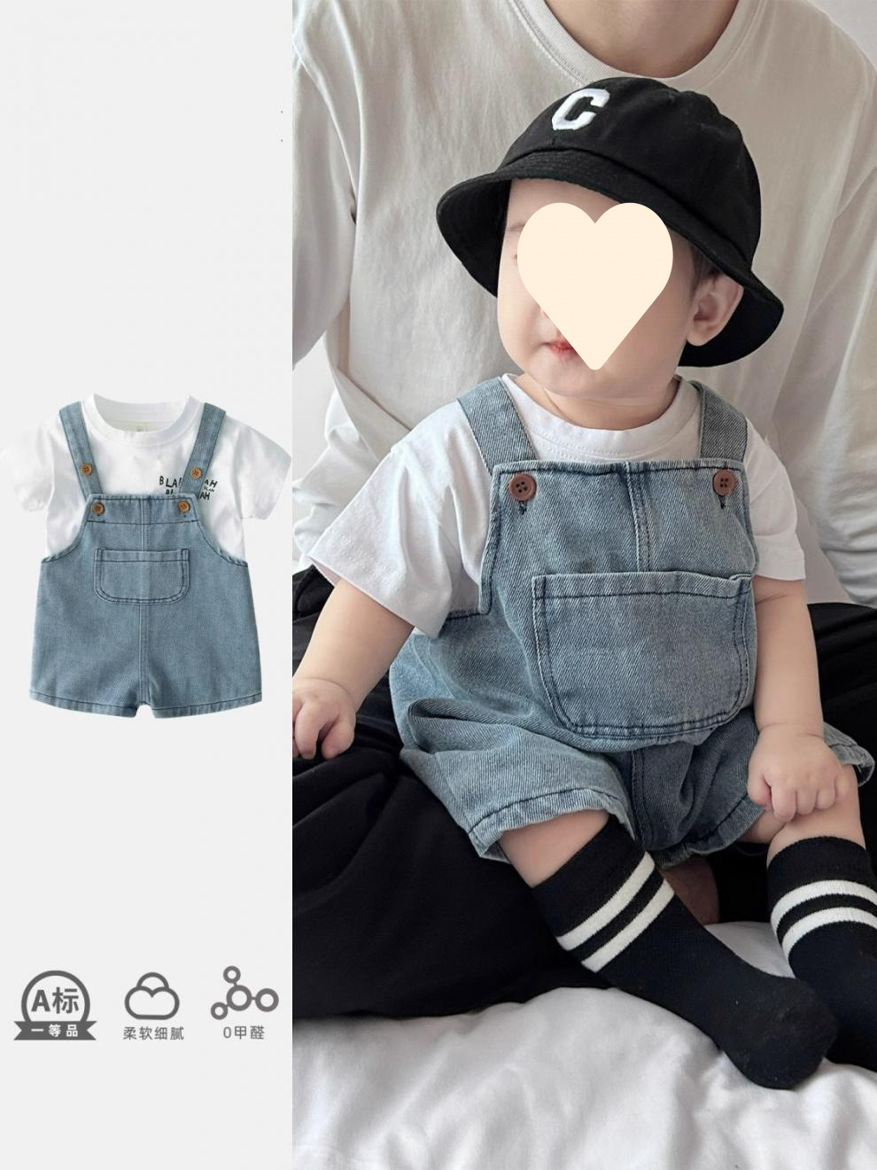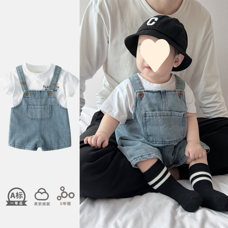 베이비 슈트 여름 베이비 데님 서스펜더 옷 여름 옷 귀여운 유아 아동복 여름 소년 투피스 세트