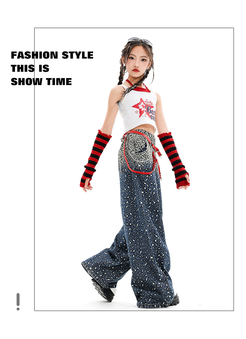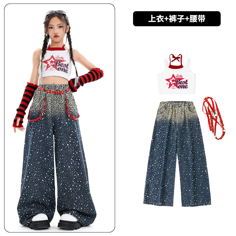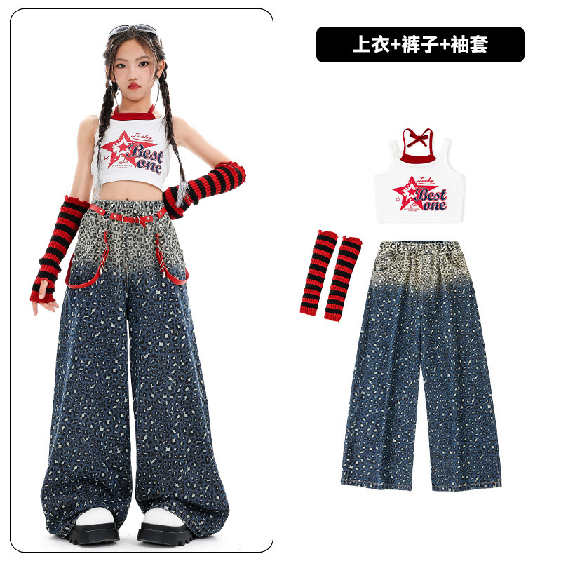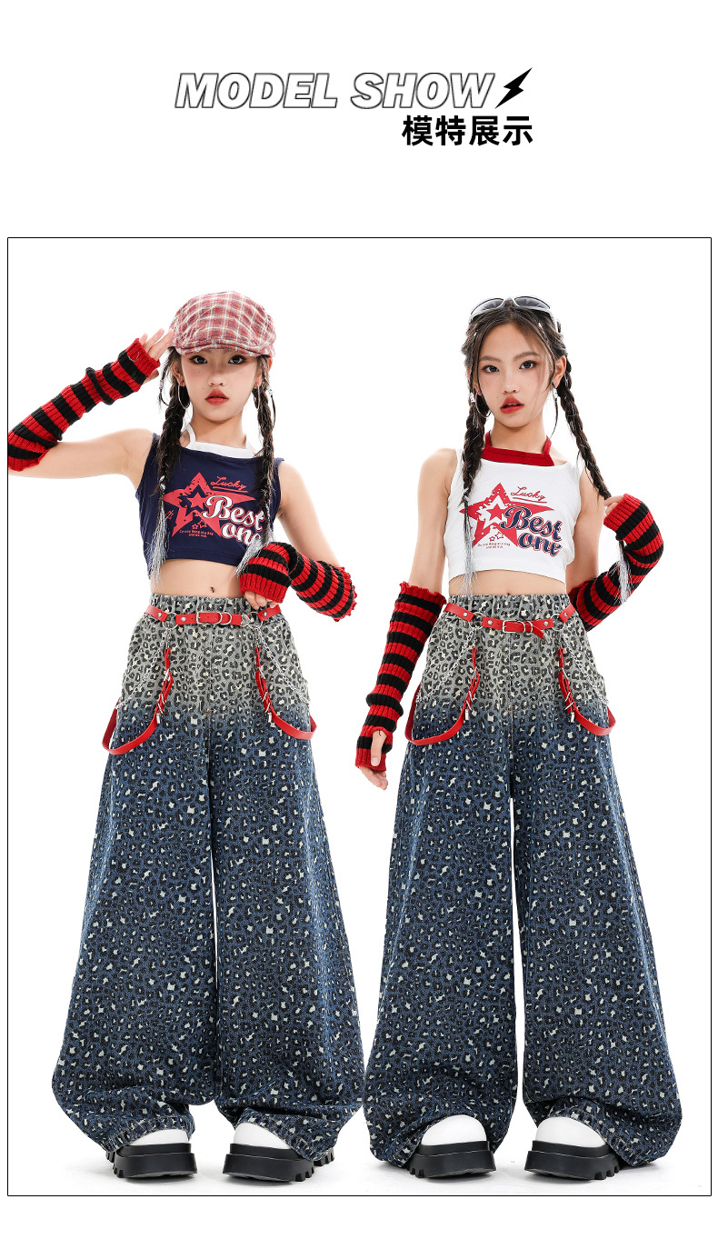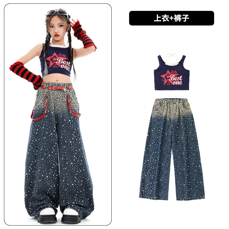 여자 재즈 댄스 의상 패션쇼 크롭 탑 레오파드 청바지 정장 스트리트 걸스 스트리트 댄스 공연 의상 여름