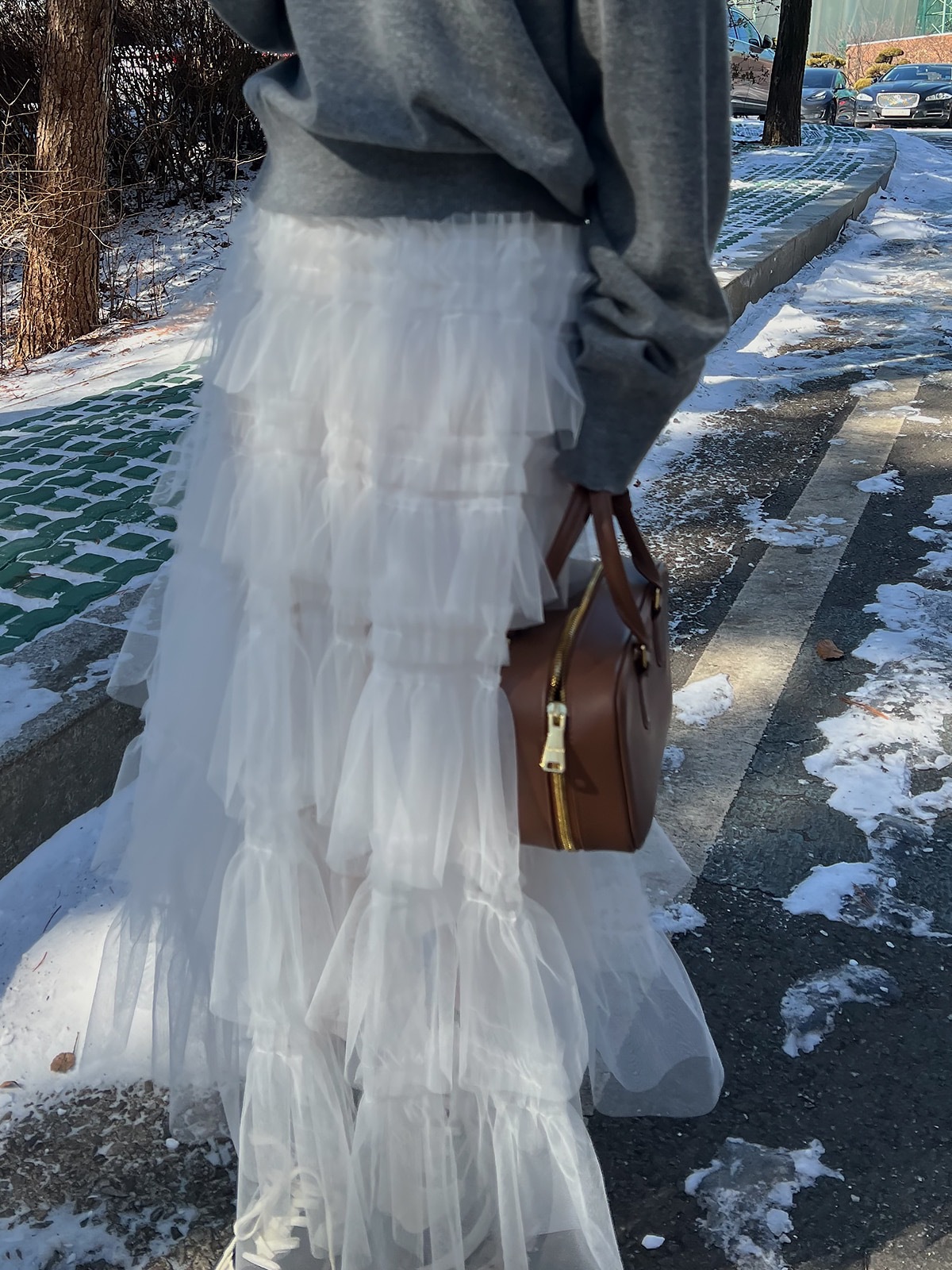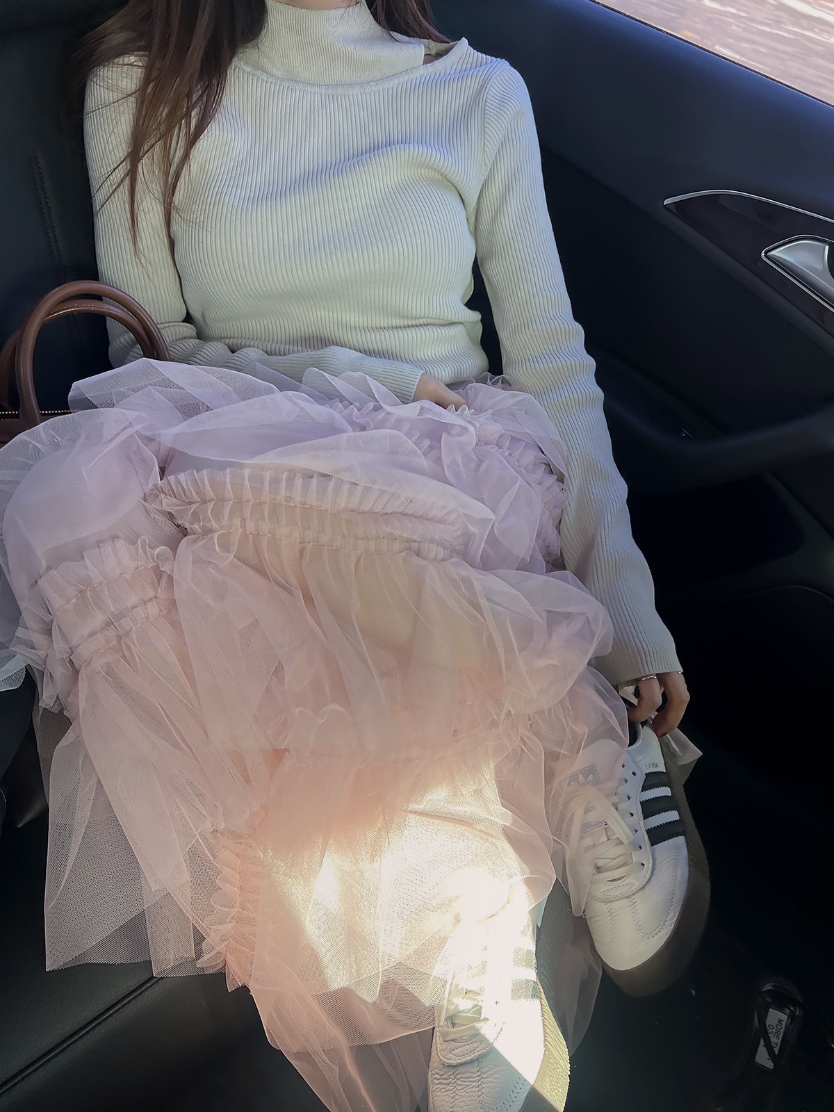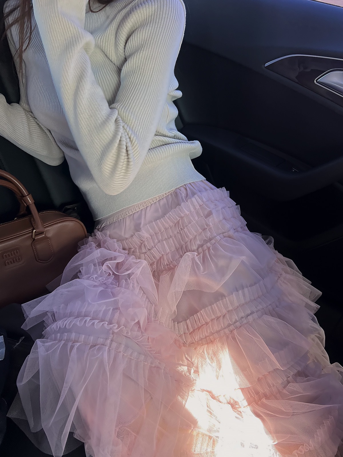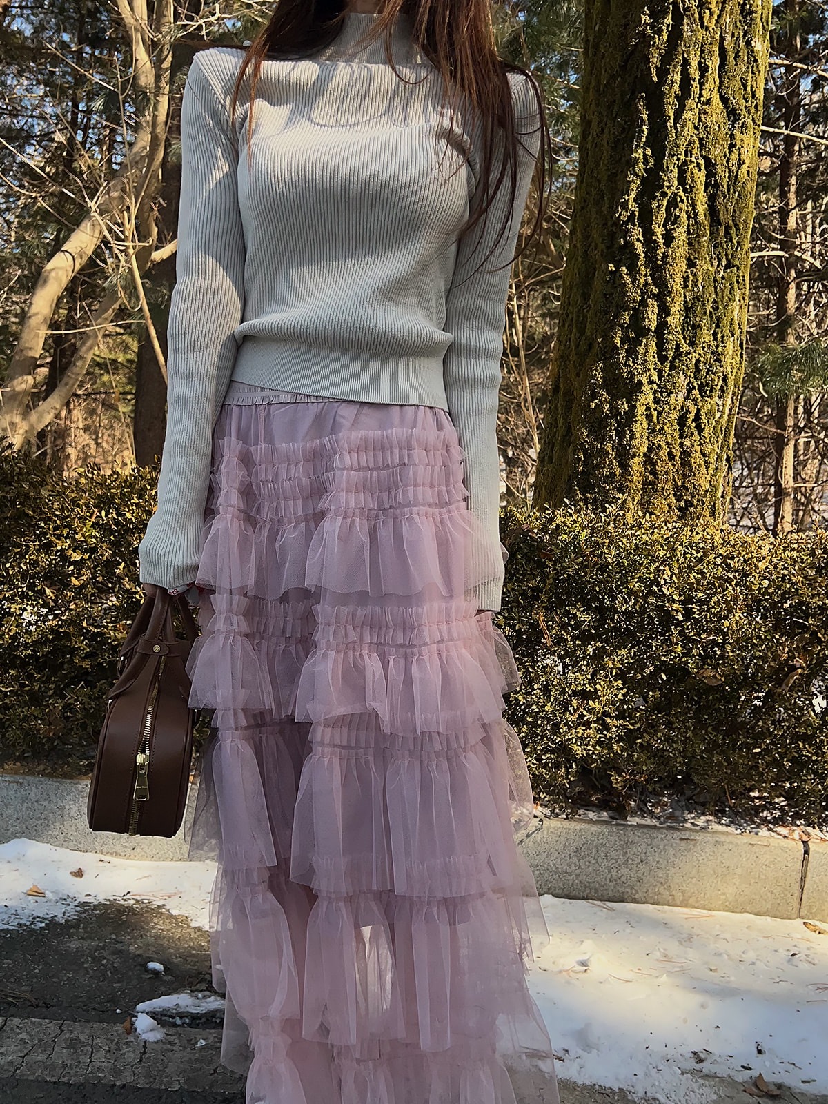 한국 세련된 여름 달콤한 기질 하이 웨이스트 다목적 레이어링 메쉬 케이크 스커트 여성용 롱 스커트