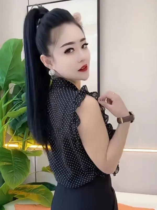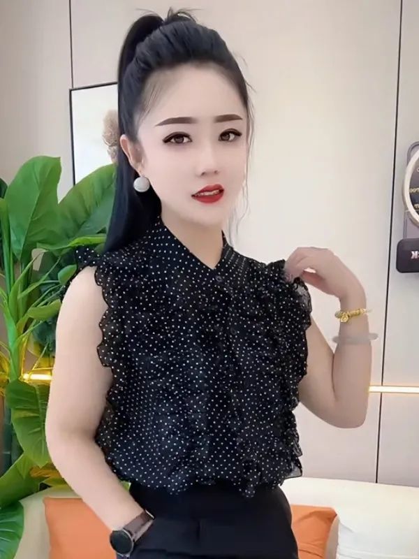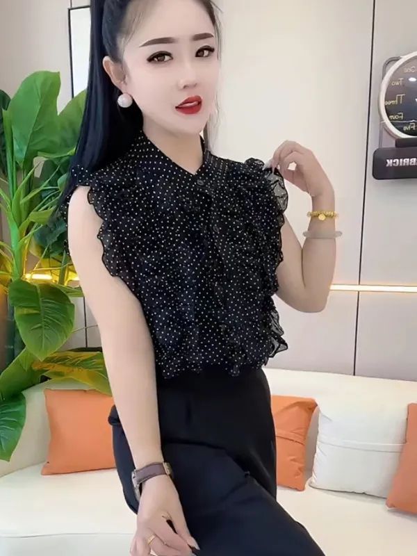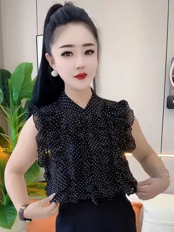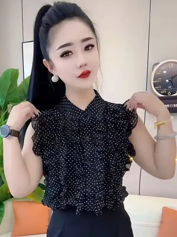 올 여름 신상 도트무늬 쉬폰 프린트 귀 디자인 여성용 다용도 스탠드 칼라 러플 플라잉 슬리브 셔츠스토어 가기
