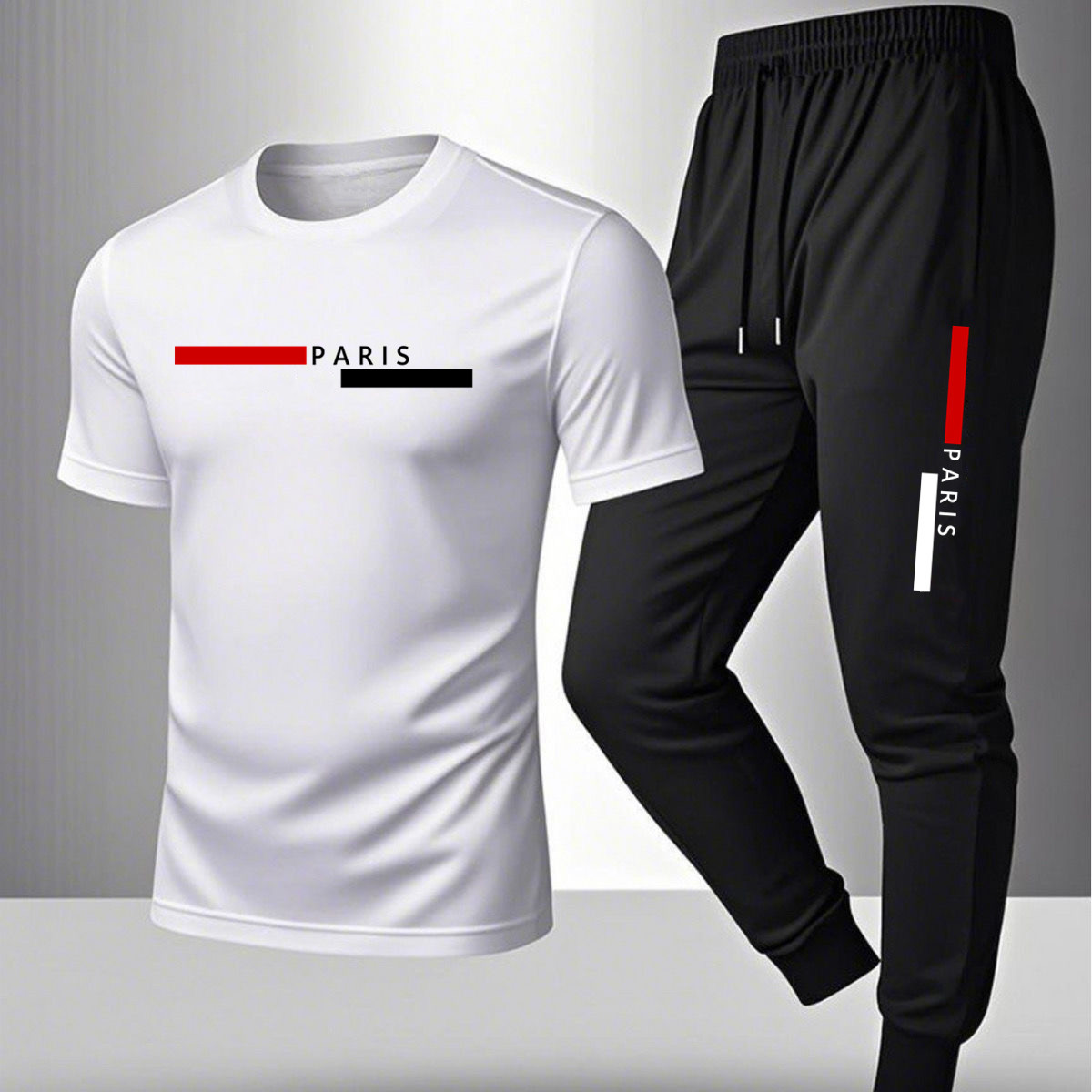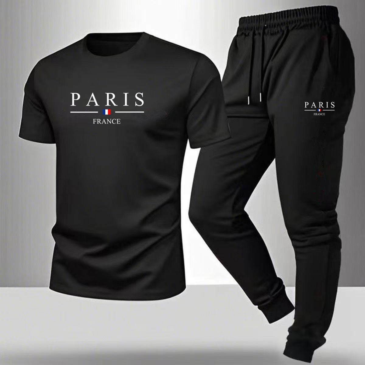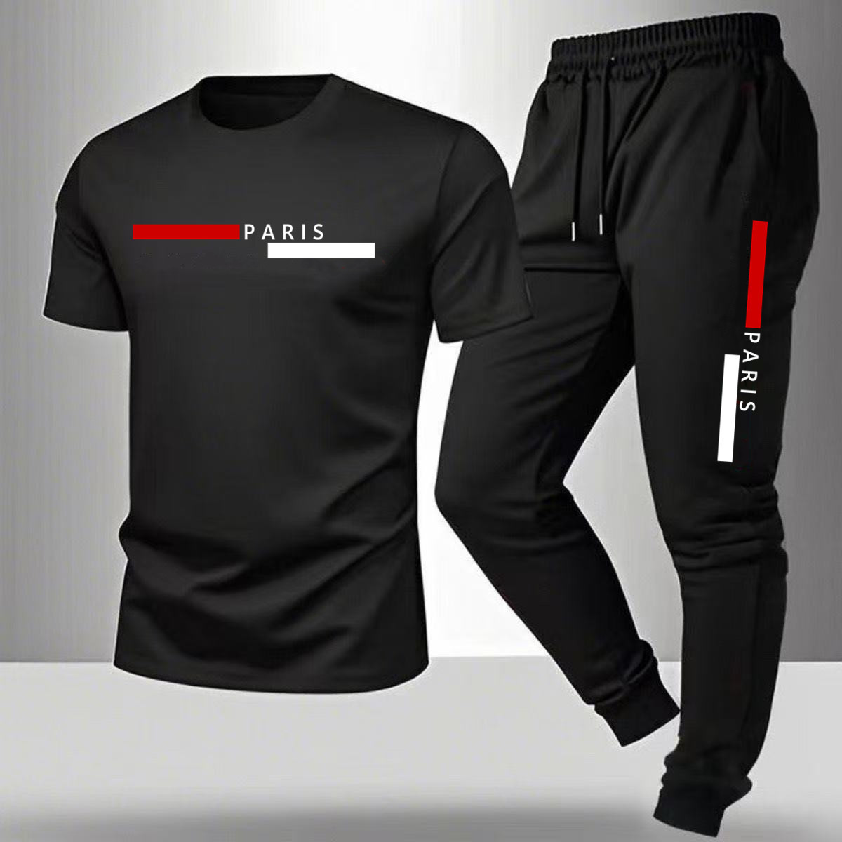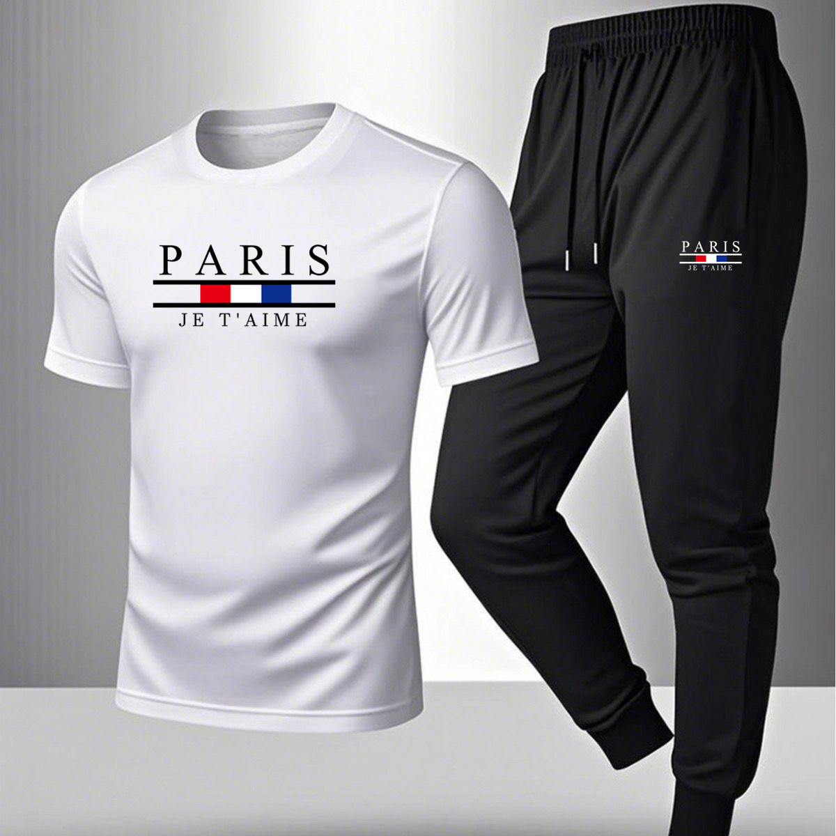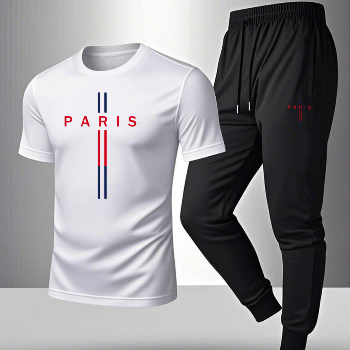 남성 의류 여름 캐주얼 바지 + 반팔 티셔츠 세트 파리 PARIS 프린트 투피스 세트 남성 스포츠 슈트스토어 가기
