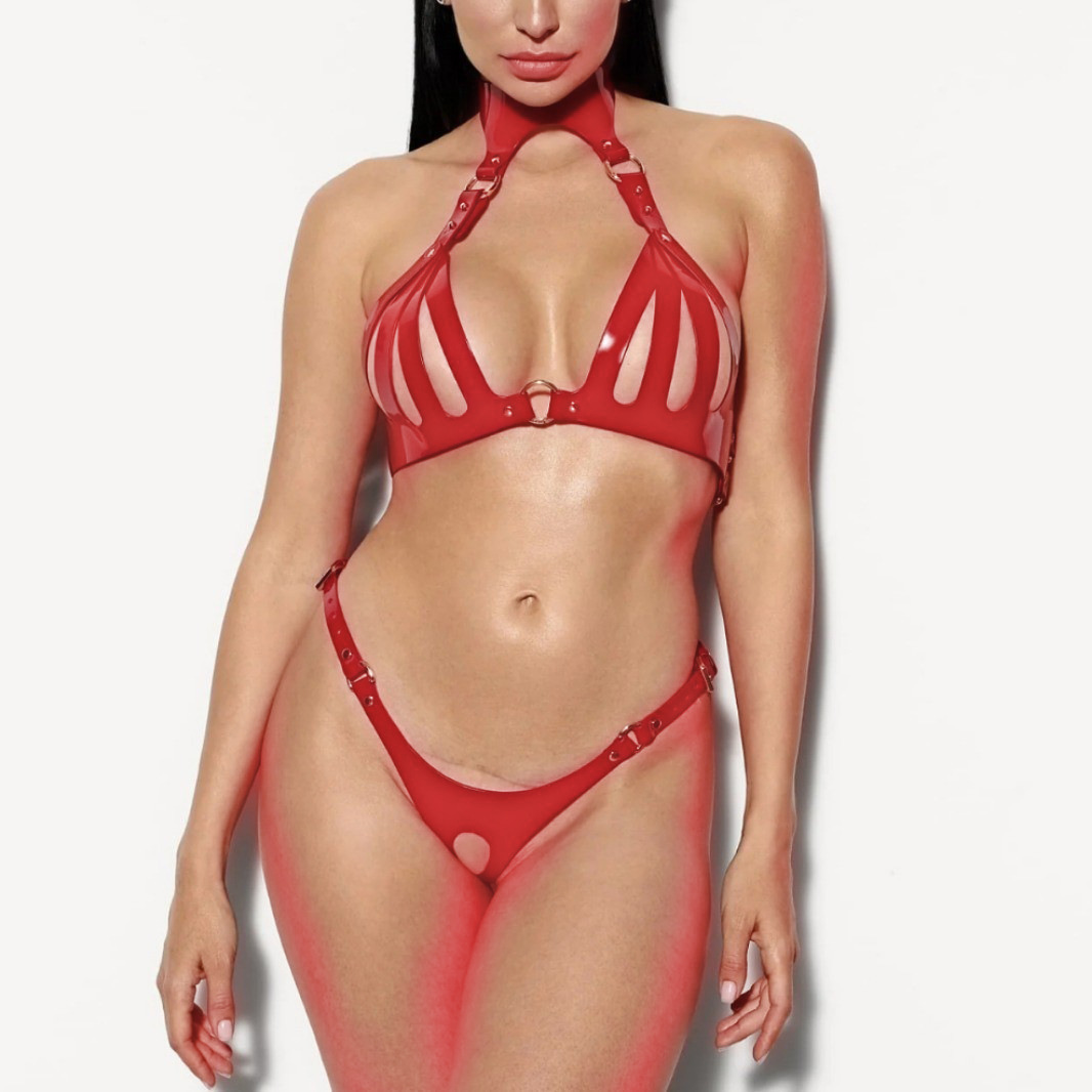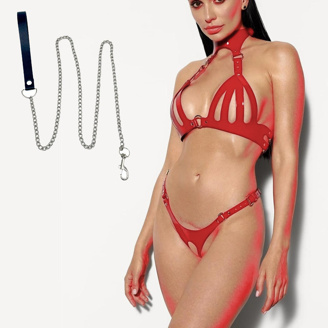 • 가죽 속박 의류 밝은 빨간색 정장 + 가죽 끈