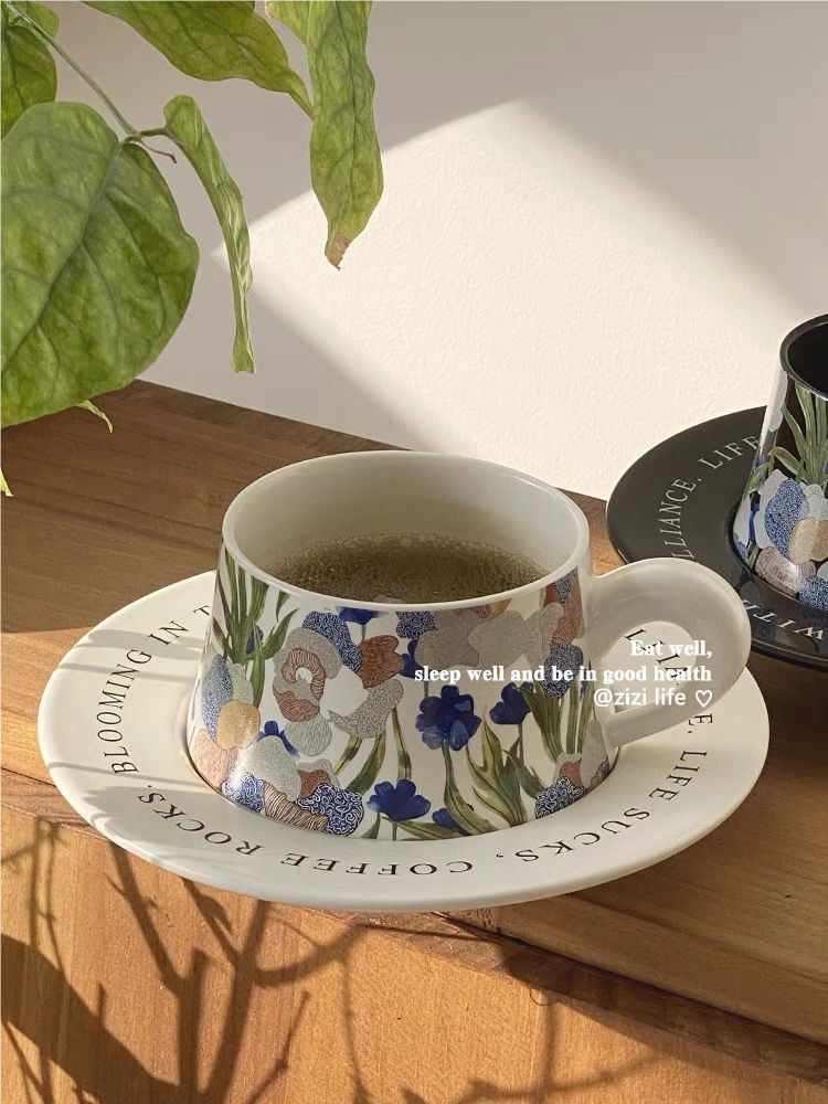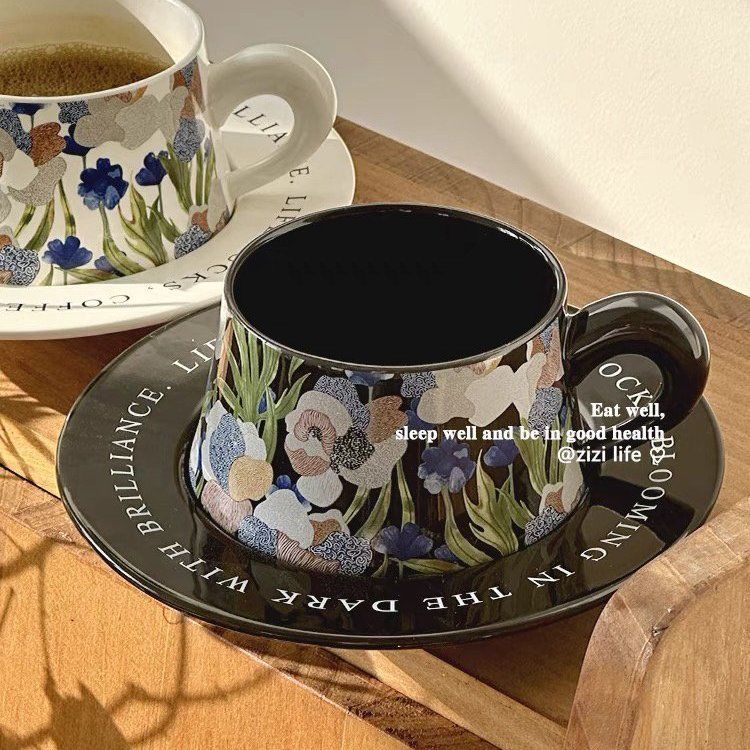 • 유화 같은 아이리스 가든 컵과 접시/블랙 프리 스푼