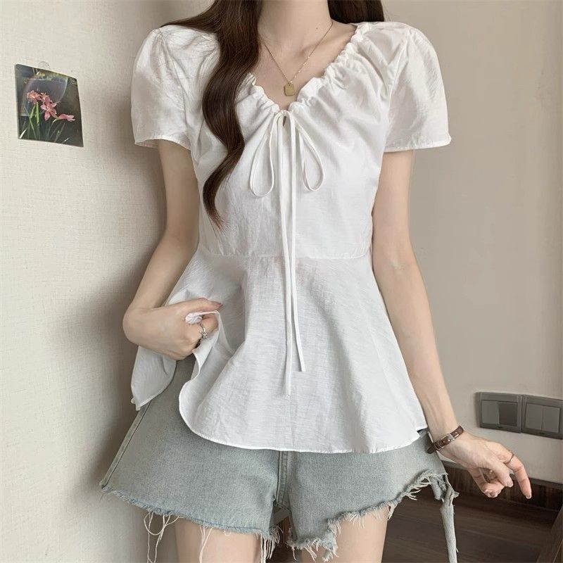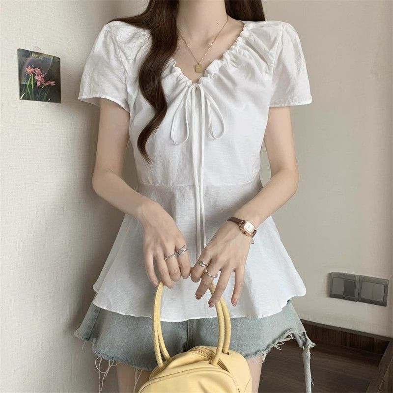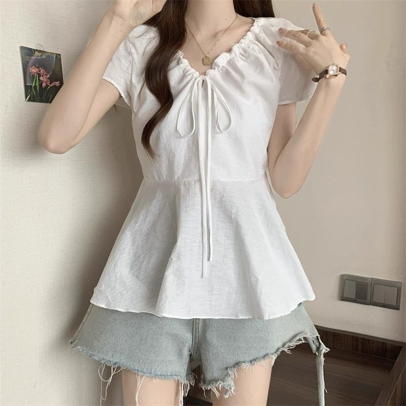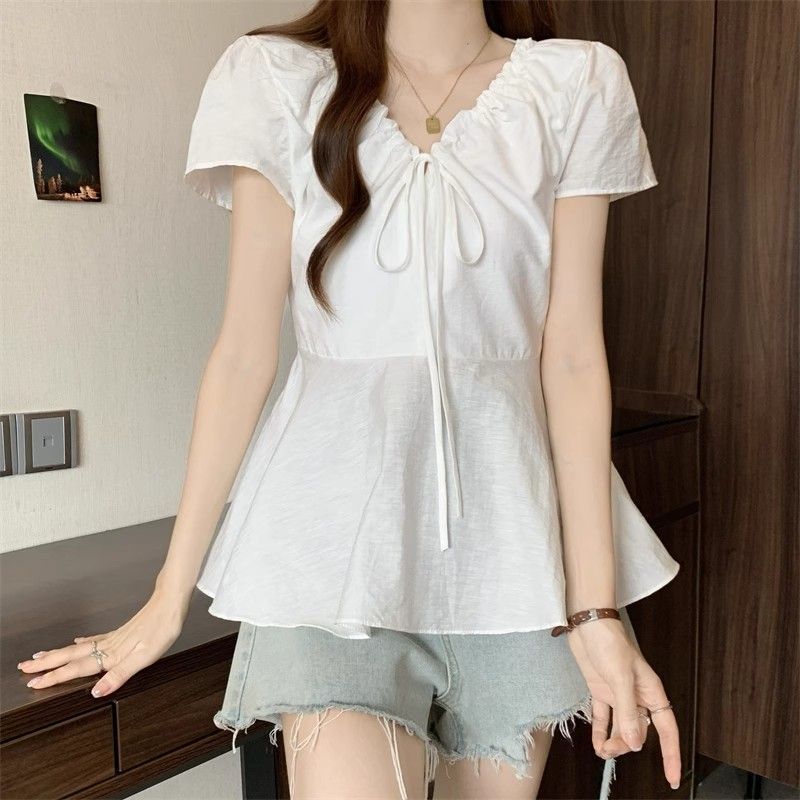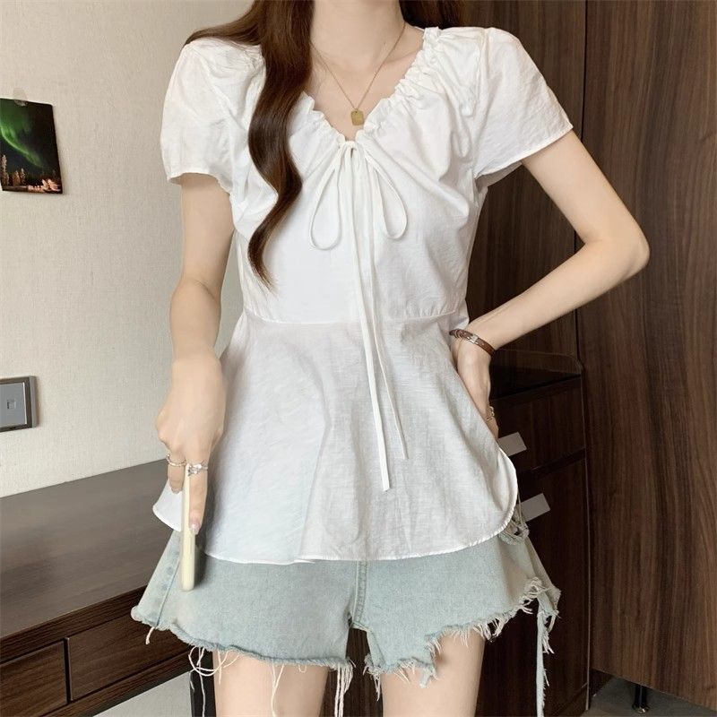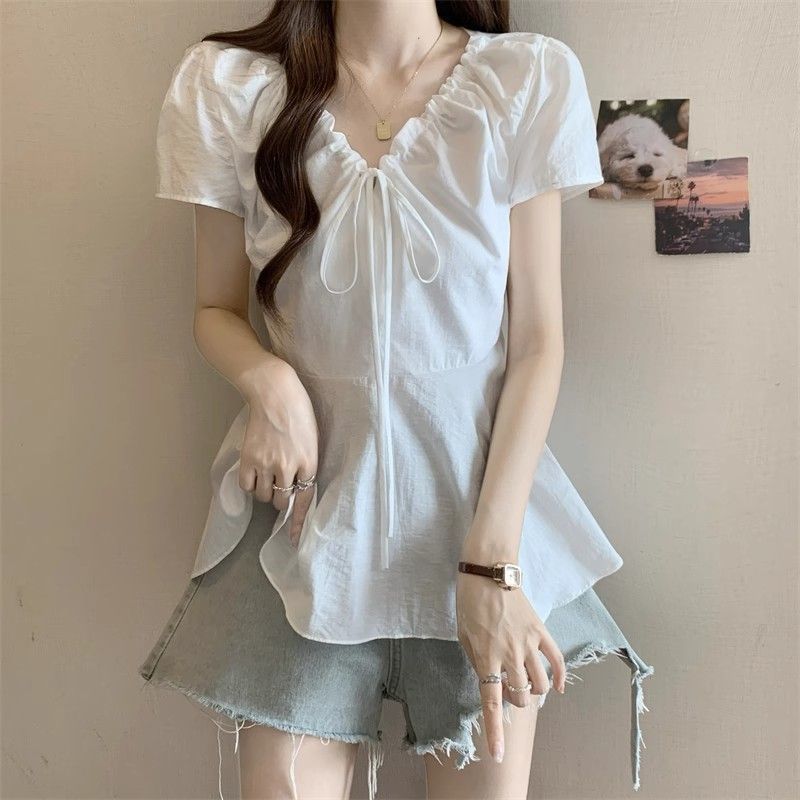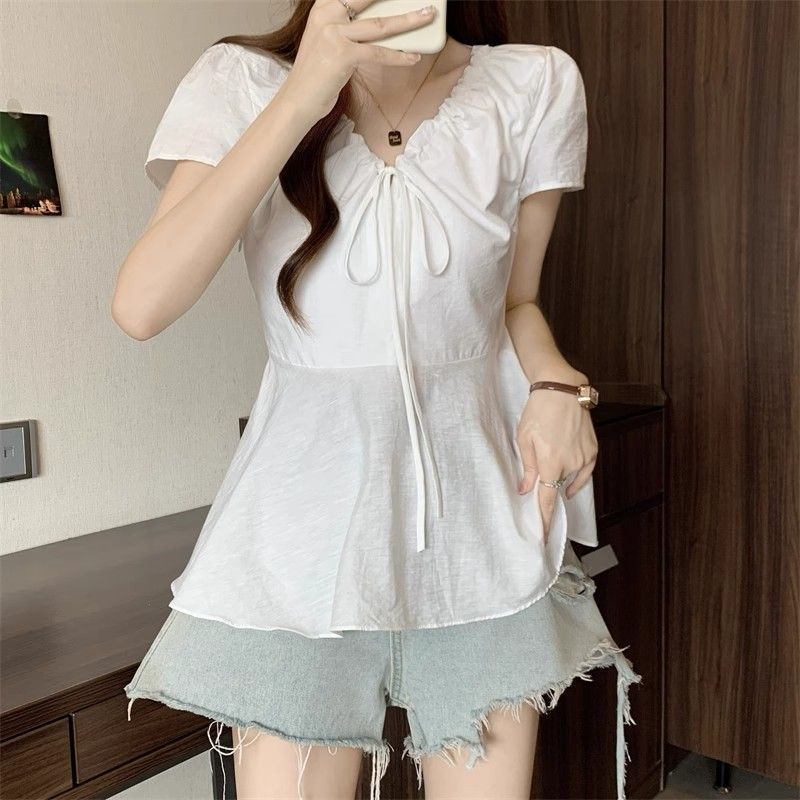 Fat mm Super 100kg v 넥 오른쪽 어깨 반팔 셔츠 여성 2025 여름 대형 허리 슬리밍 인형 셔츠 푹신한 탑스토어 가기