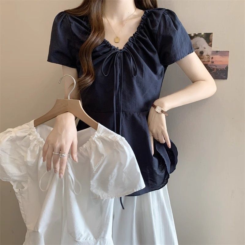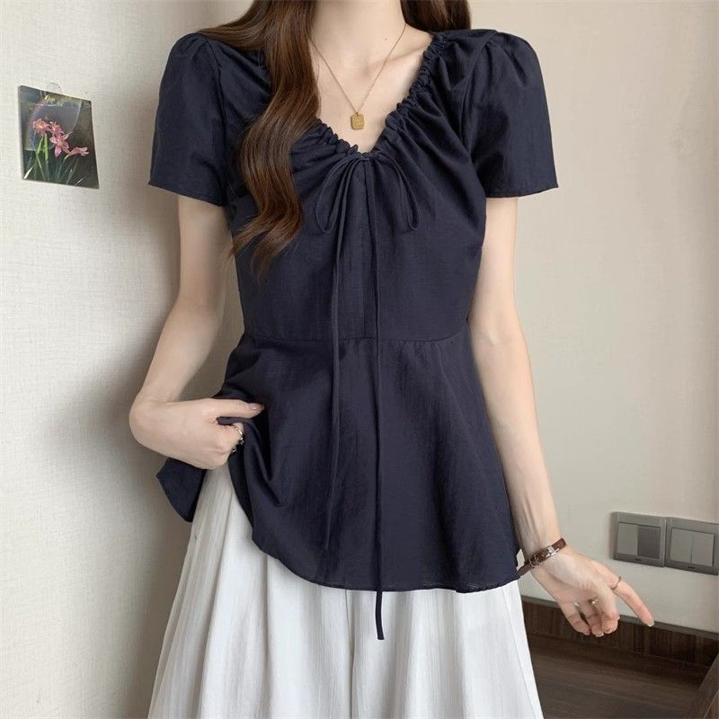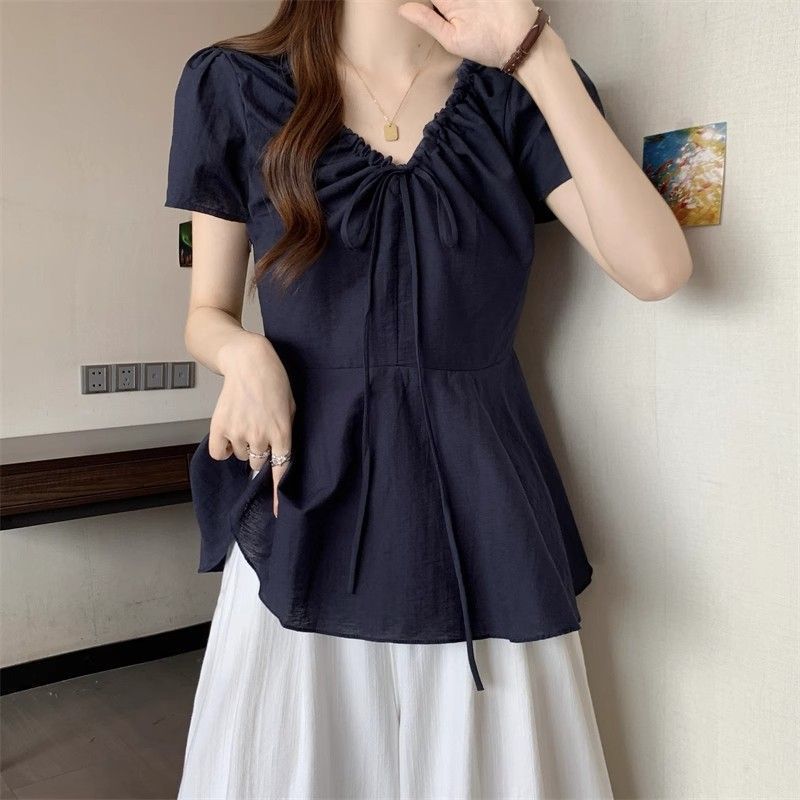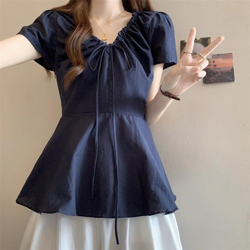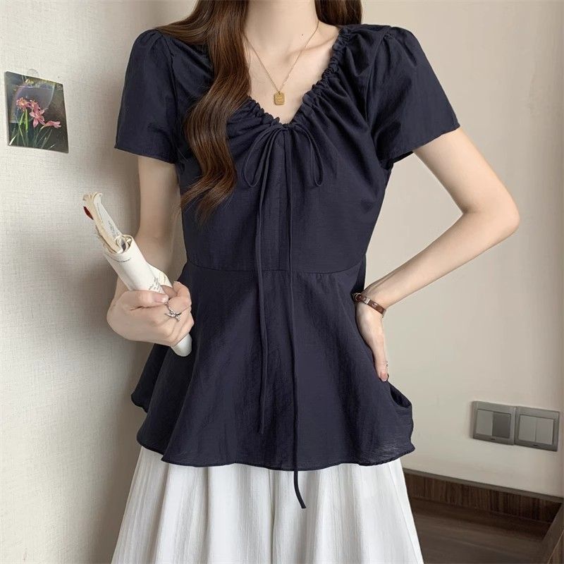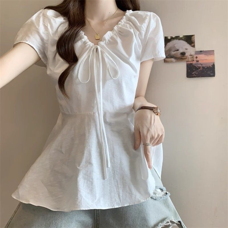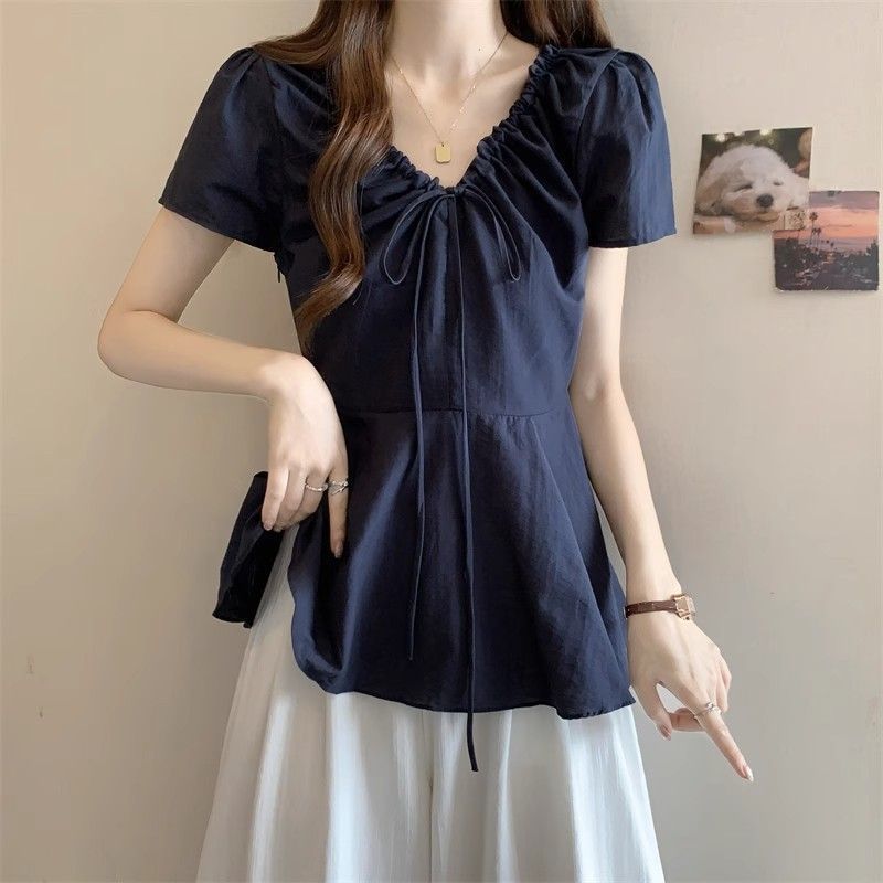 Fat mm Super 100kg v 넥 오른쪽 어깨 반팔 셔츠 여성 2025 여름 대형 허리 슬리밍 인형 셔츠 푹신한 탑스토어 가기
