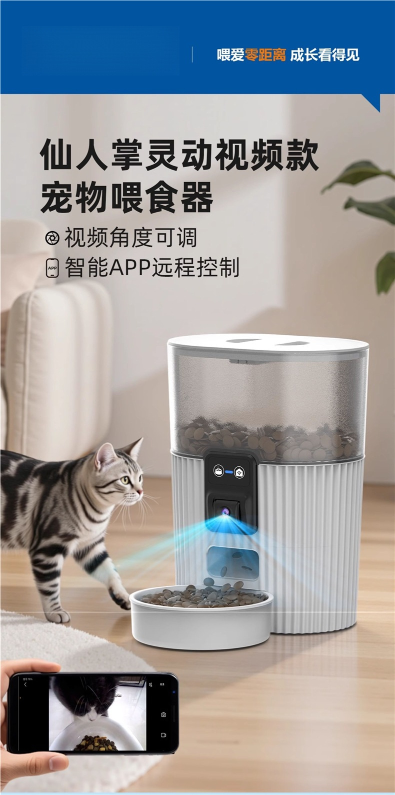 고양이를 위한 자동 애완동물 급식기, 고양이 사료 및 개 사료를 정량화하고 정기적으로 공급하는 기계, 비디오를 이용한 차세대스토어 가기