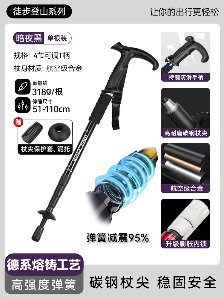 • 4단 텔레스코픽 [독일 주조 스프링] 탄소강 팁, 안정적이고 미끄럼 방지 - 직선 핸들 검정색