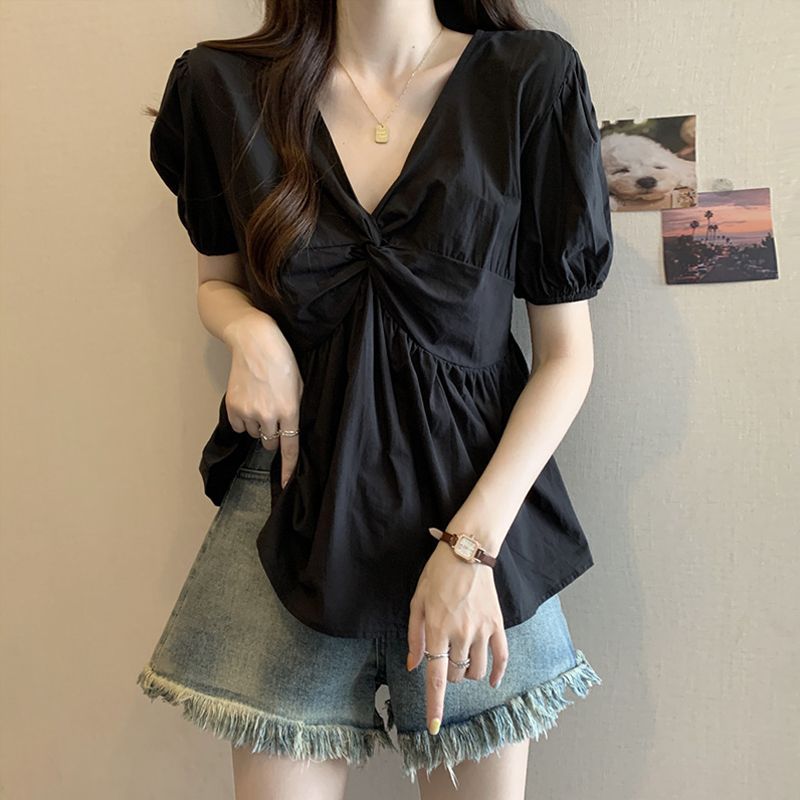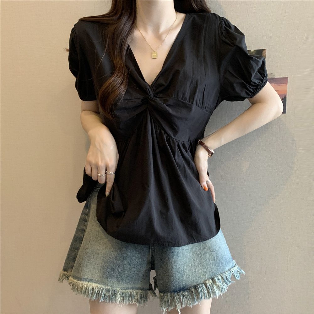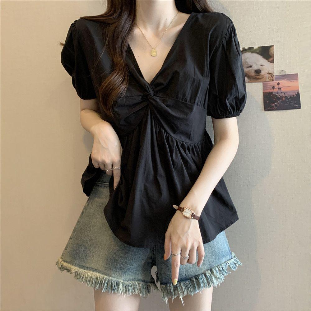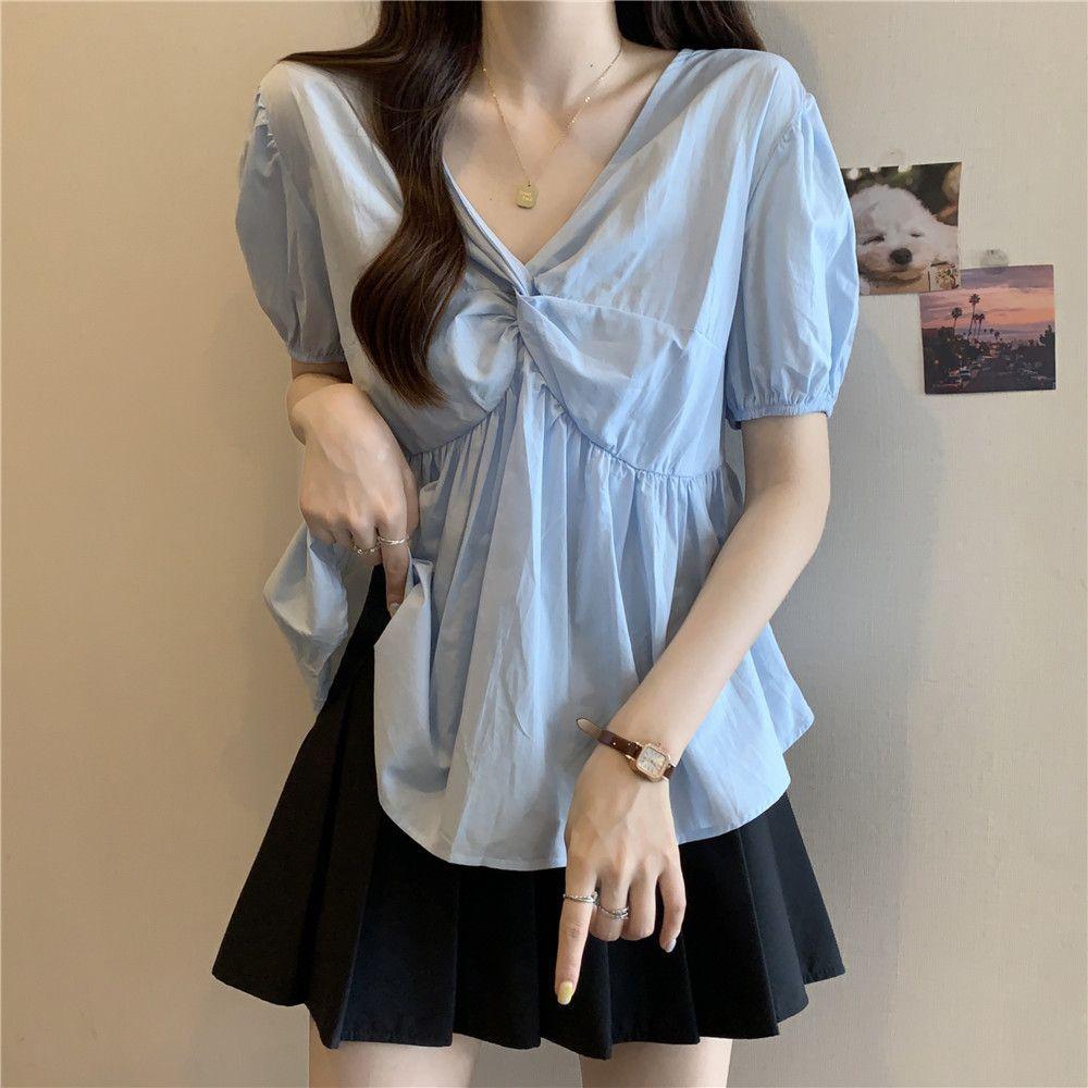 플러스 사이즈 여성복 배를 덮는 퍼프 슬리브 브이넥 반팔 셔츠 여름 뚱녀 슬리밍 쉬폰 탑스토어 가기