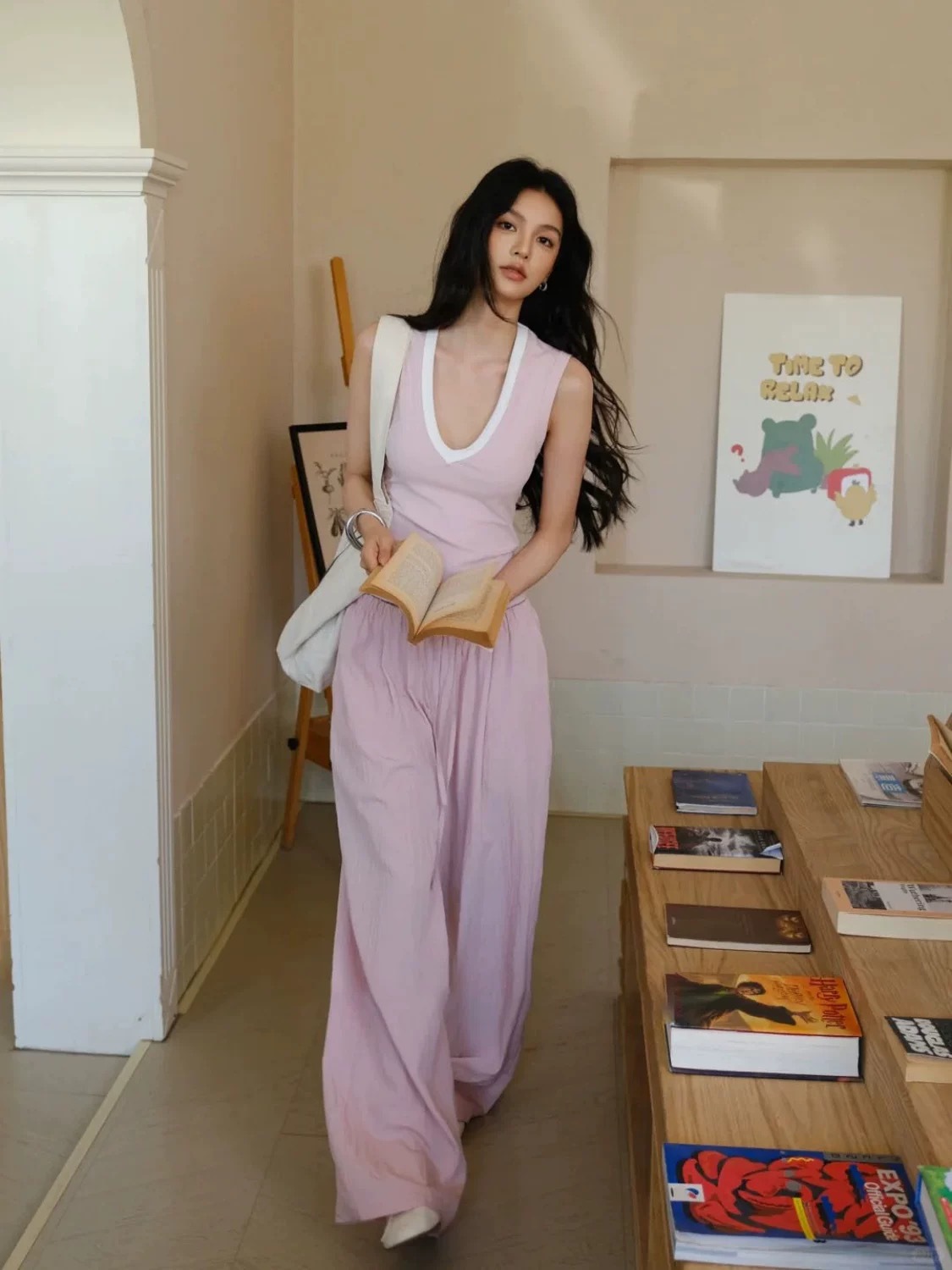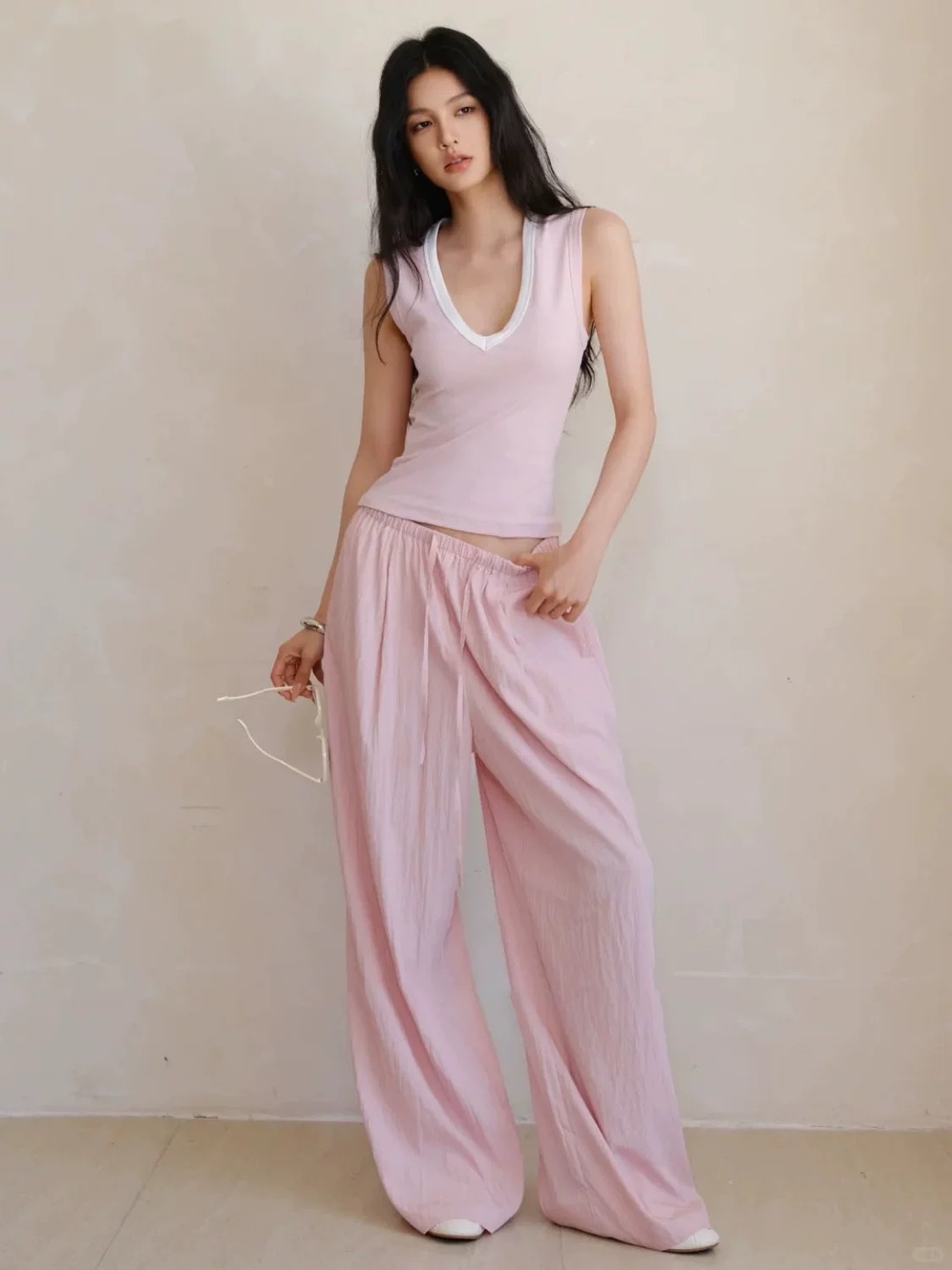 여름 여성 2025 새로운 한국 스타일 편안한 컬러 매칭 V 넥 민소매 조끼 드레이프 루즈 스트레이트 캐주얼 바지 세트