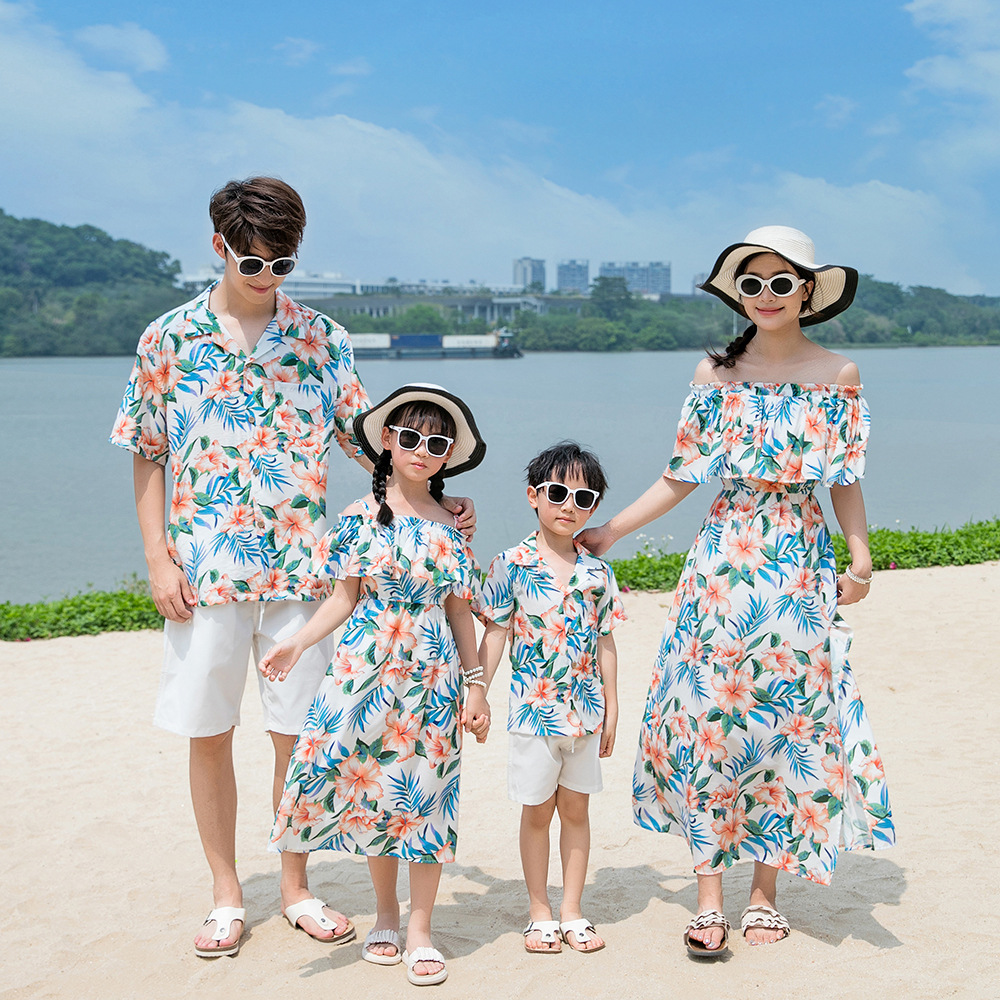 25가지 새로운 부모-자식 의류, 가족 휴가 해변 의류, 커플 의류, 엄마와 딸 스커트, 아버지와 아들 셔츠, 여성 해변 프린트스토어 가기