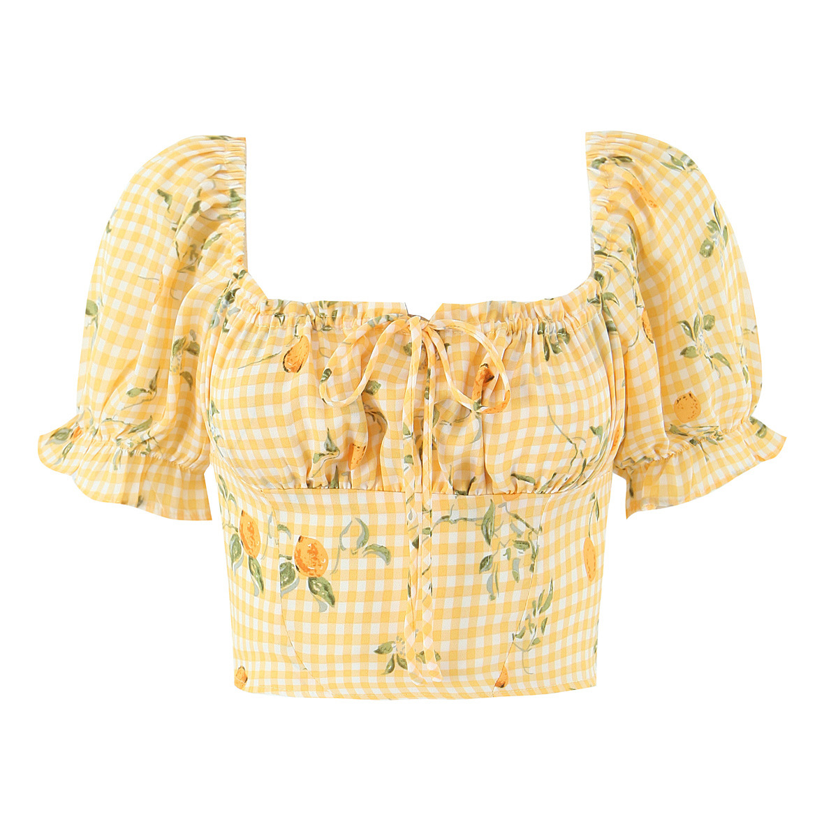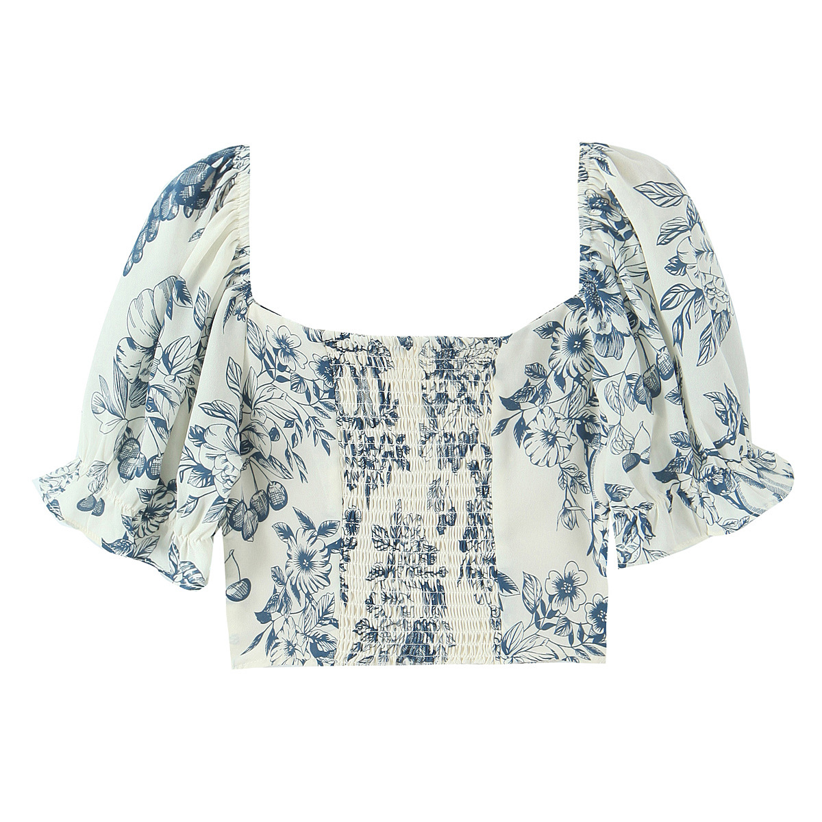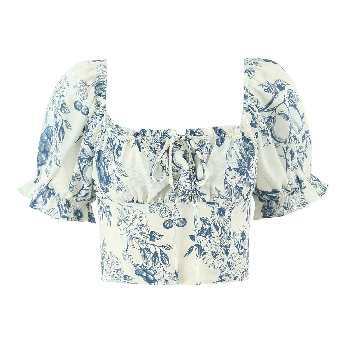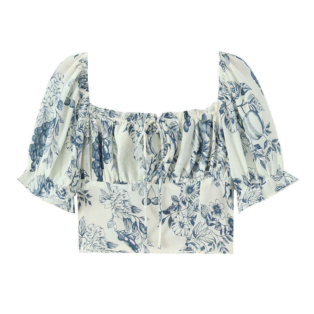 프렌치 레트로 스퀘어 넥 꽃무늬 레이스 업 슬림 반소매 쉬폰 셔츠 여름 여성 짧은 기질 다용도 탑