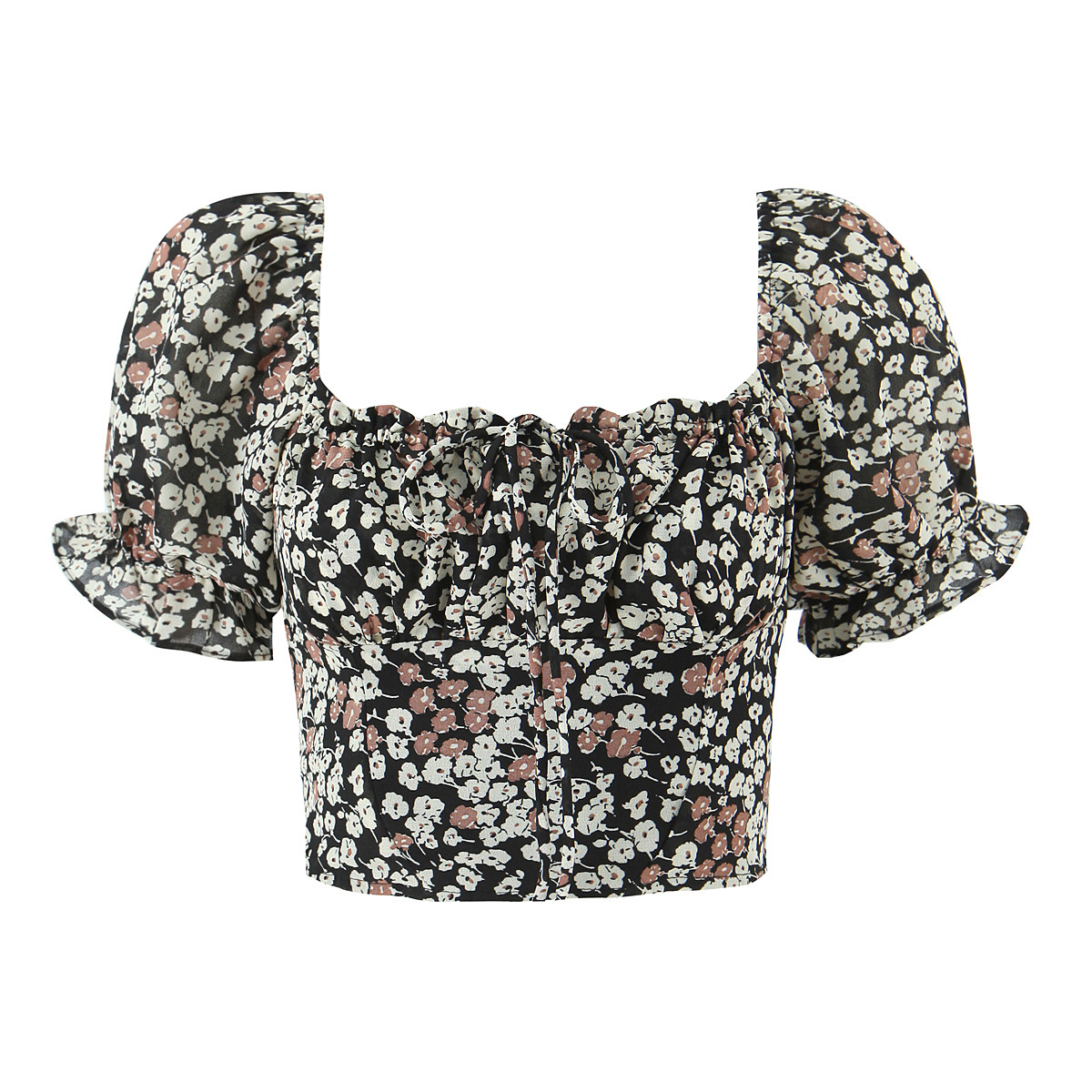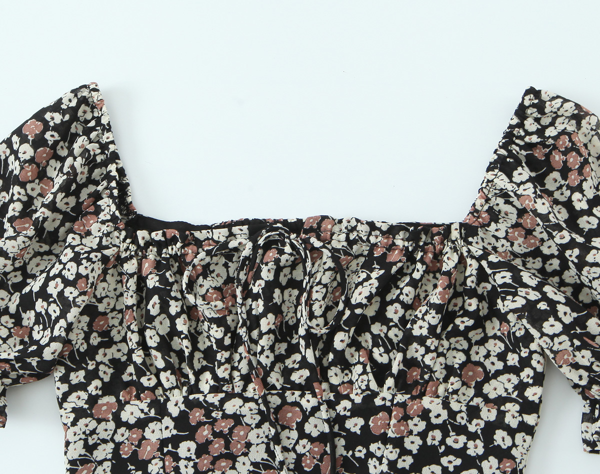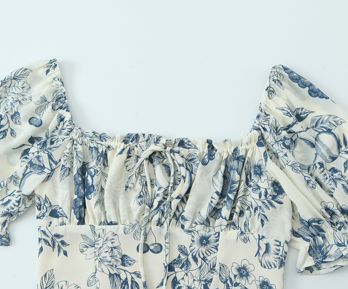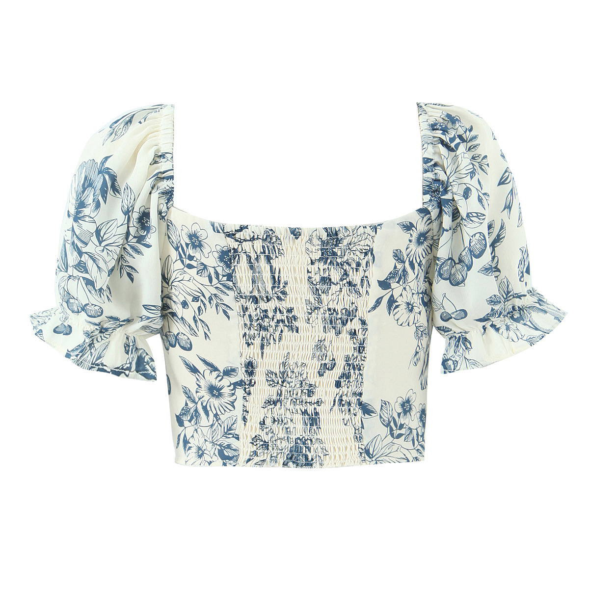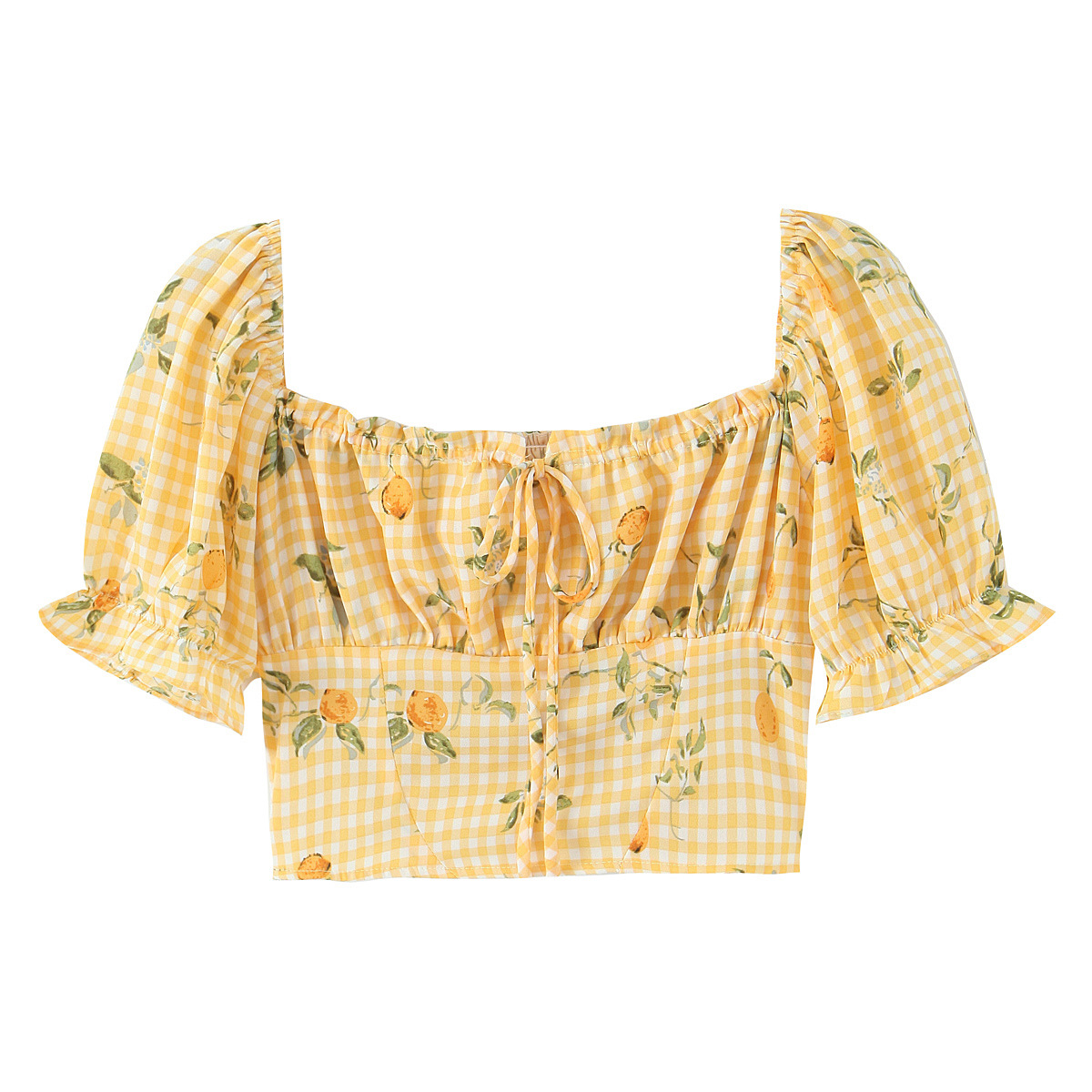 프렌치 레트로 스퀘어 넥 꽃무늬 레이스 업 슬림 반소매 쉬폰 셔츠 여름 여성 짧은 기질 다용도 탑