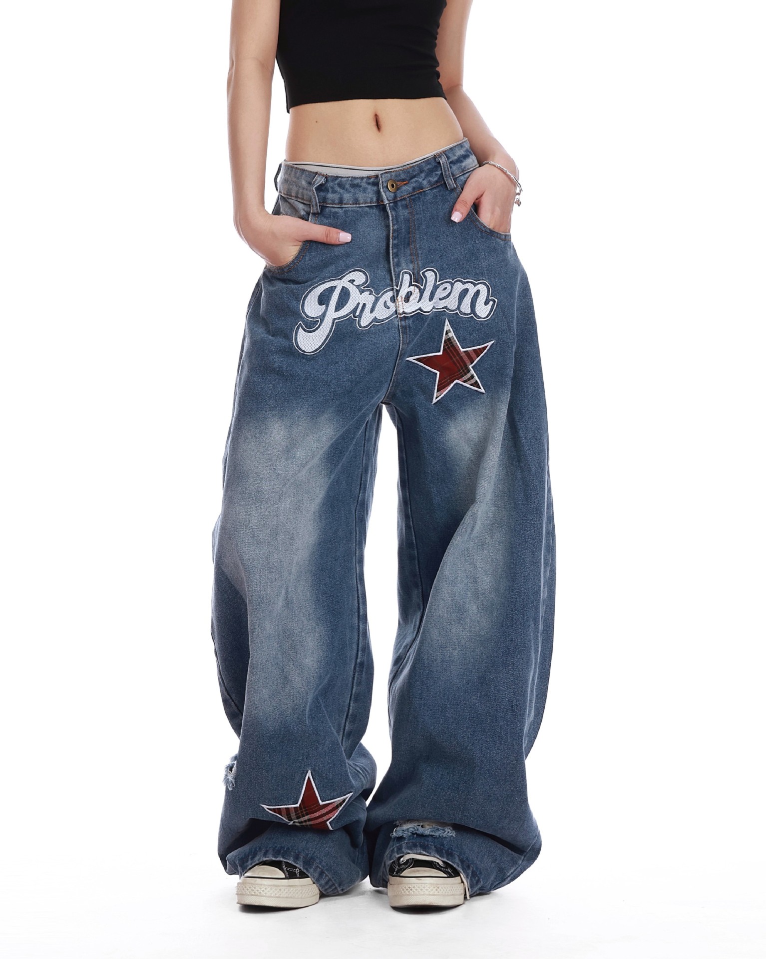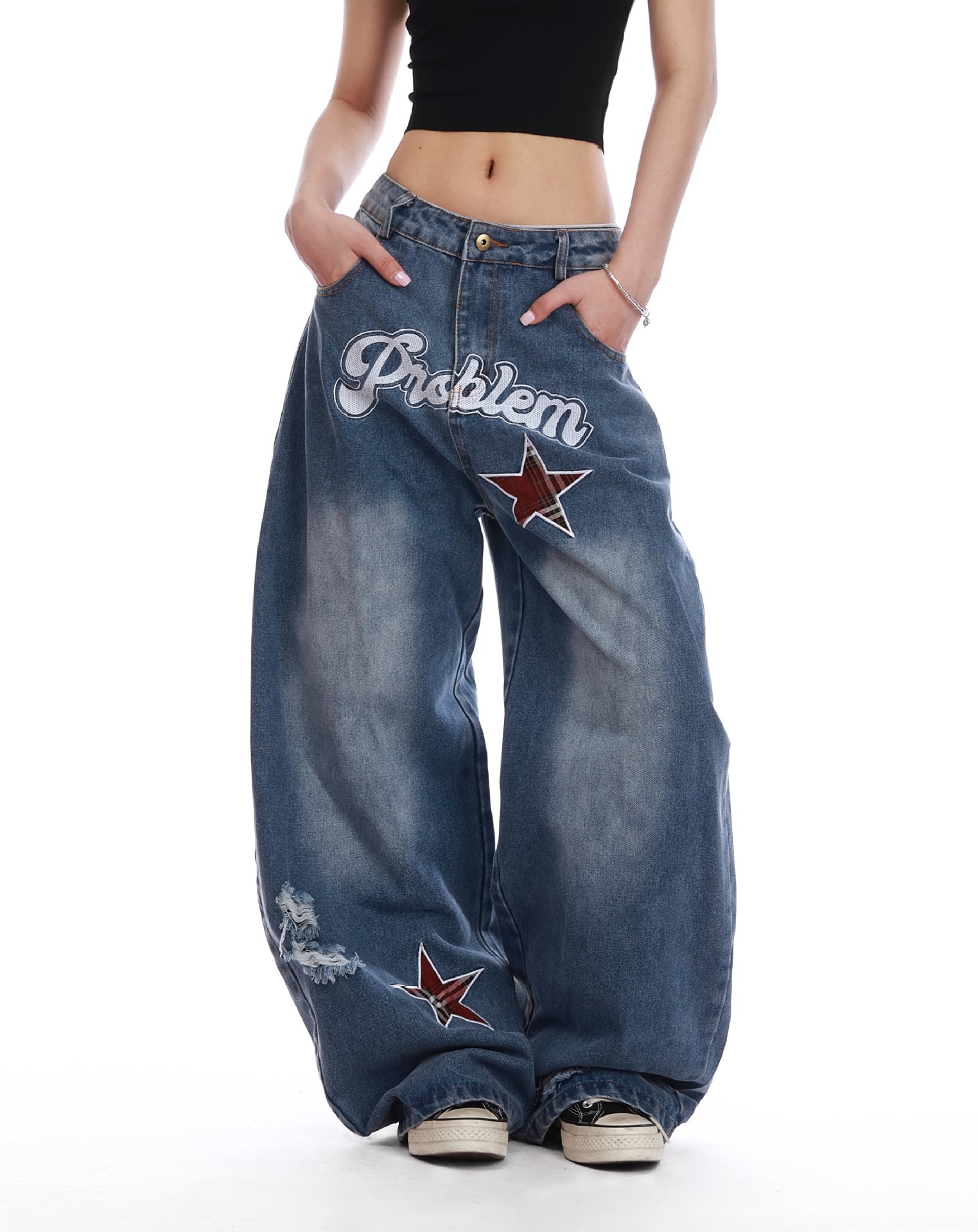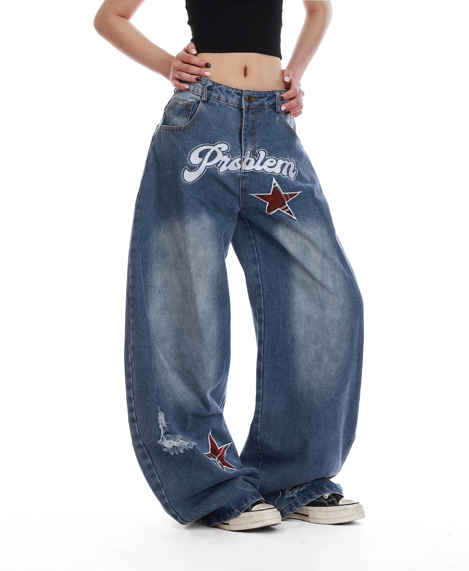 여성을위한 미국 복고풍 하이 스트리트 스타 자수 청바지 여름 새로운 느슨한 캐주얼 칼 칼바닥 바지 여성 바닥 길이 바지스토어 가기