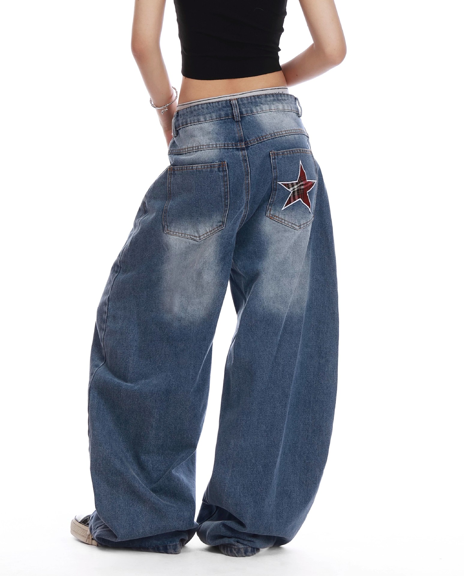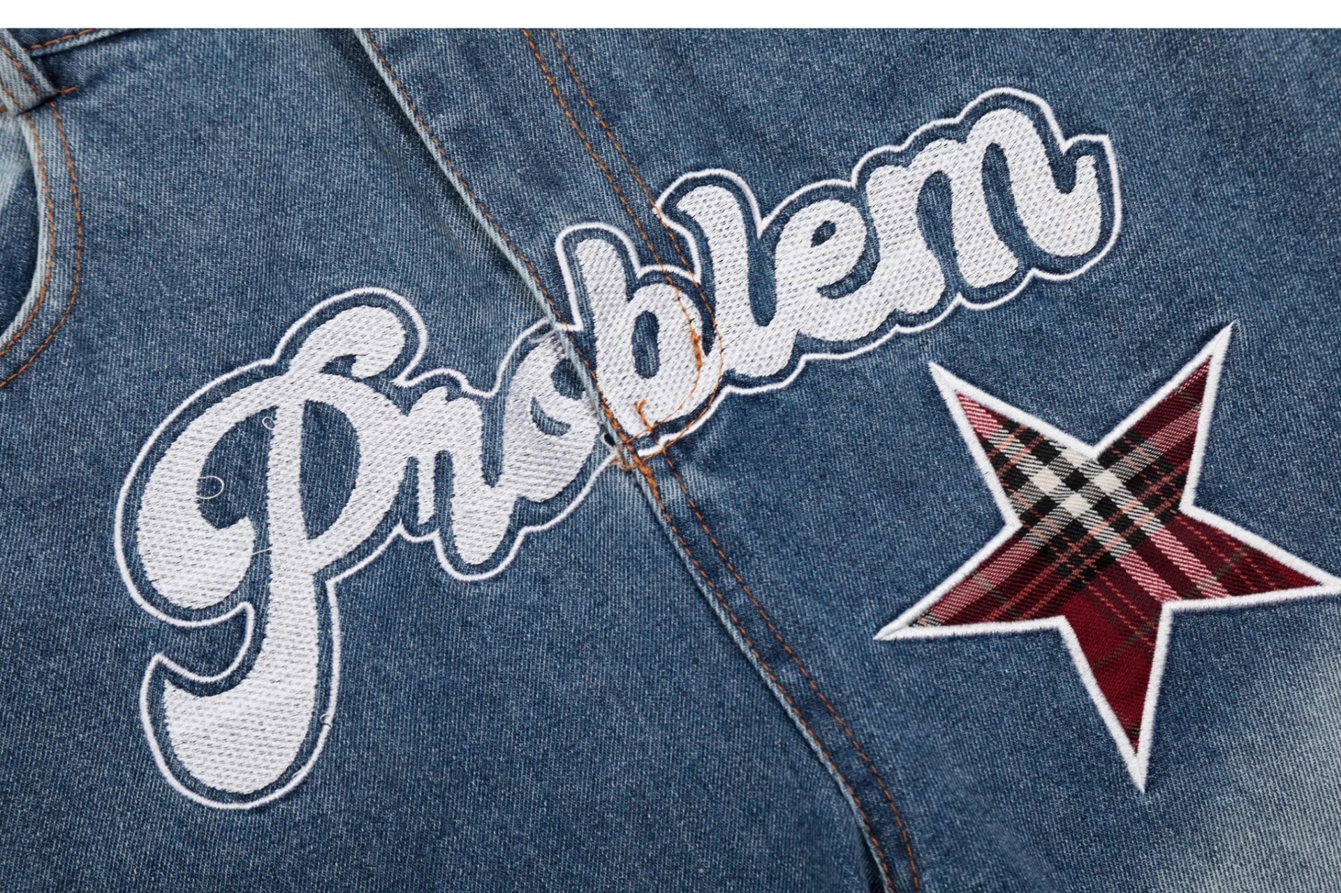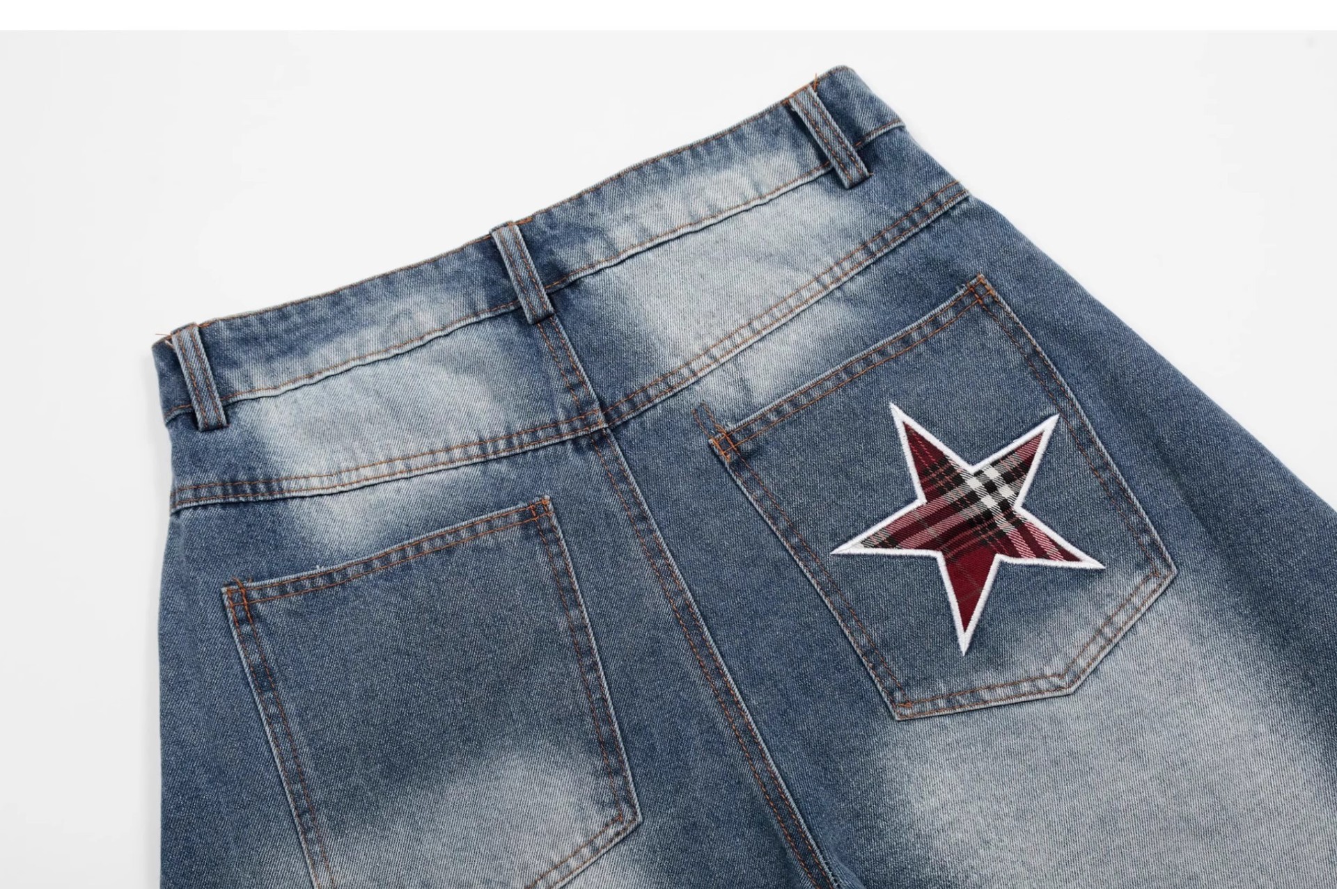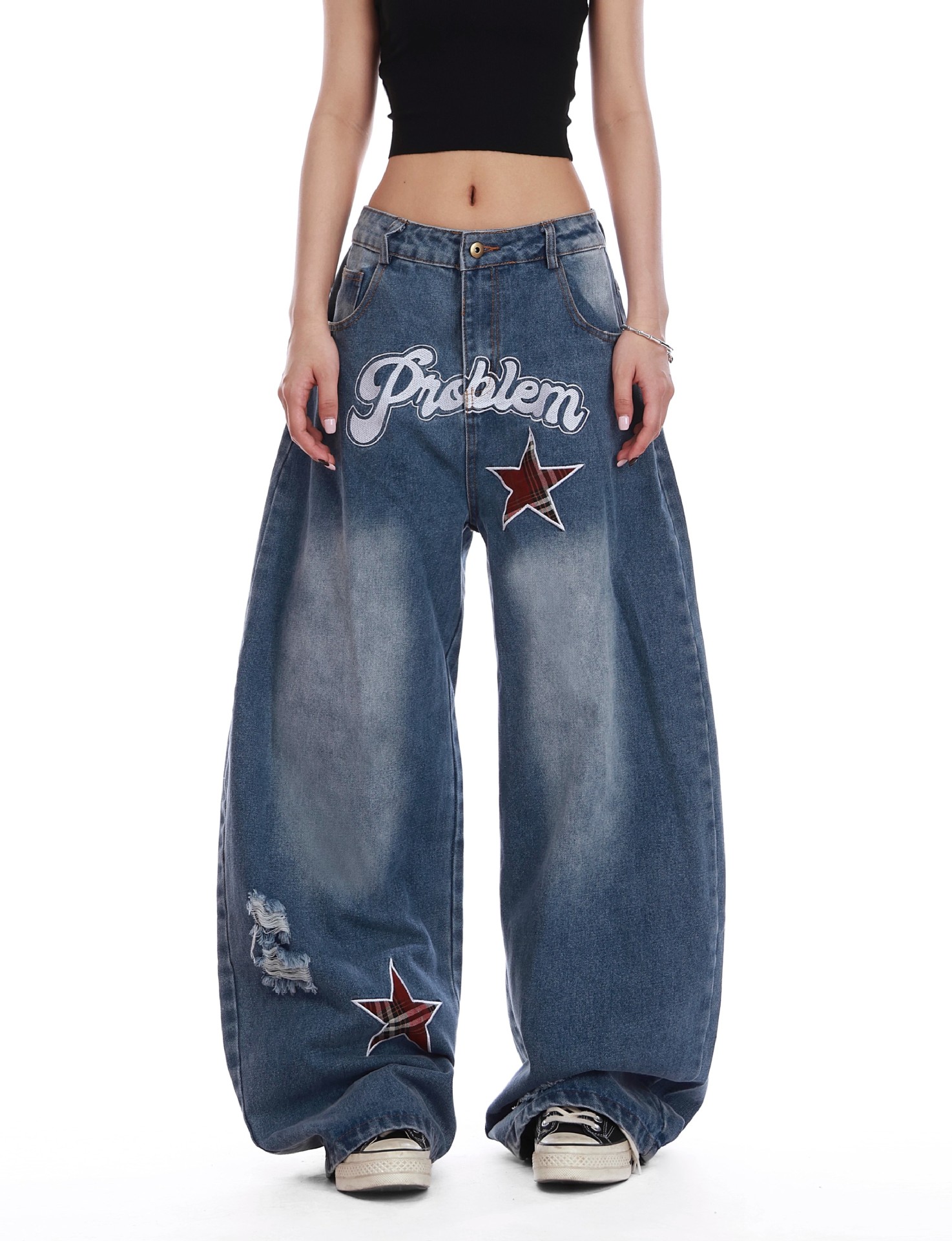 여성을위한 미국 복고풍 하이 스트리트 스타 자수 청바지 여름 새로운 느슨한 캐주얼 칼 칼바닥 바지 여성 바닥 길이 바지스토어 가기