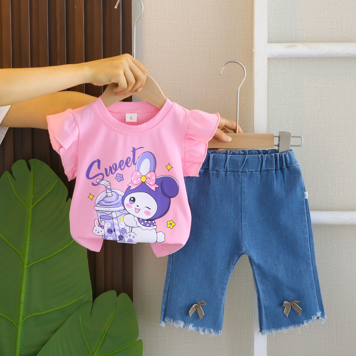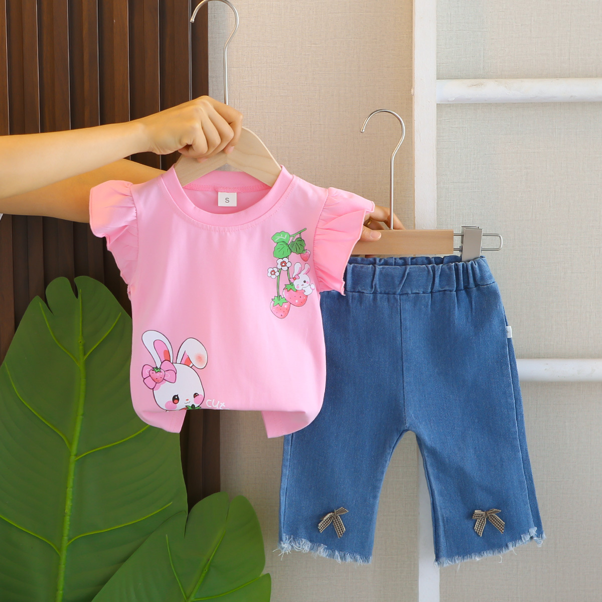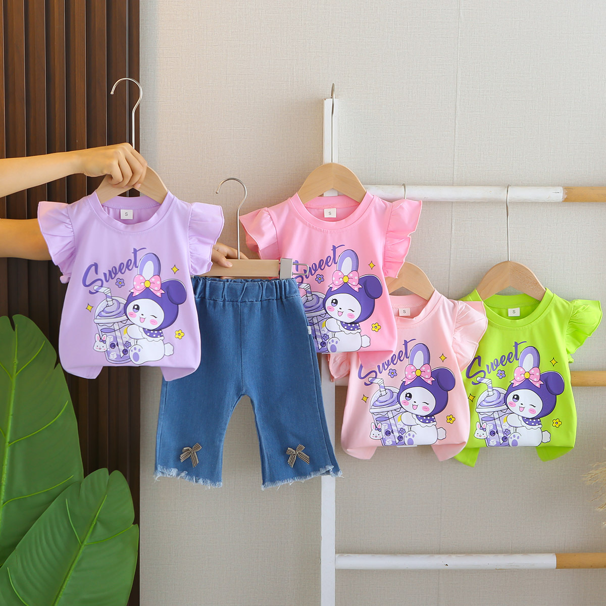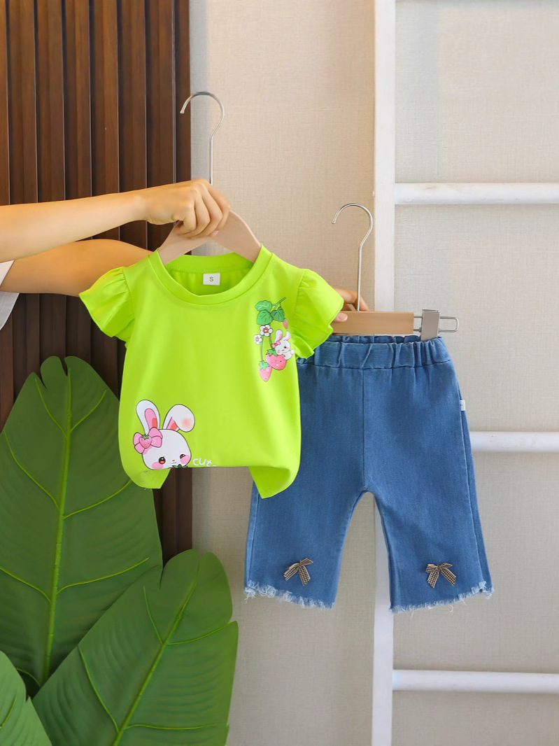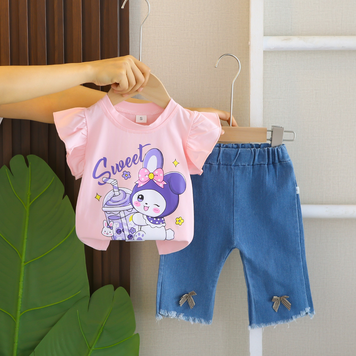 여자 2025 패션 트렌드 새로운 정장 만화 반팔 여름 토끼 정장 어린이 티셔츠 한국 스타일 코튼스토어 가기